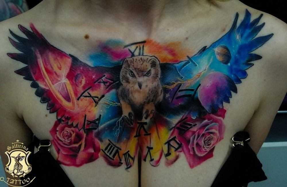 Если филина изображают на груди в большом и реалистичном формате, тем самым мужчина показывает свою любовь к жизни, жажду добиваться новых целей, мечты о долголетии, индивидуальный подход к любому решению и действию. Также многие изображают тату на груди, связывая смысл с сердечными делами и любовью.