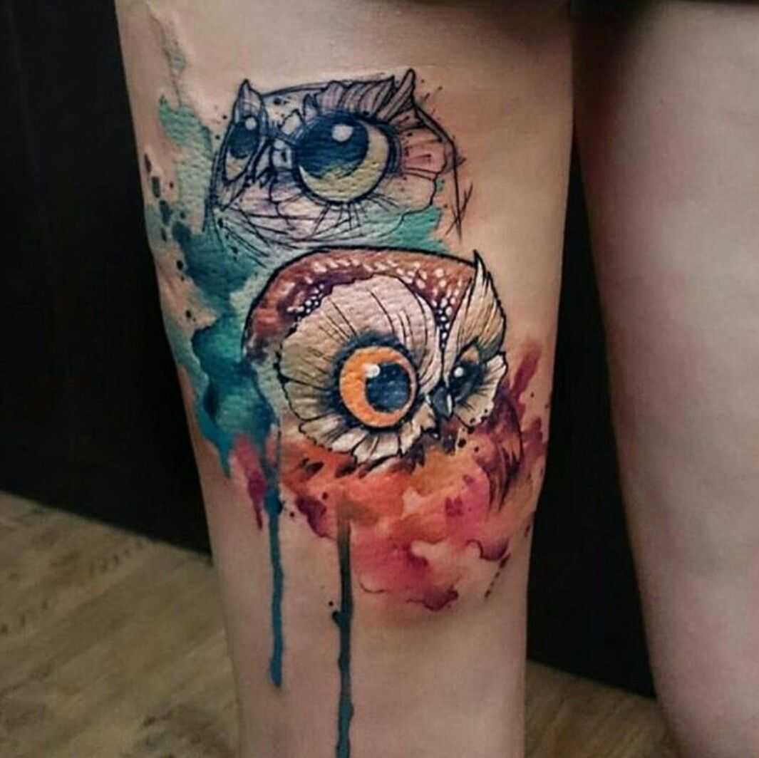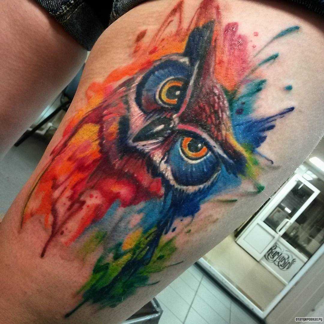 Татуировки, выполненные в стиле акварель, получаются не брутальными. Размытые краски и линии сами по себе несут романтический, спокойный или таинственный настрой. Так, общее значение татуировки в виде совы, выполненной в акварельном стиле, указывает на глубокий ум обладателя рисунка, а также его любовь к таинственному аспекту мира.