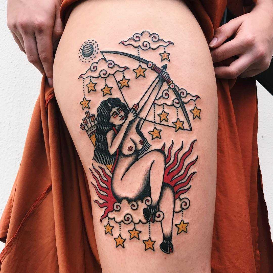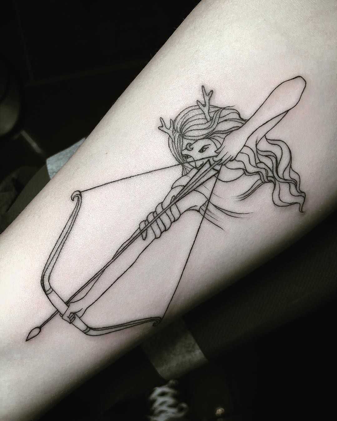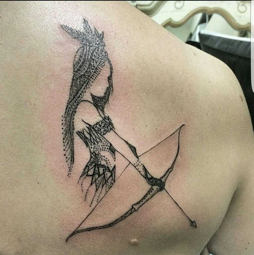 Прекрасные дамы также наносят на своё тело изображение этого знака зодиака, что позволяет подчеркнуть характер и жизненные стремления барышни. Для рождённых под созвездием Стрельца, изображение может квалифицироваться как амулет, которые нивелирует отрицательные черты своей хозяйки и усиливает лучшие внутренние качества. Дамы с такой татуировкой представляют собой цельную натуру, открыто стремящуюся к саморазвитию и высоким целям. Женским вариантом татуировки Стрельца является образ Артемиды или аккуратные эскизы с очертанием стрел или созвездий. Также, часто, образ Стрельца в женских тату оригинально дополняется флористикой и другими деталями.