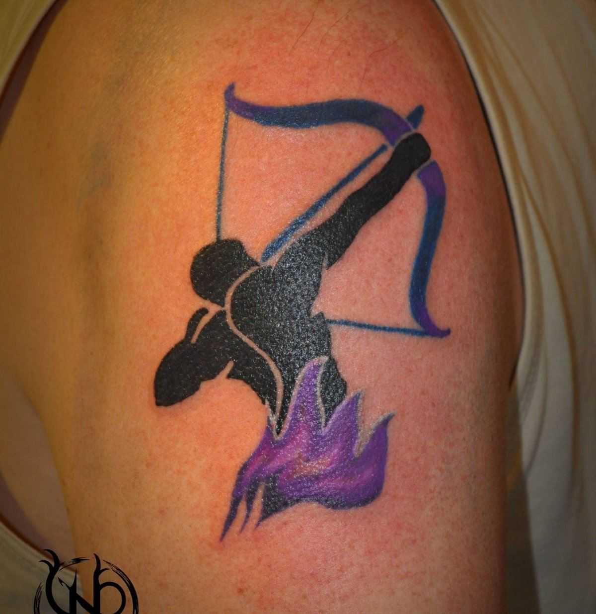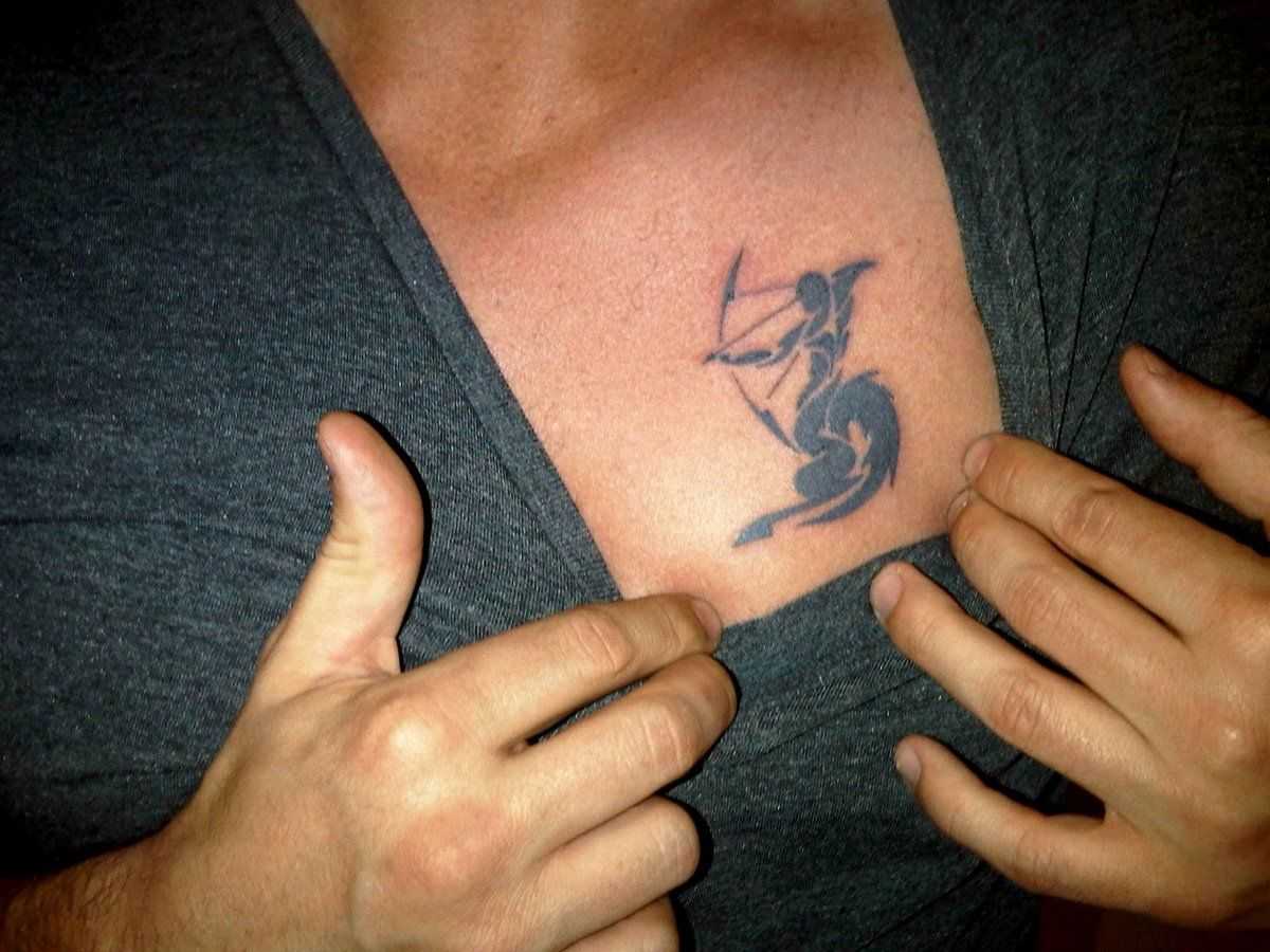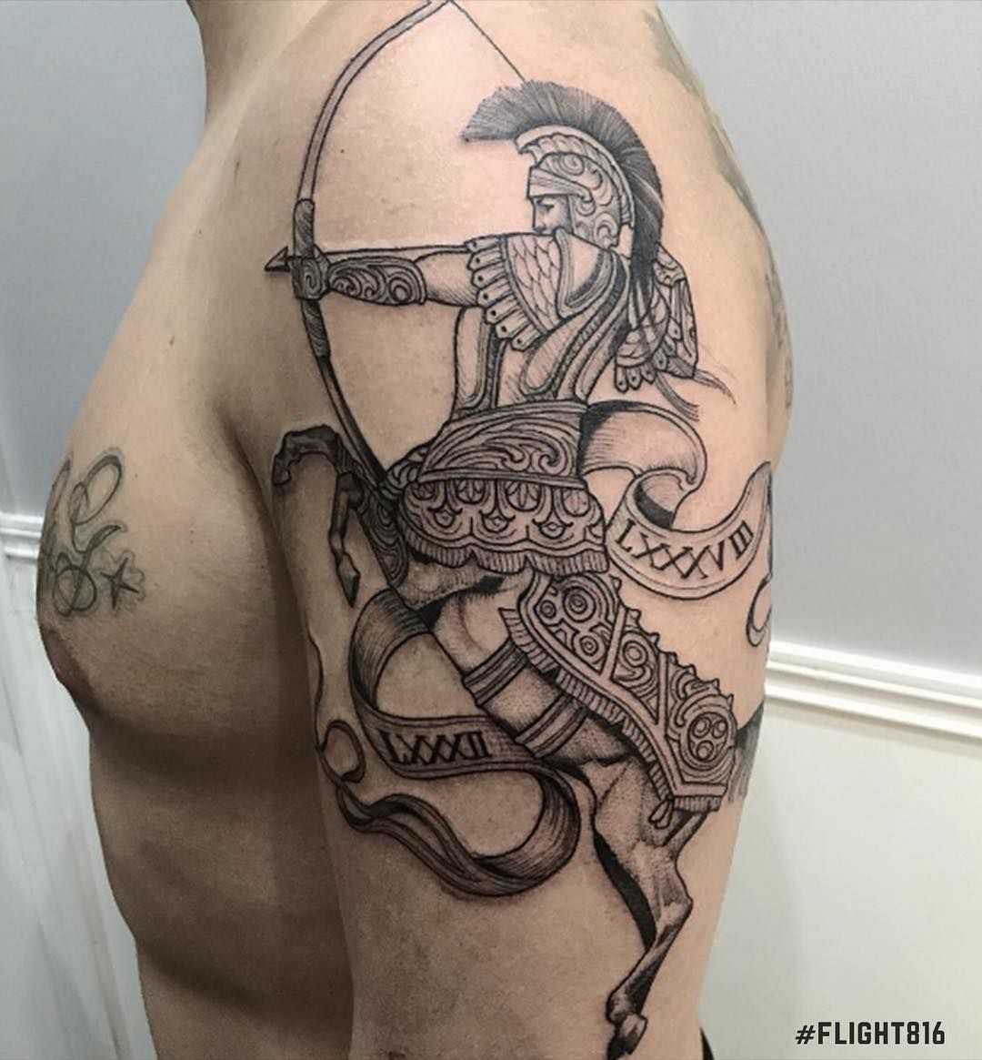 Для наколки татуировки знака зодиака Стрелец мужчины выбирают разные участки тела. Чтобы подкрепиться силой и стойкостью подходит плечо.