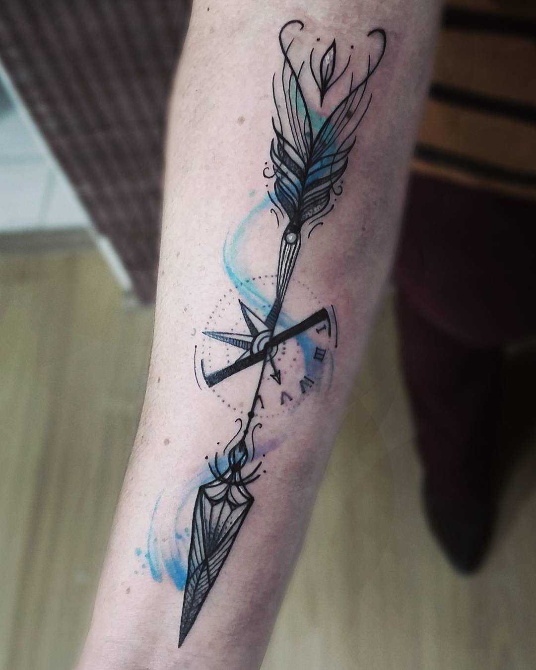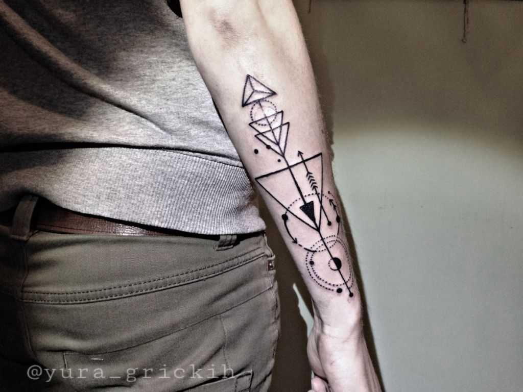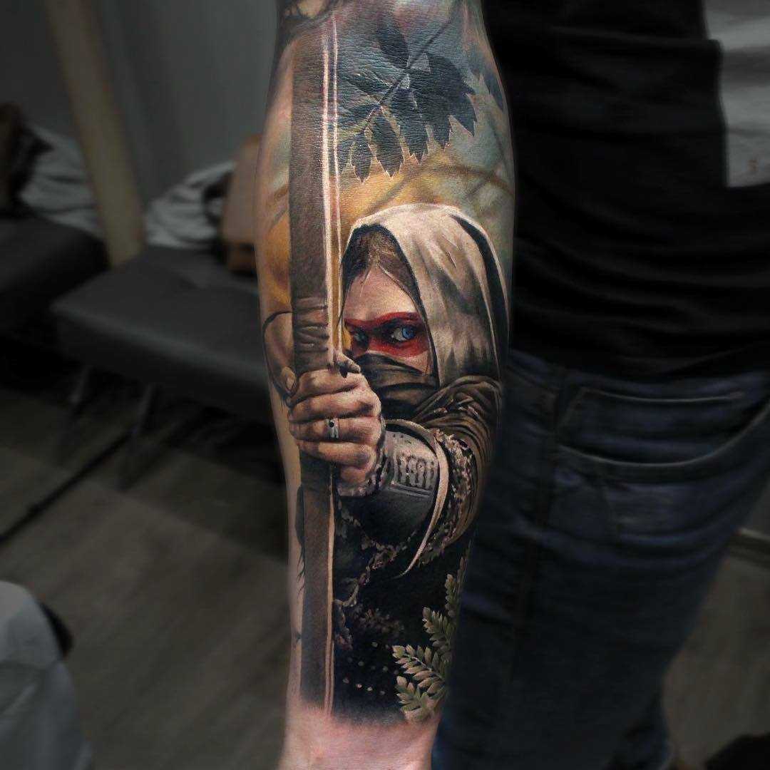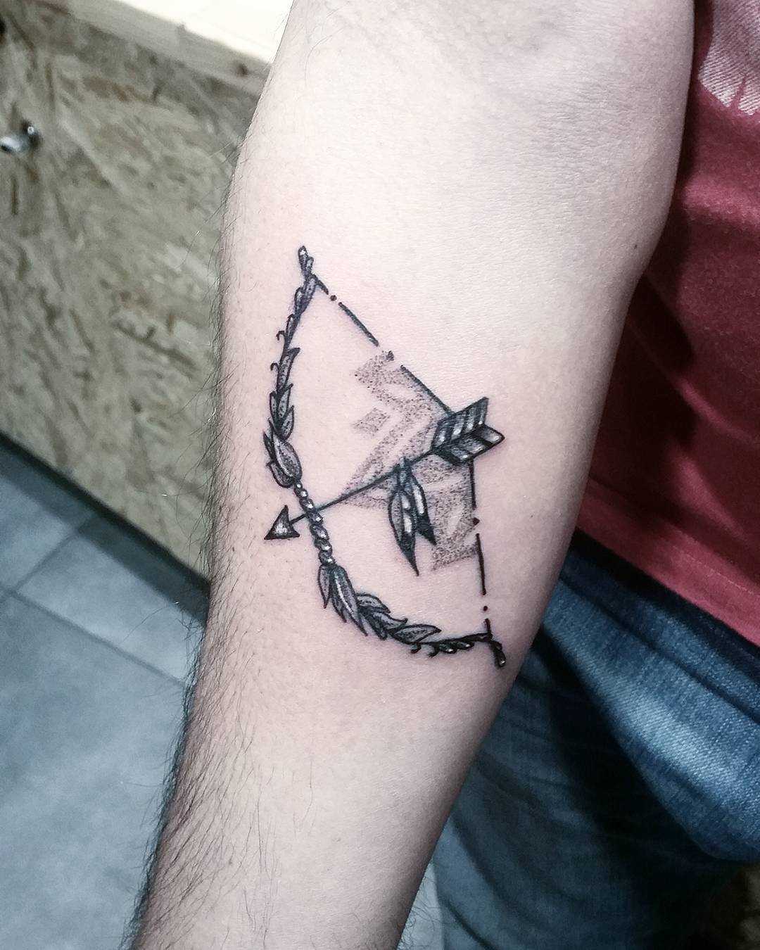 - Как показатель брутальности, мужчины наносят рисунок на всю область руки. Учитывая площади, тату Стрелца на руке можно дополнить большим количеством дополнительных деталей. От их разнообразия и количества смысл татуировки будет меняться.