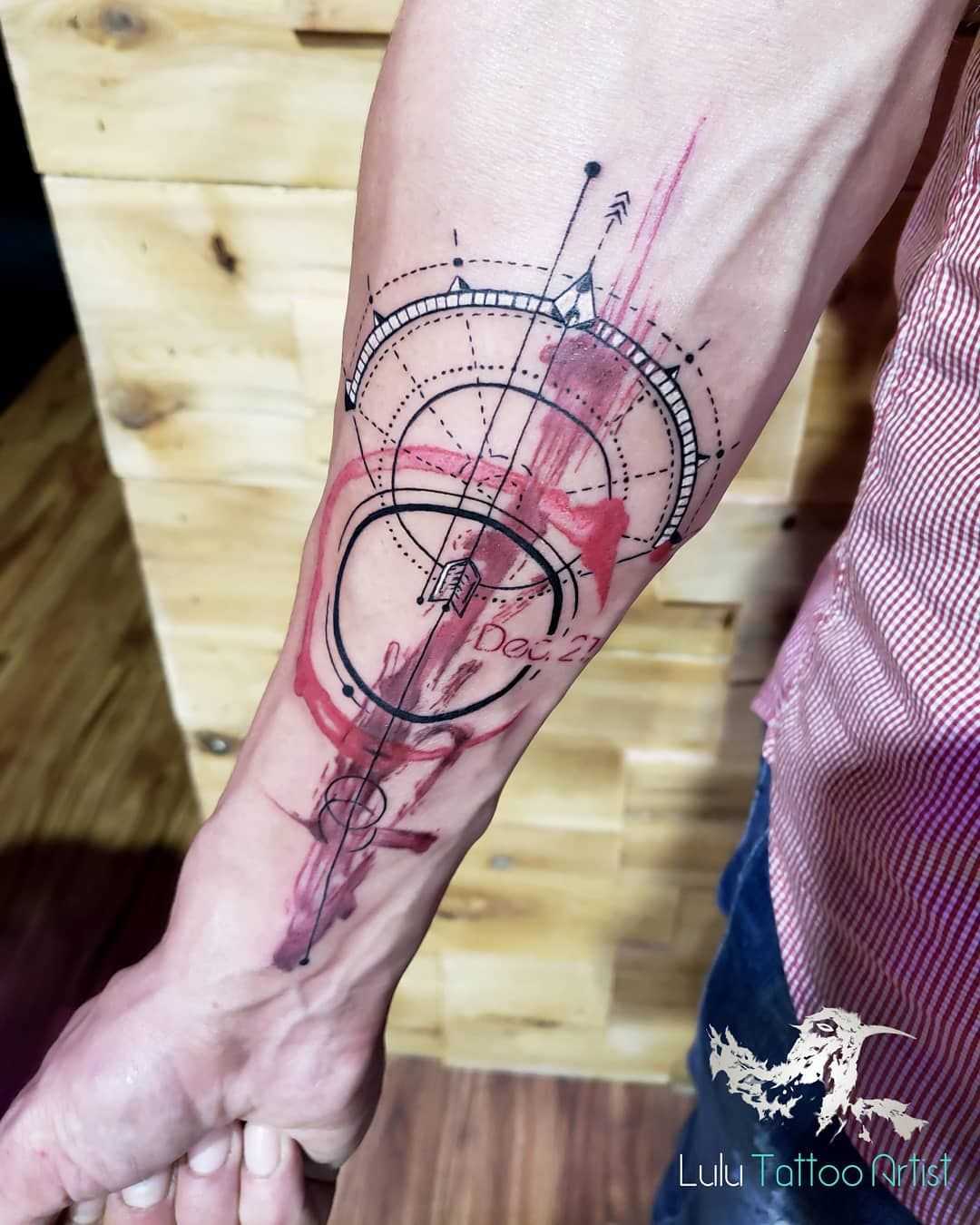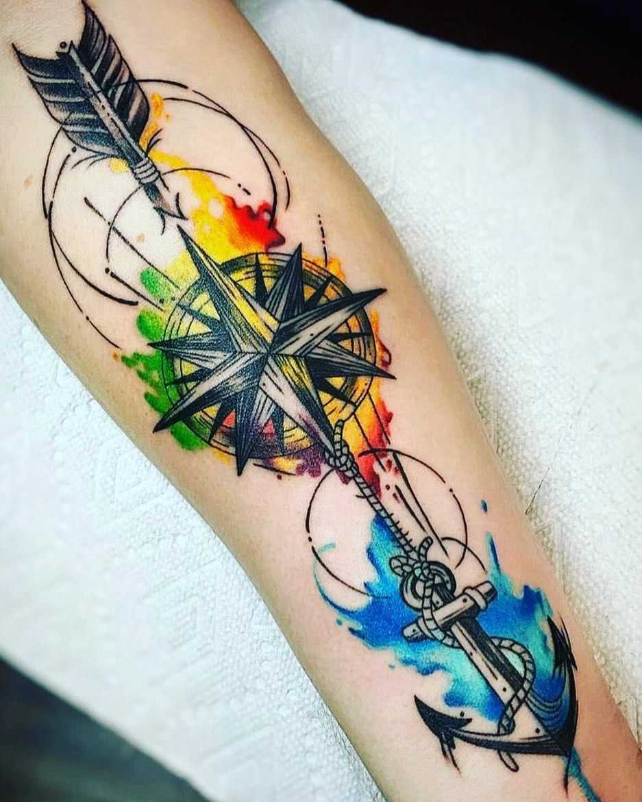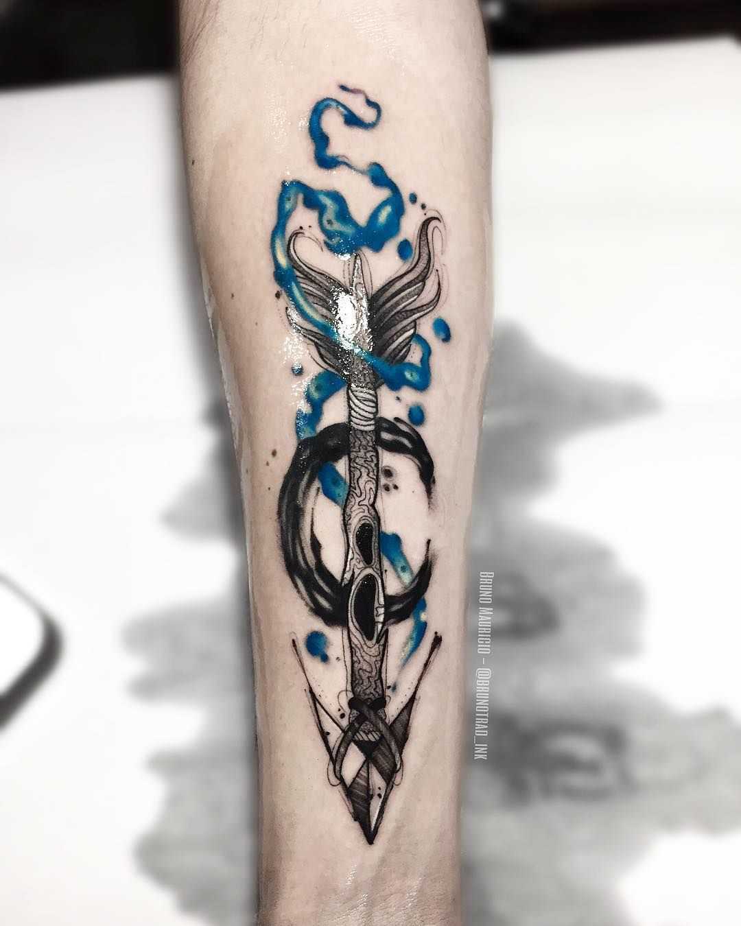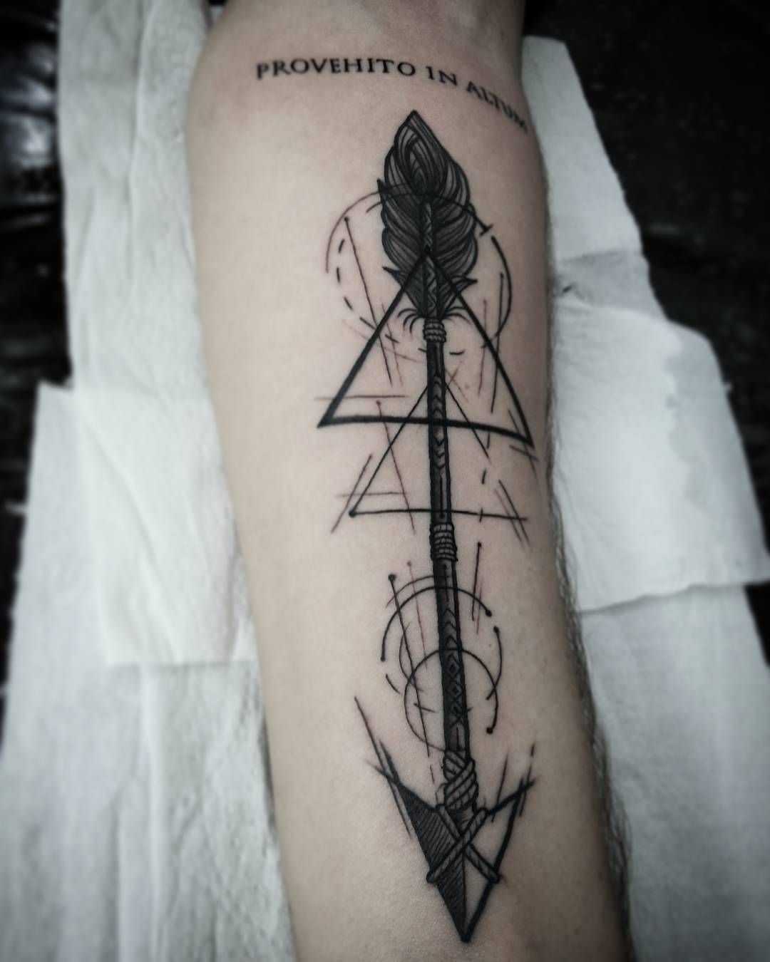 - Как показатель брутальности, мужчины наносят рисунок на всю область руки. Учитывая площади, тату Стрелца на руке можно дополнить большим количеством дополнительных деталей. От их разнообразия и количества смысл татуировки будет меняться.