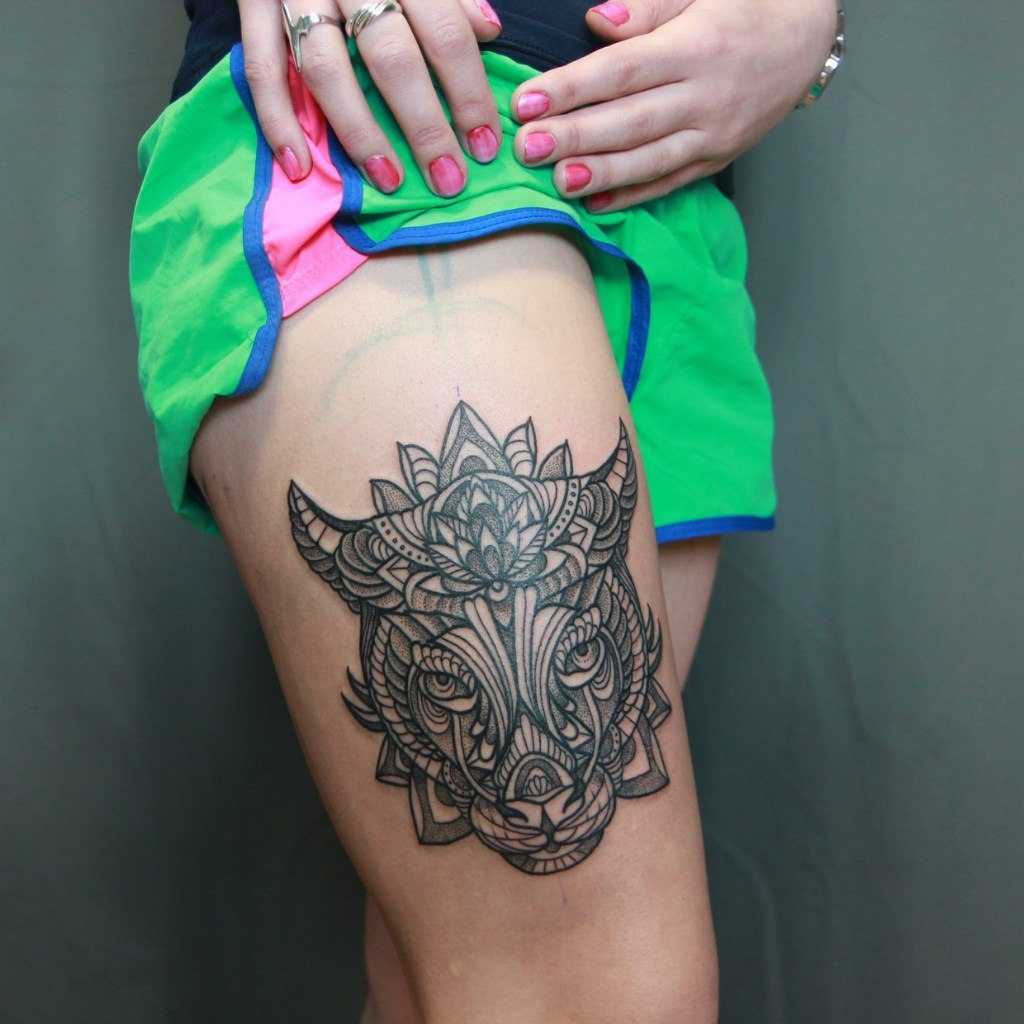 Изобразив тигра на бедре или обеих ногах, мужчина тем самым проявляет страстность и чувственность свое натуры