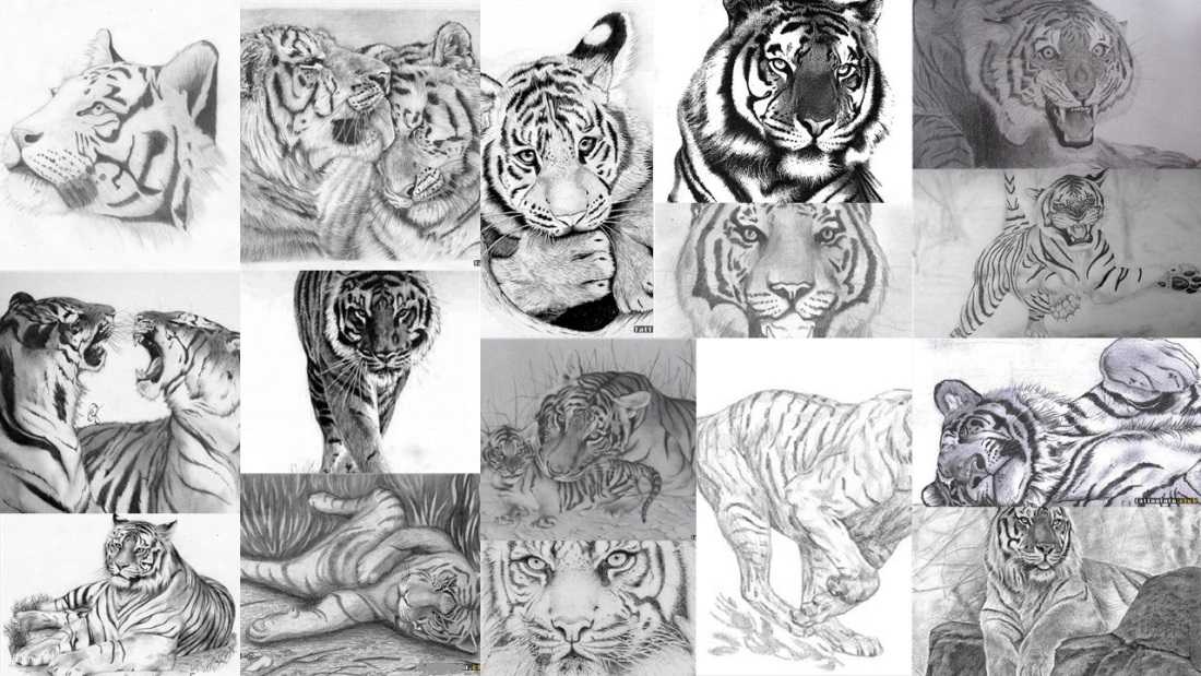 рисуются передние лапы или отпечатки. Зверь целиком и тигрица в сопровождении двух