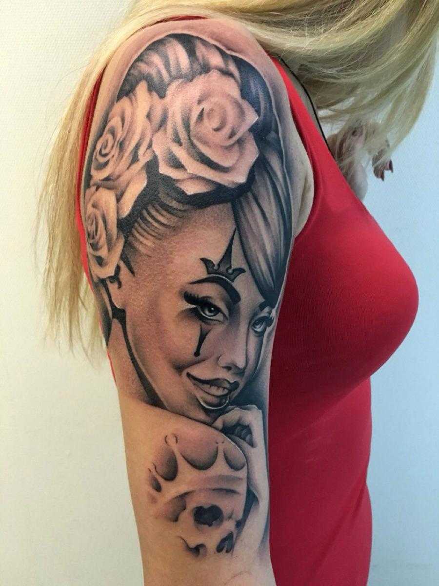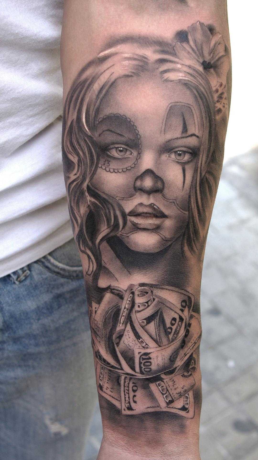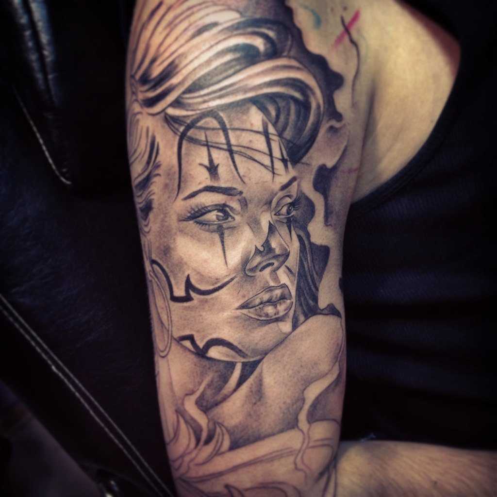 Стиль чикано, тату-эскизы привлекает леди их же портретами. Если мужчины наносят женские образы, чтобы подчеркнуть тягу к ним, то девушки выбирают зарисовки, чтобы передать свое эмоциональное состояние.