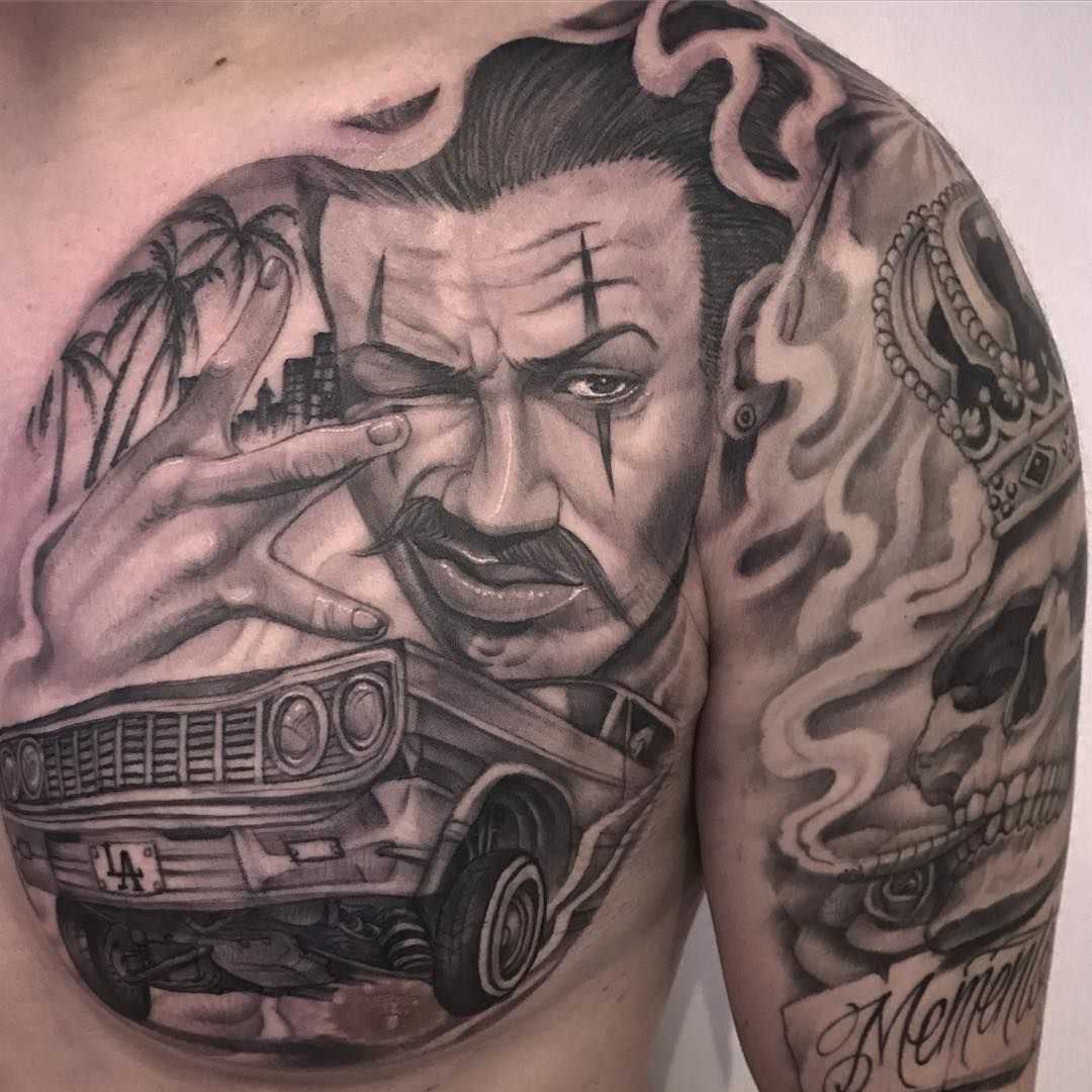 Чикано тату, значение которых определенно связано с преступным миром, — его атрибуты.