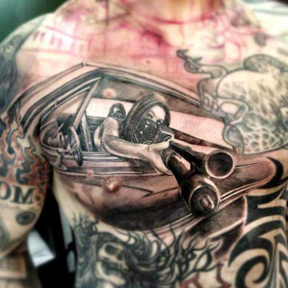 | Грудь и спина | Смотрятся тату на накаченной мужской груди. Для максимального раскрытия внутреннего мира человека область тела является достаточно обширной. Из этих же соображений тату наносятся на спину. На женщинах крупные изображения смотрятся негармонично. Обычно представительницам слабого пола на эти зоны мастера советуют наносить надписи. |