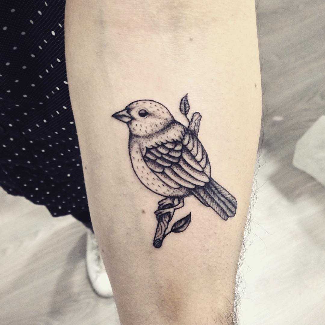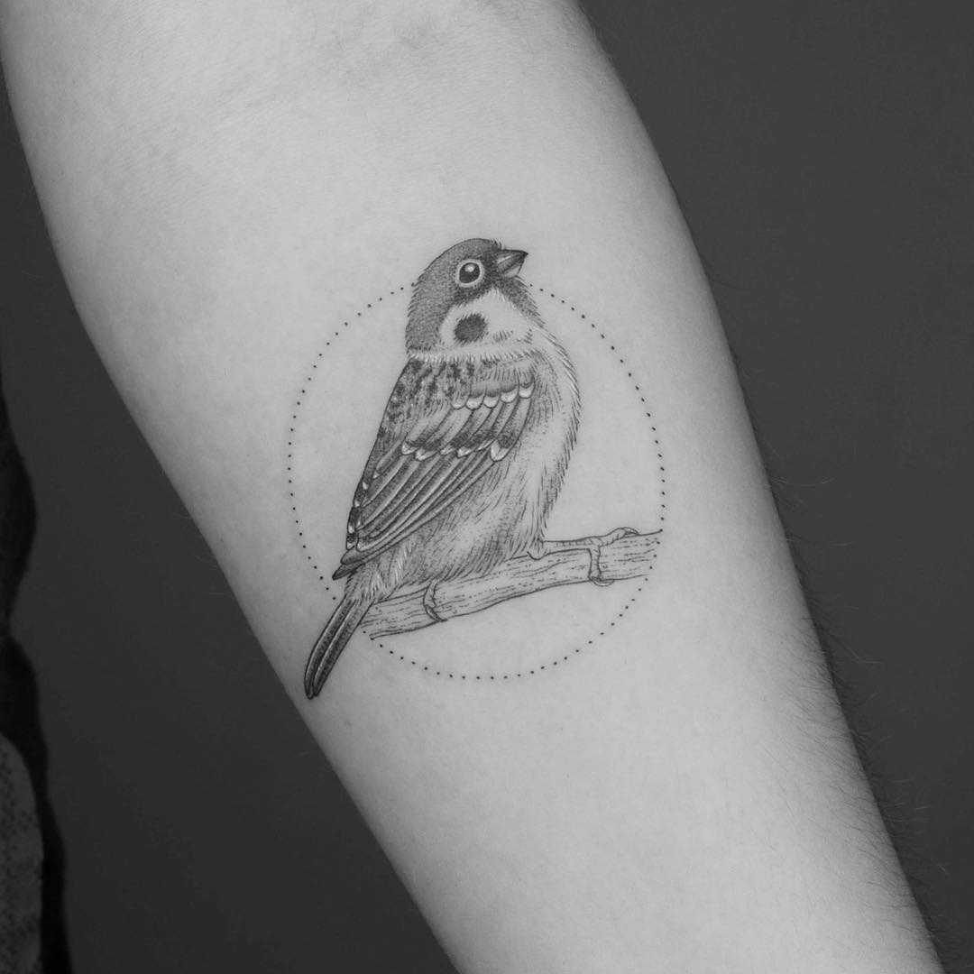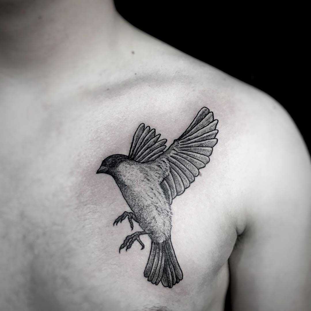 Дотворк – точечная техника нанесения, в которой интенсивность цвета зависит от расстояния между точками, имеющими разный диаметр. Тату воробей в этом стиле лучше всего подходит для смелых и открытых людей, желающих демонстрировать наколку окружающим.