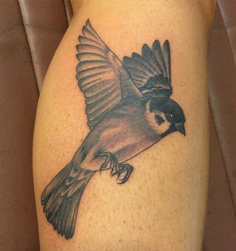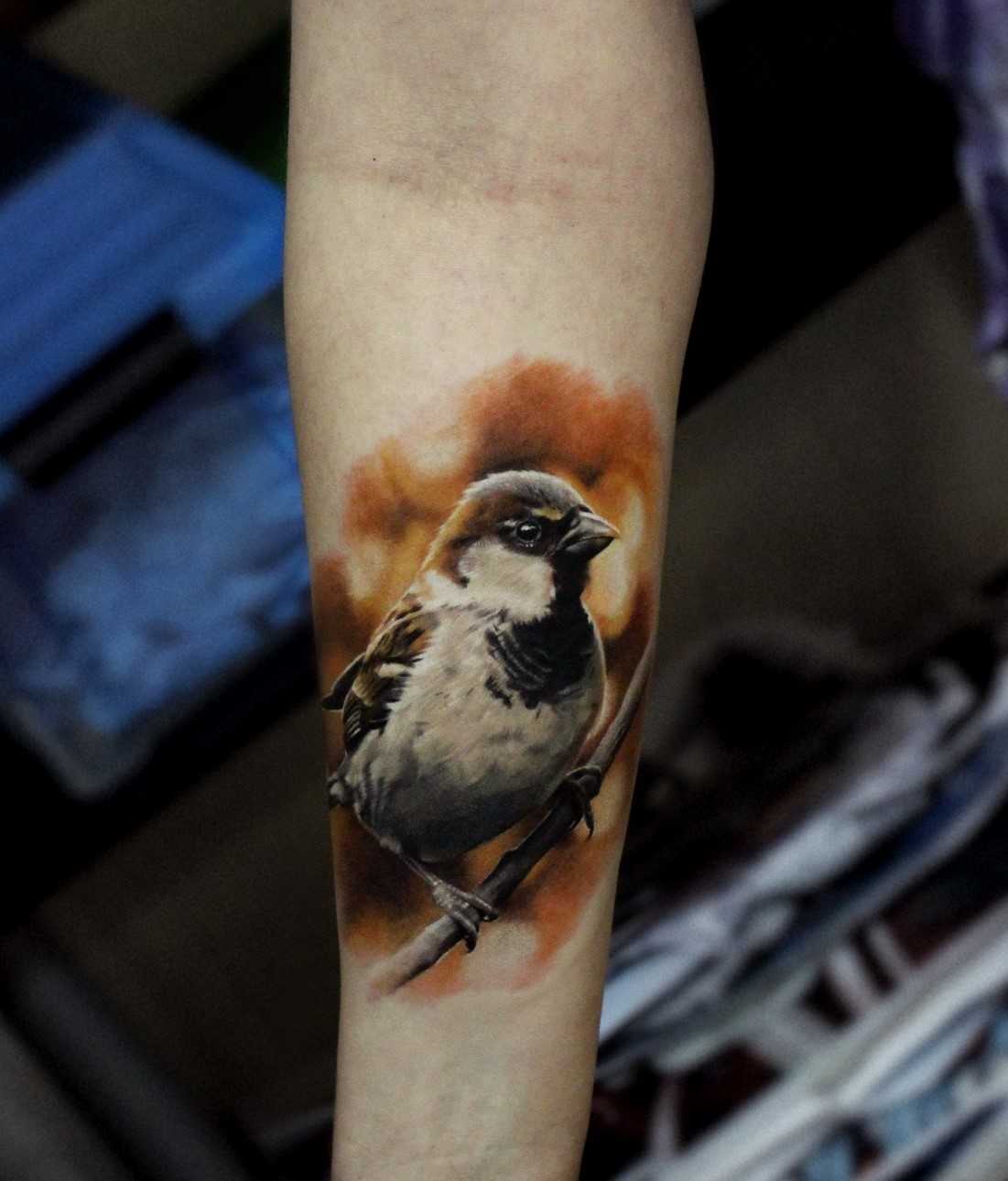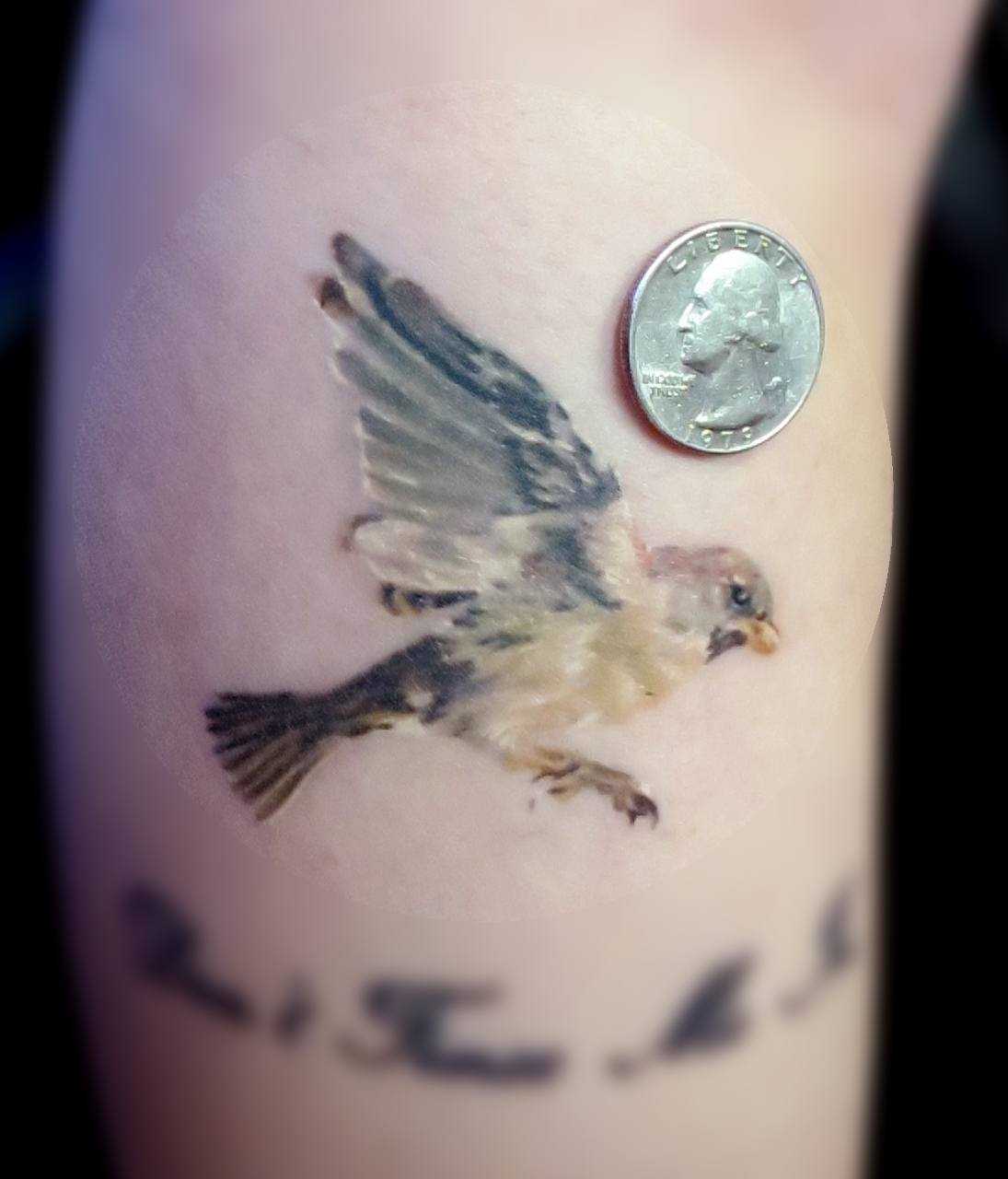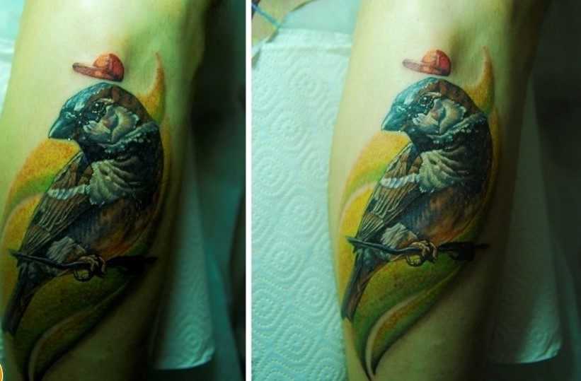 Внешне тату воробей в стиле реализм напоминает фотографию на теле, привлекающую к себе внимание со стороны.