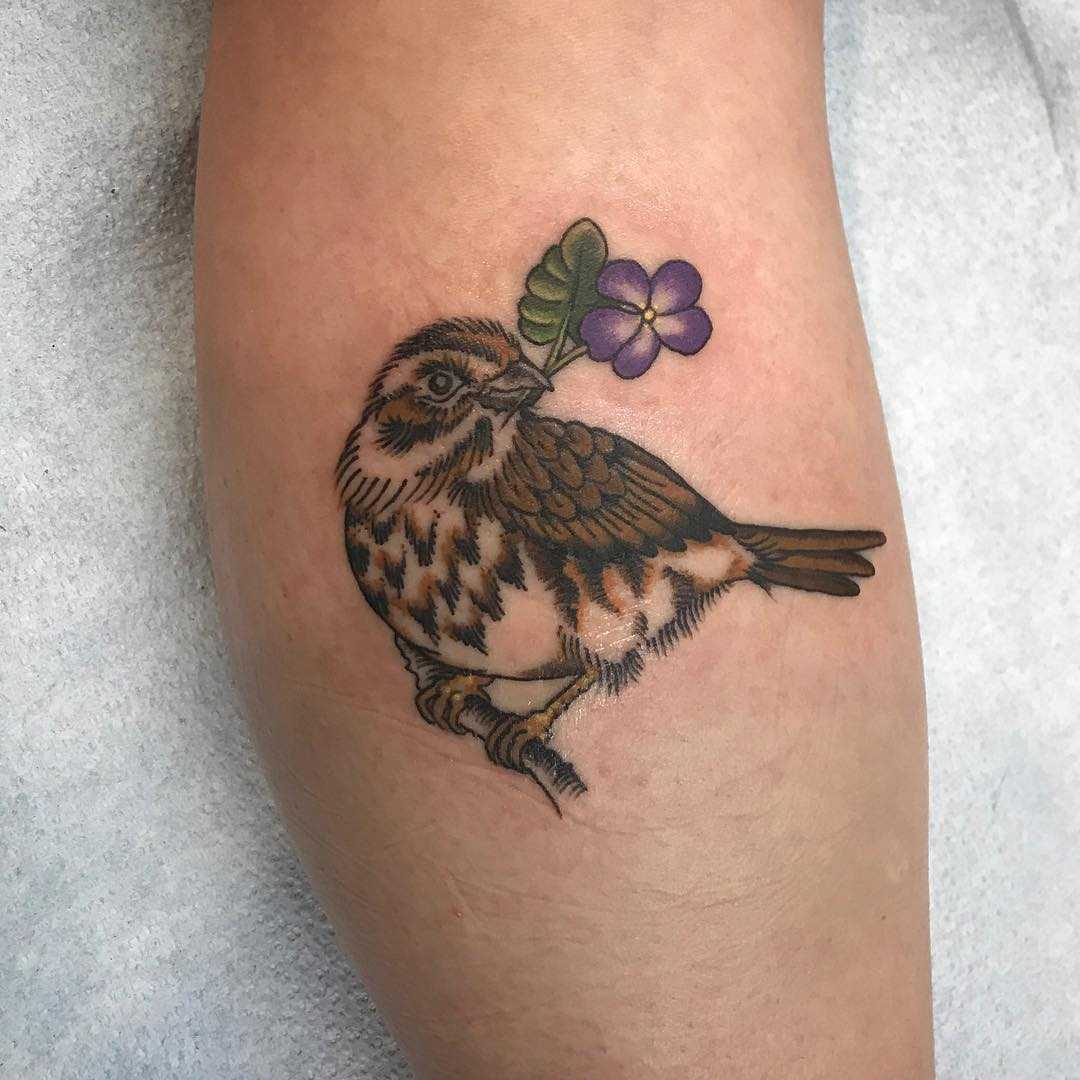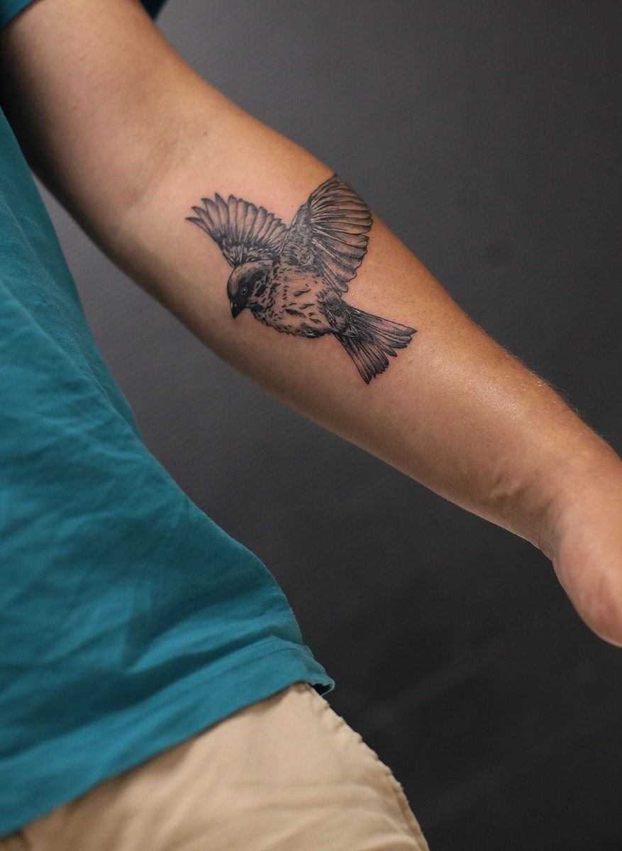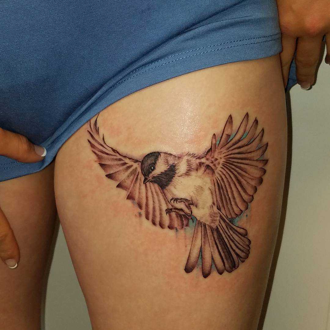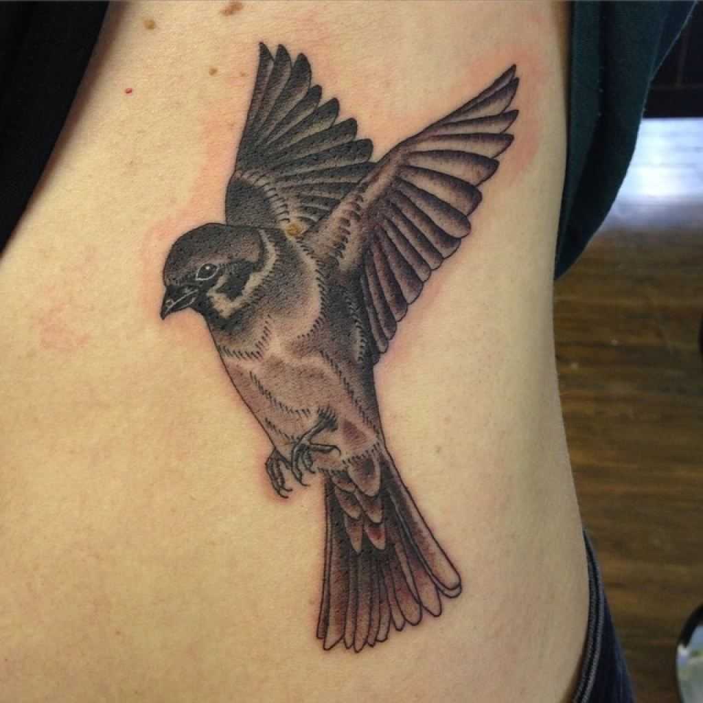 Внешне тату воробей в стиле реализм напоминает фотографию на теле, привлекающую к себе внимание со стороны.