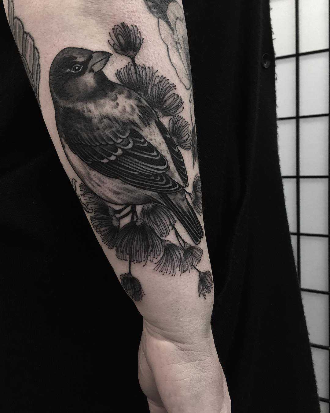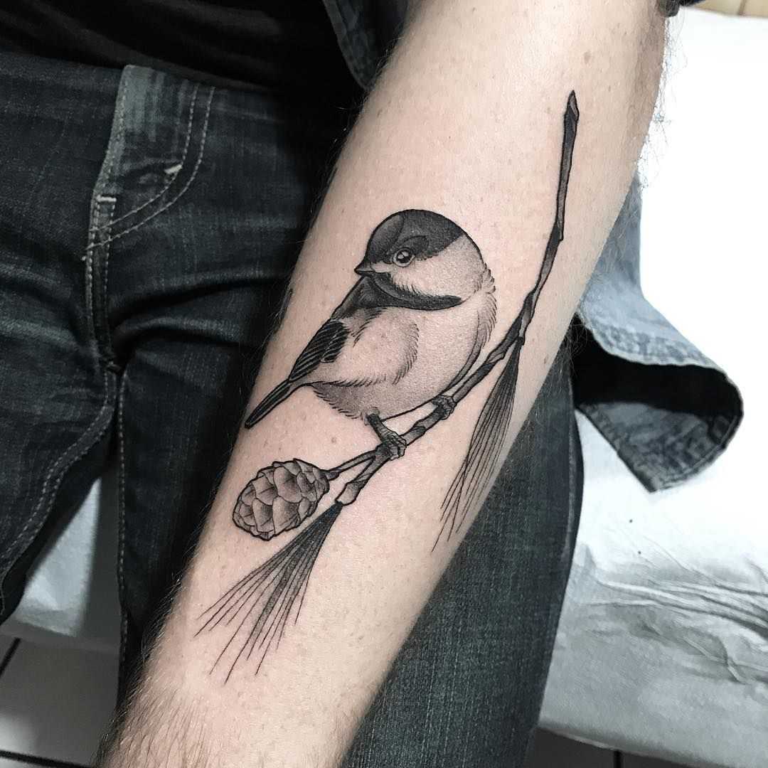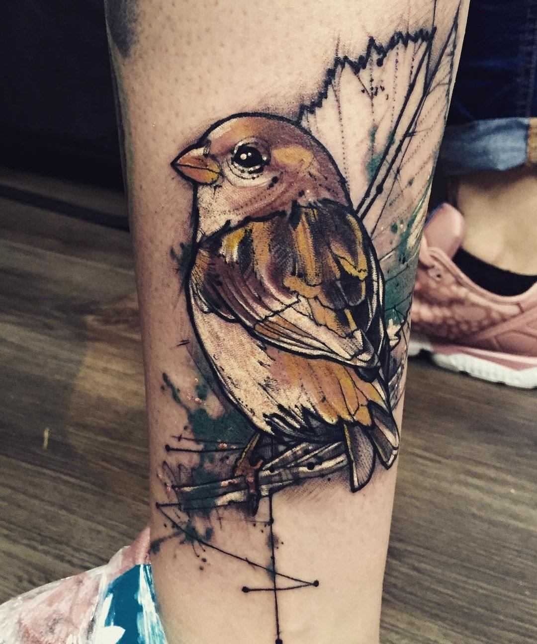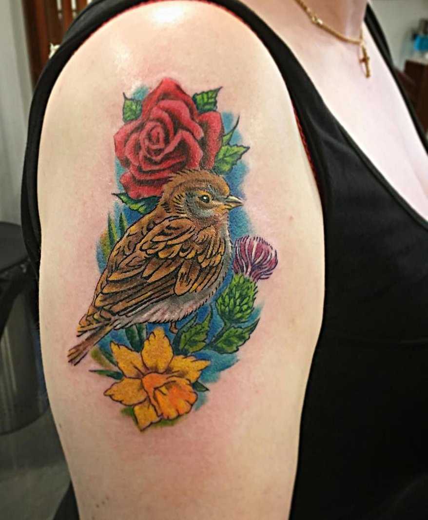 Внешне тату воробей в стиле реализм напоминает фотографию на теле, привлекающую к себе внимание со стороны.
