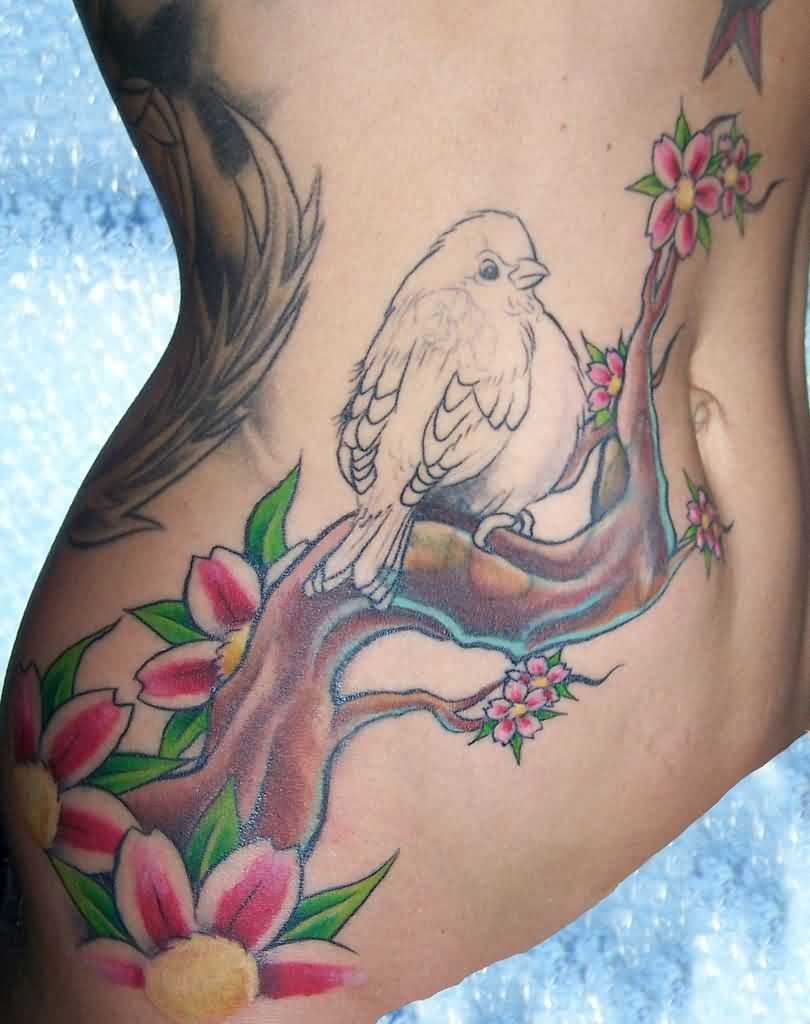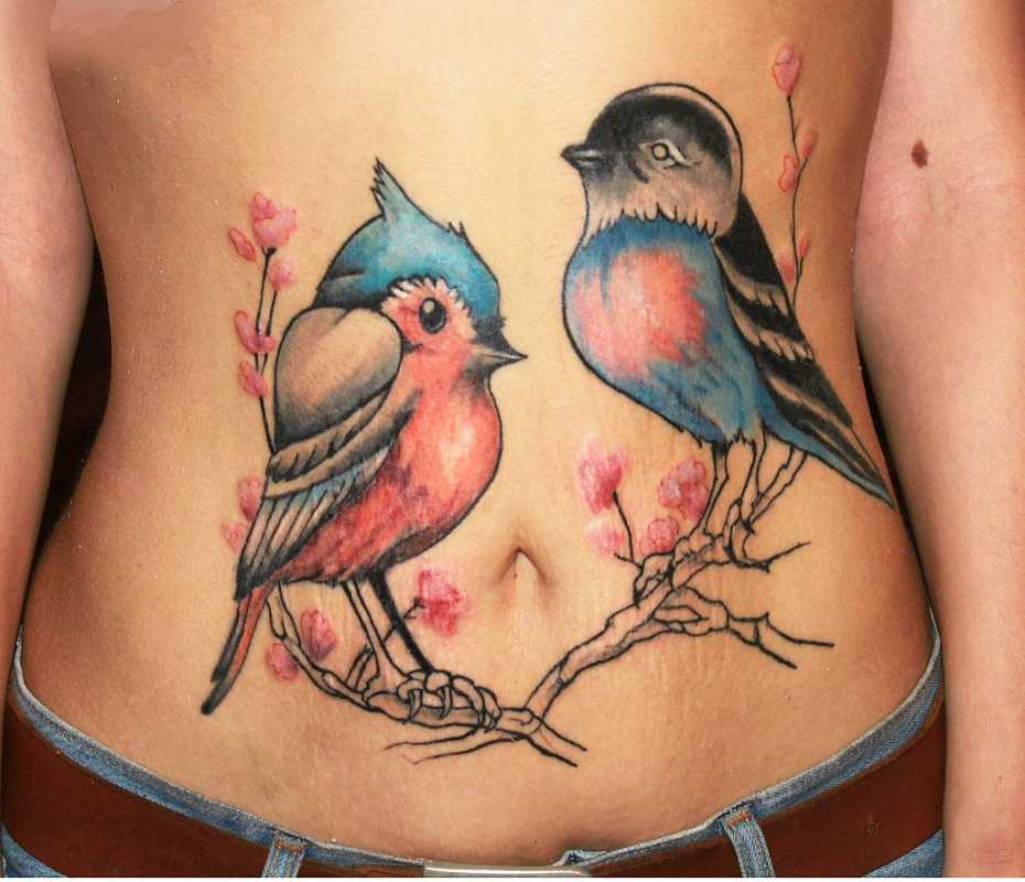 - Воробей на ветке сакуры или любого другого дерева – женский вариант, обычно девушки располагают тату на животе или ключице.