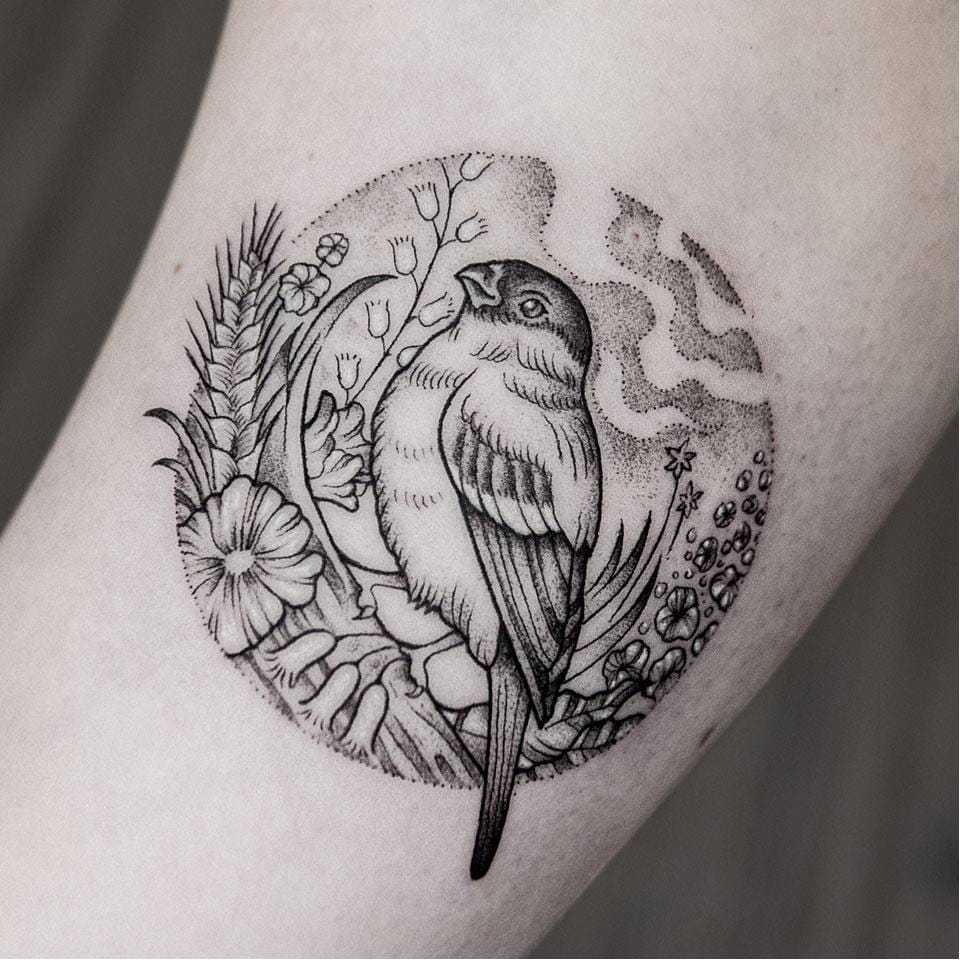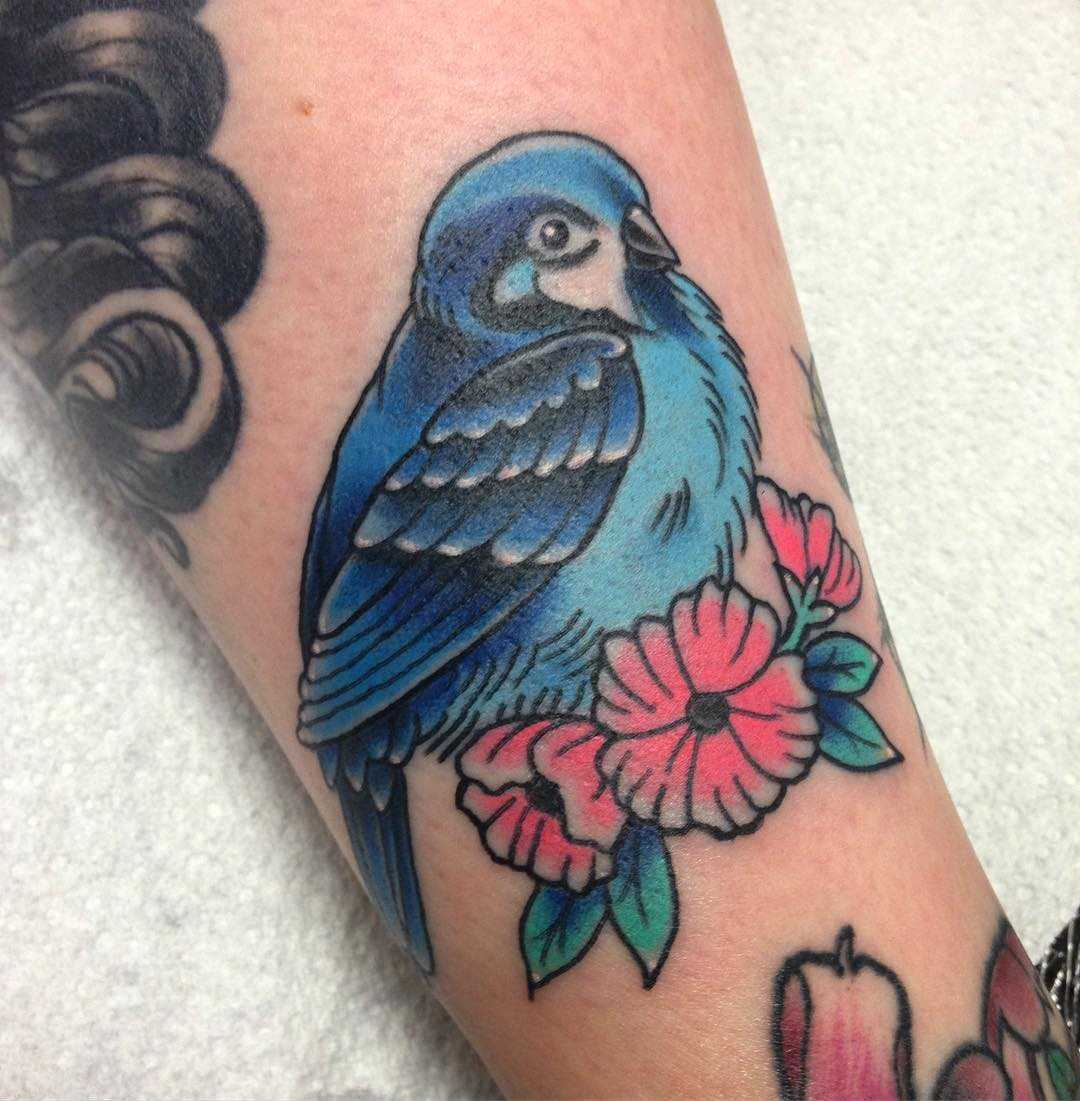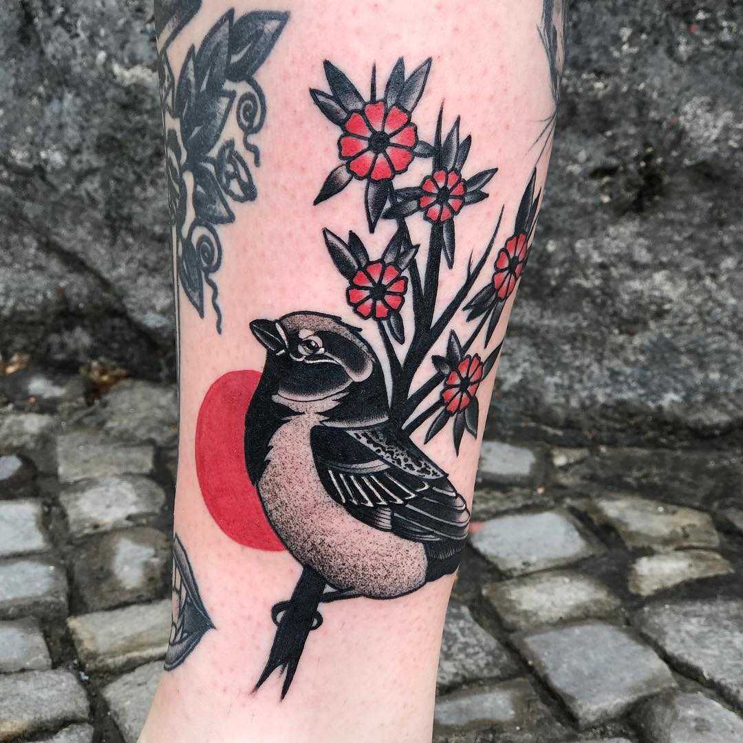 - Птица, сидящая на цветке – еще один классический женский вариант наколки.