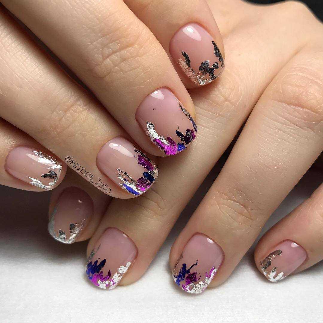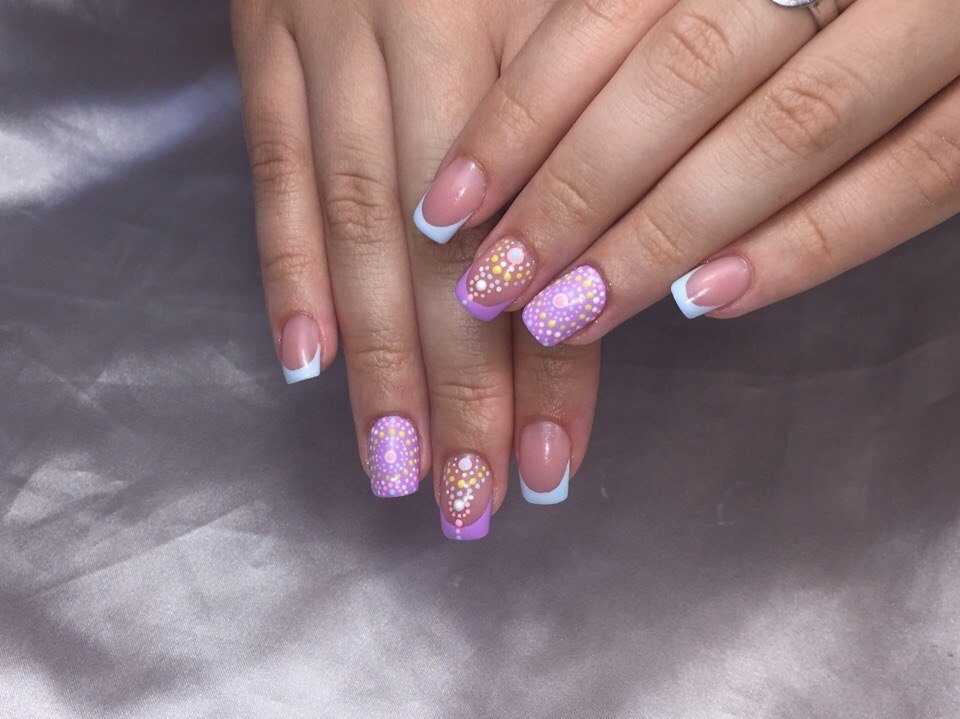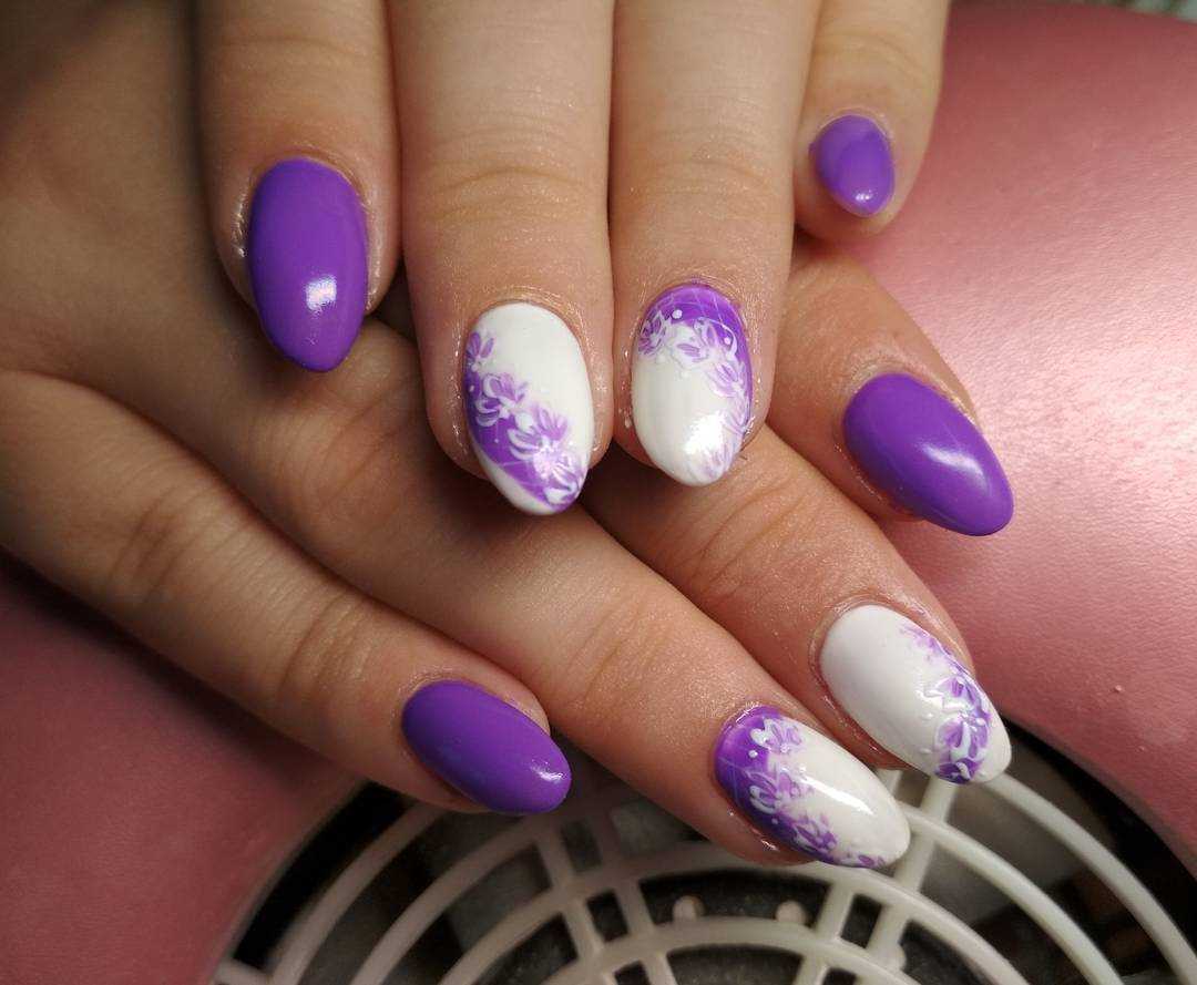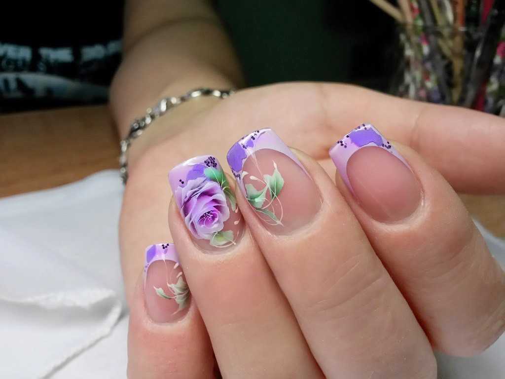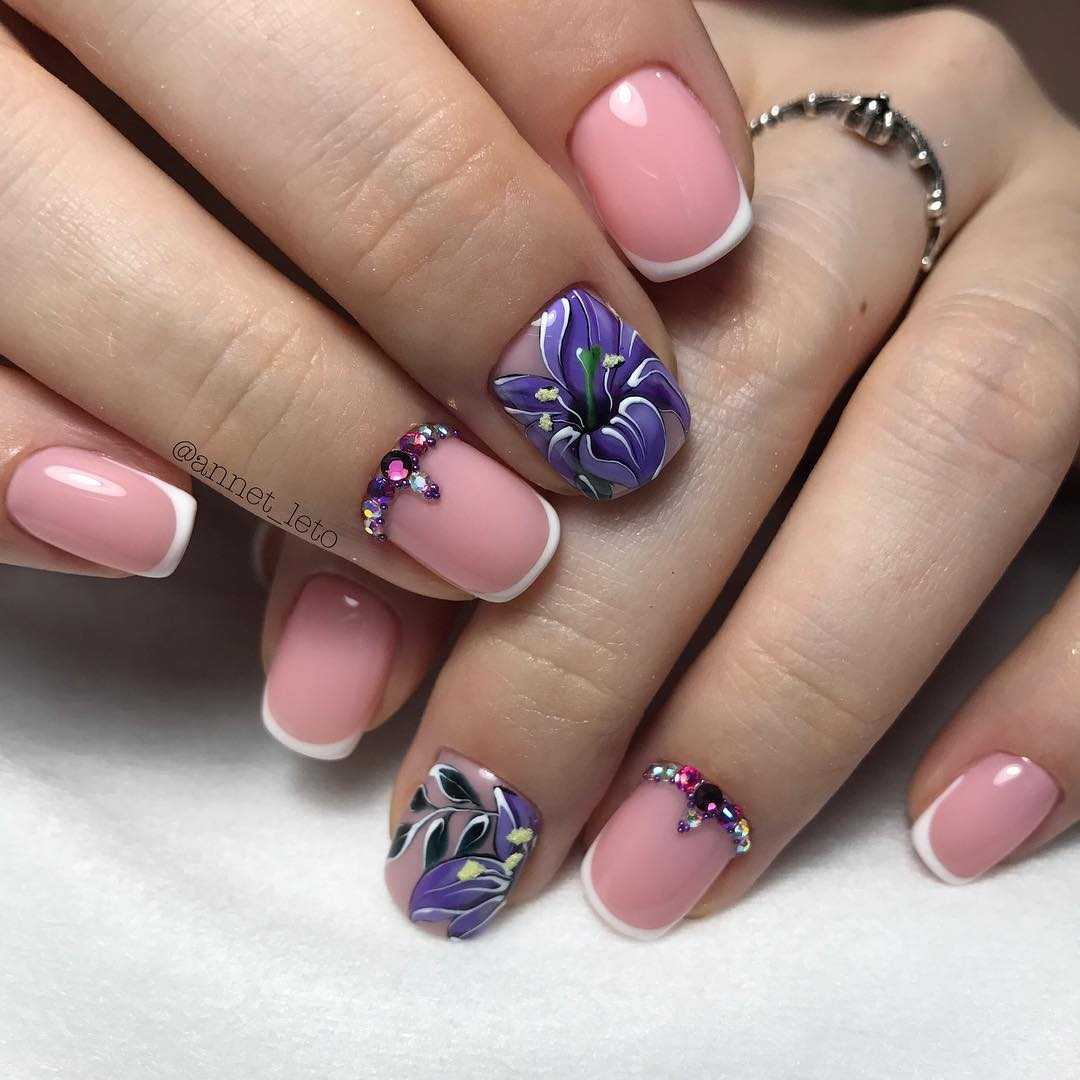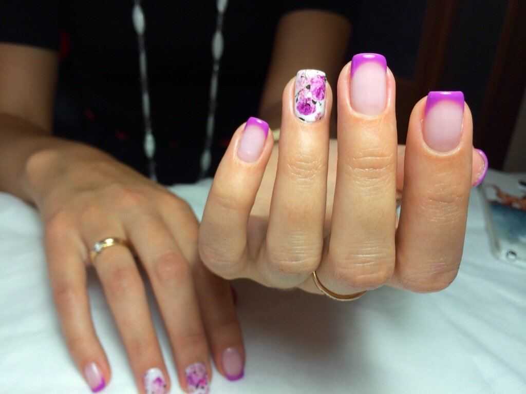 Френч очень хорошо сочетается с рисунками, геометрией и разнообразными техниками. Вы можете на одних пальчиках выполнить классический френч с насыщенной сиреневой улыбкой, на других нанести шикарные цветочные узоры, а оставшийся ноготок выделить ярким акцентом. Дизайн может быть нежным и утончённым, а может смотреться ярко и празднично. Среди этого великолепного разнообразия выбирать только вам.