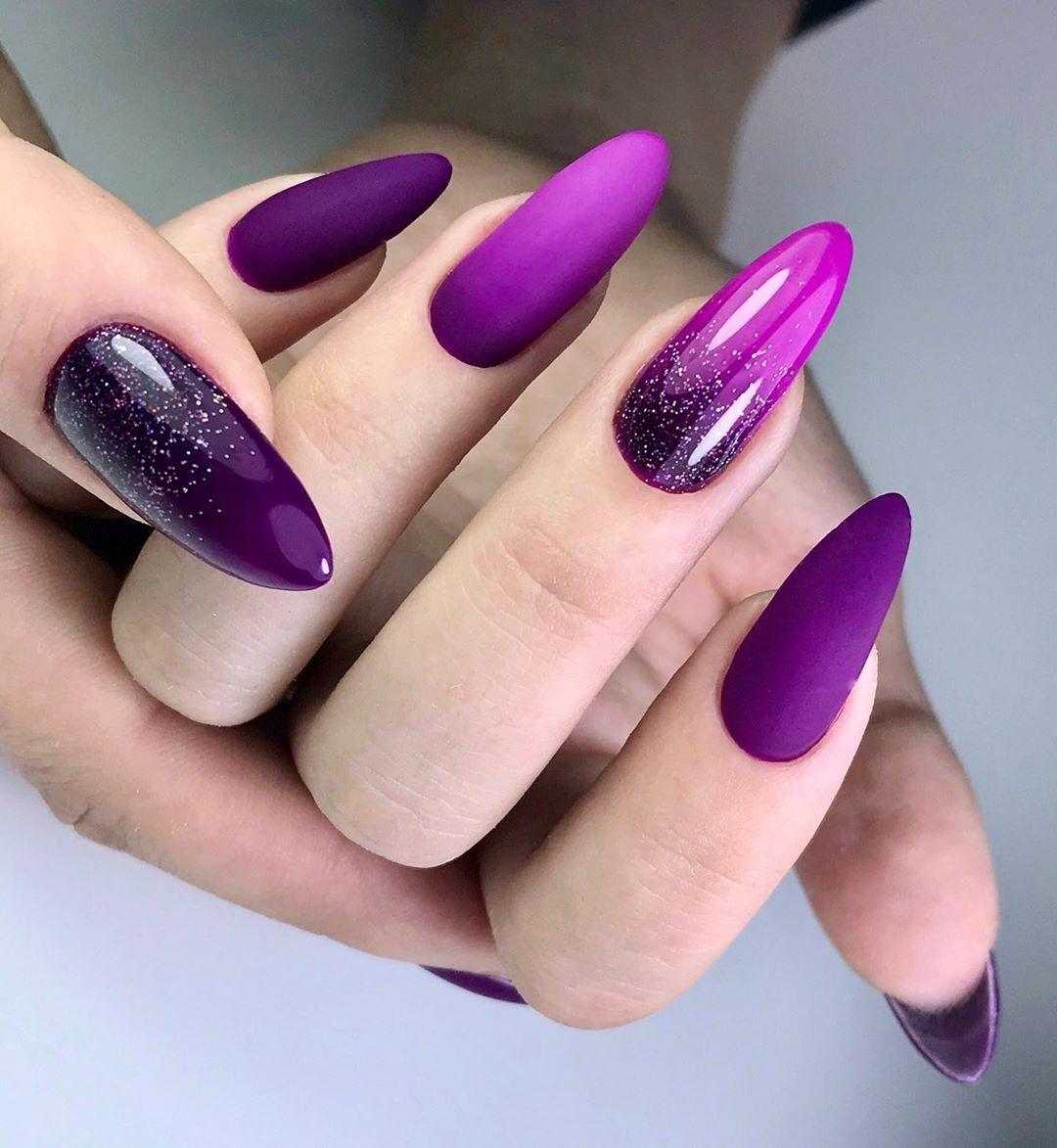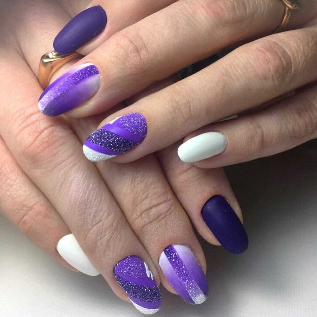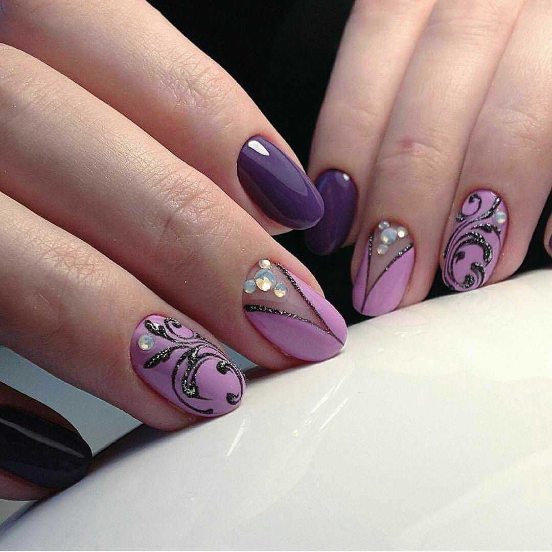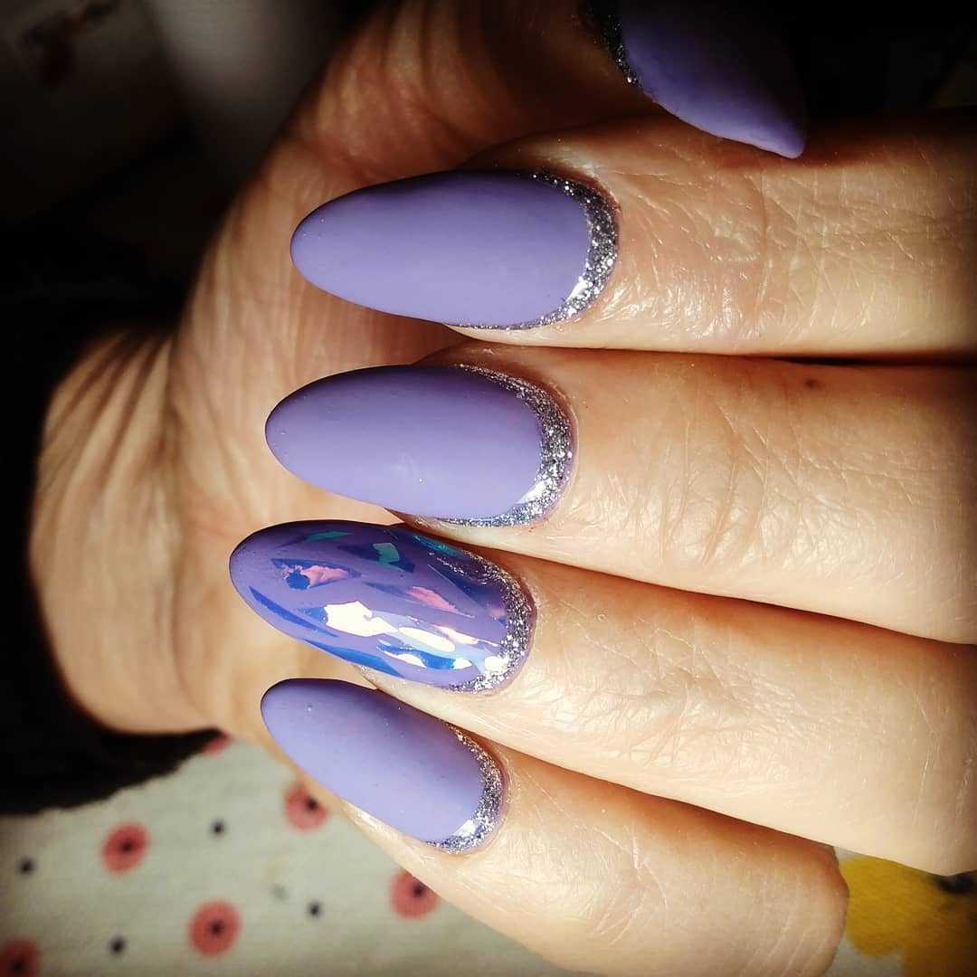 Вы можете выполнить френч на прозрачном покрытии, выделив при этом улыбку фиалковым, сиреневым или лавандовым цветом, а можете один из предложенных либо других оттенков из данной палитры использовать в качестве основы, нарисовав улыбку классическим белым цветом. Красиво смотрится такая длина с аккуратными рисунками, минимальным декором в виде страз, бусин и глиттера, которыми украшается улыбка или выделяется акцентный пальчик. Главное не перегрузить ноготки, чтобы пальчики не выглядели массивно.
