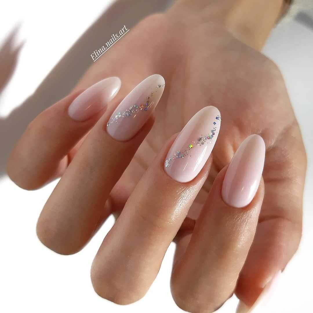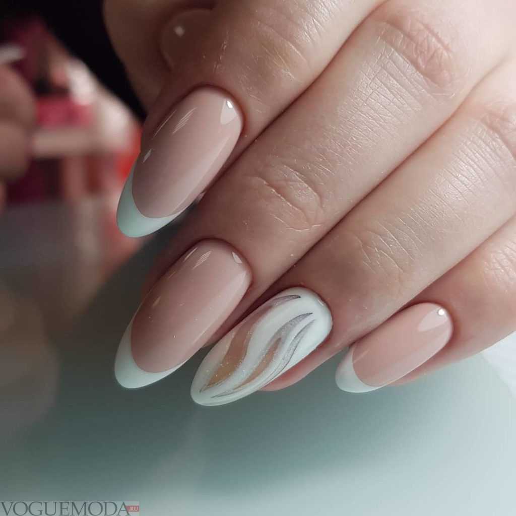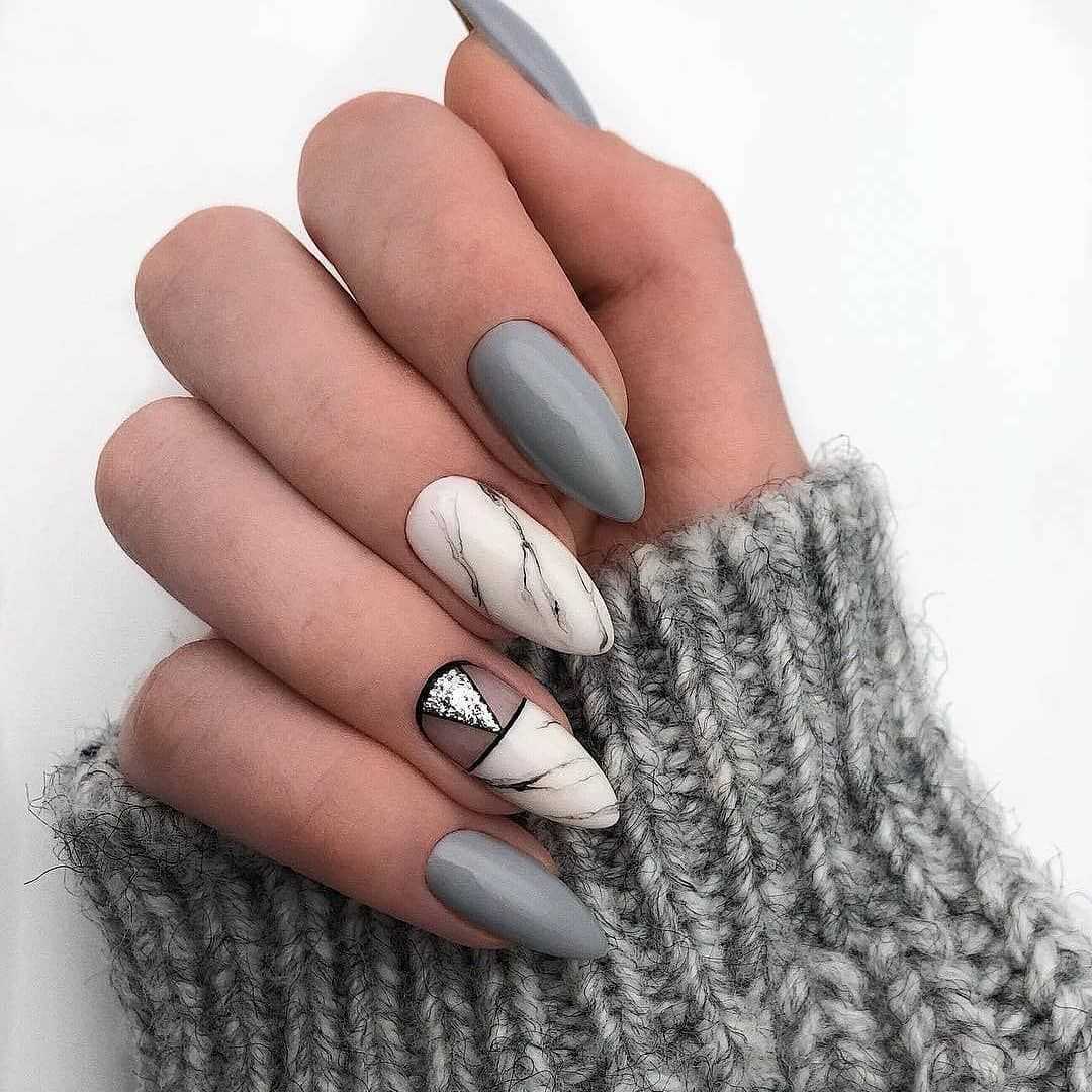 В тренде сплошное покрытие ногтей втиркой и многочисленные нейл-арты с геометрией, глиттером и стразами. На миндальных ногтях особенно красиво смотрится сочетание втирки и мраморного дизайна. При желании можно дополнить маникюр фольгированными полосами.