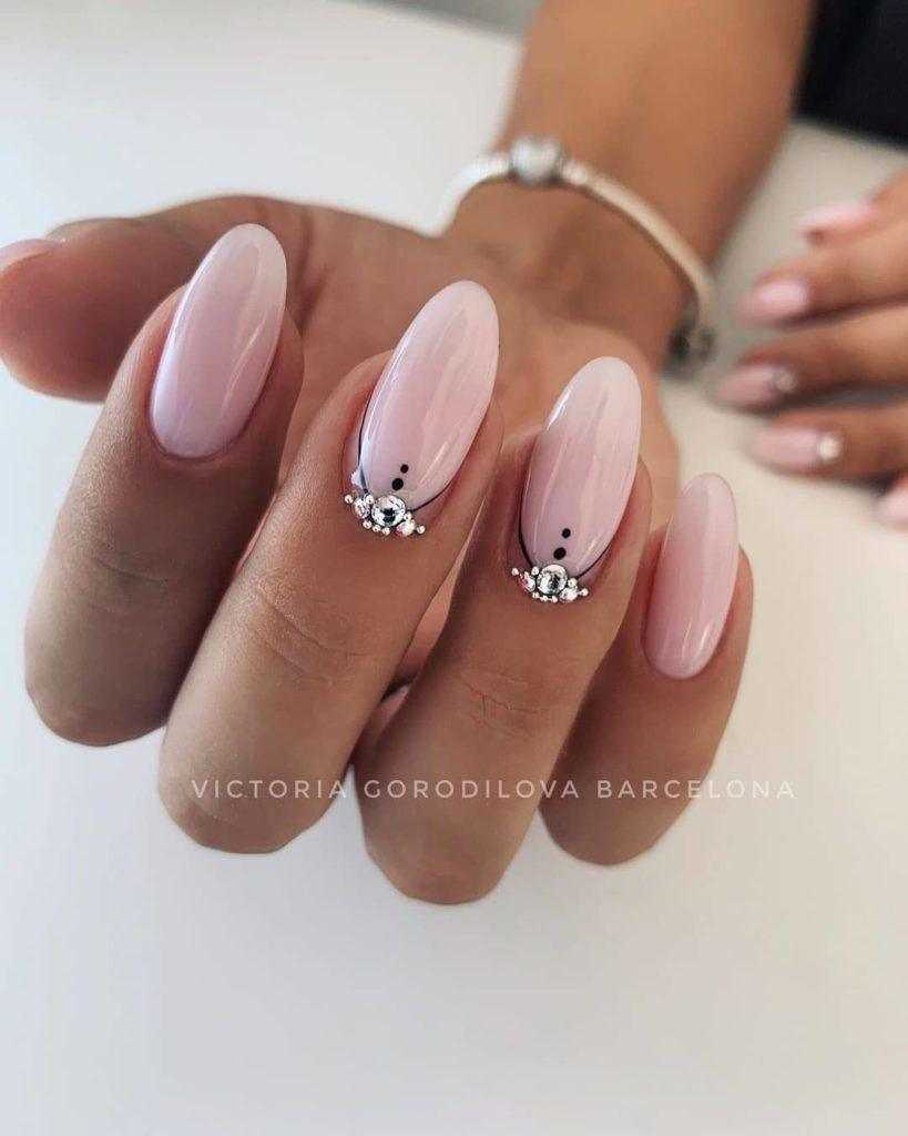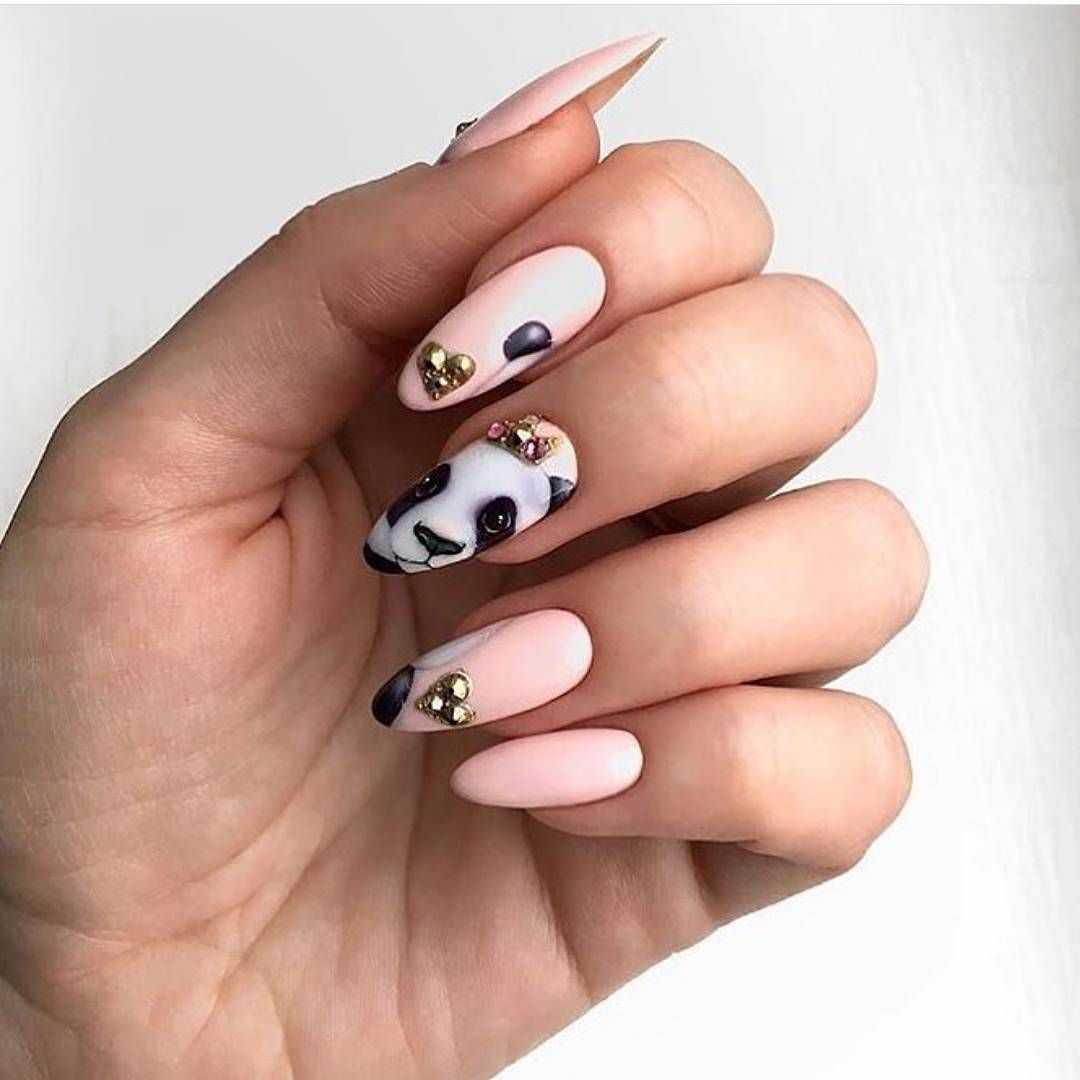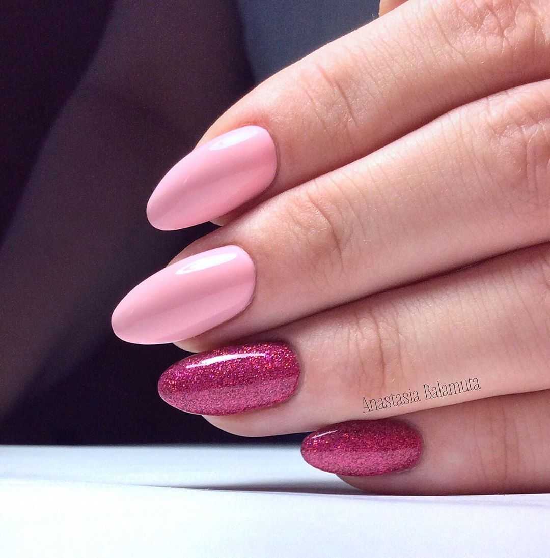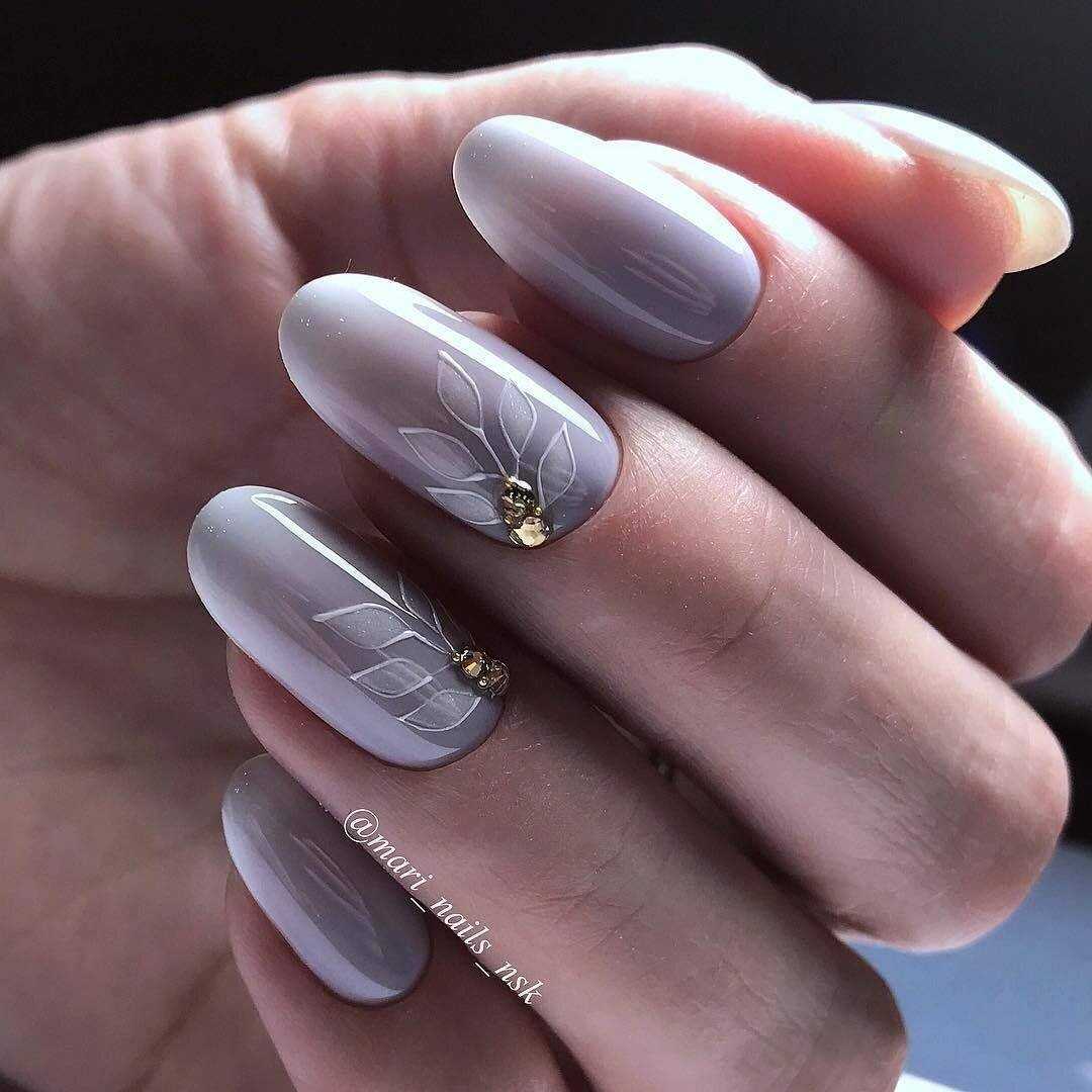 В тренде сплошное покрытие ногтей втиркой и многочисленные нейл-арты с геометрией, глиттером и стразами. На миндальных ногтях особенно красиво смотрится сочетание втирки и мраморного дизайна. При желании можно дополнить маникюр фольгированными полосами.