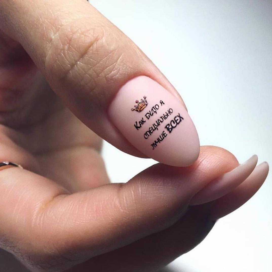 Светлые надписи на темной основе смотрятся наиболее выигрышно, они заметны даже издалека. Также можно попробовать нанести слоган черным лаком на нюдовую основу, выделив таким образом только один пальчик. Остальные покрыть темным цветом.