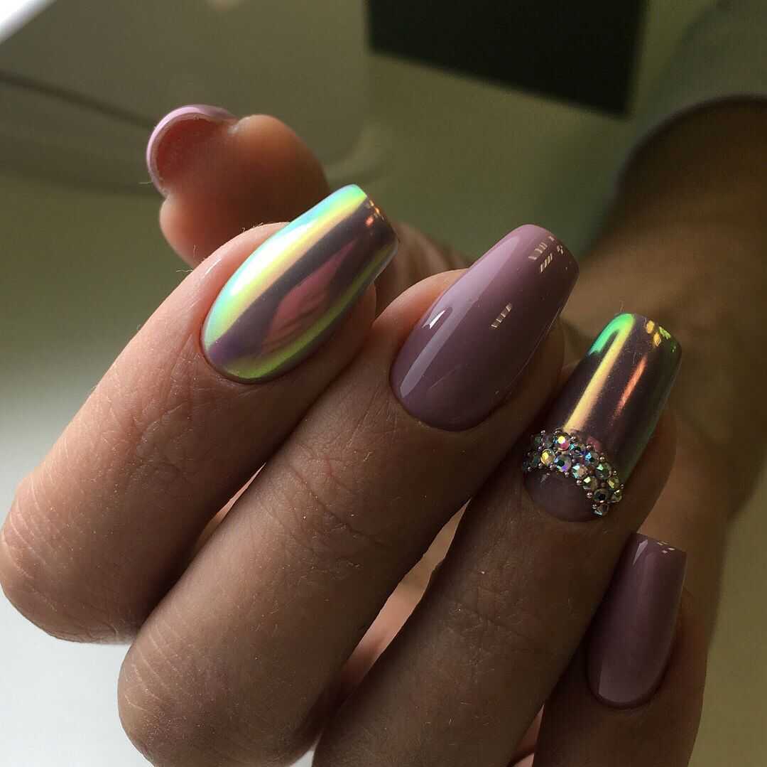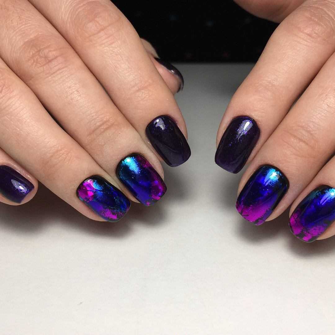 Блеск втирки в сочетании с темным покрытием покорил множество женщин во всем мире. И это понятно, ведь такой маникюр выглядит просто роскошно. Модницам следует присмотреться к втирке жук или зеркальному покрытию, сочетая в одном образе с матовым гель-лаком.