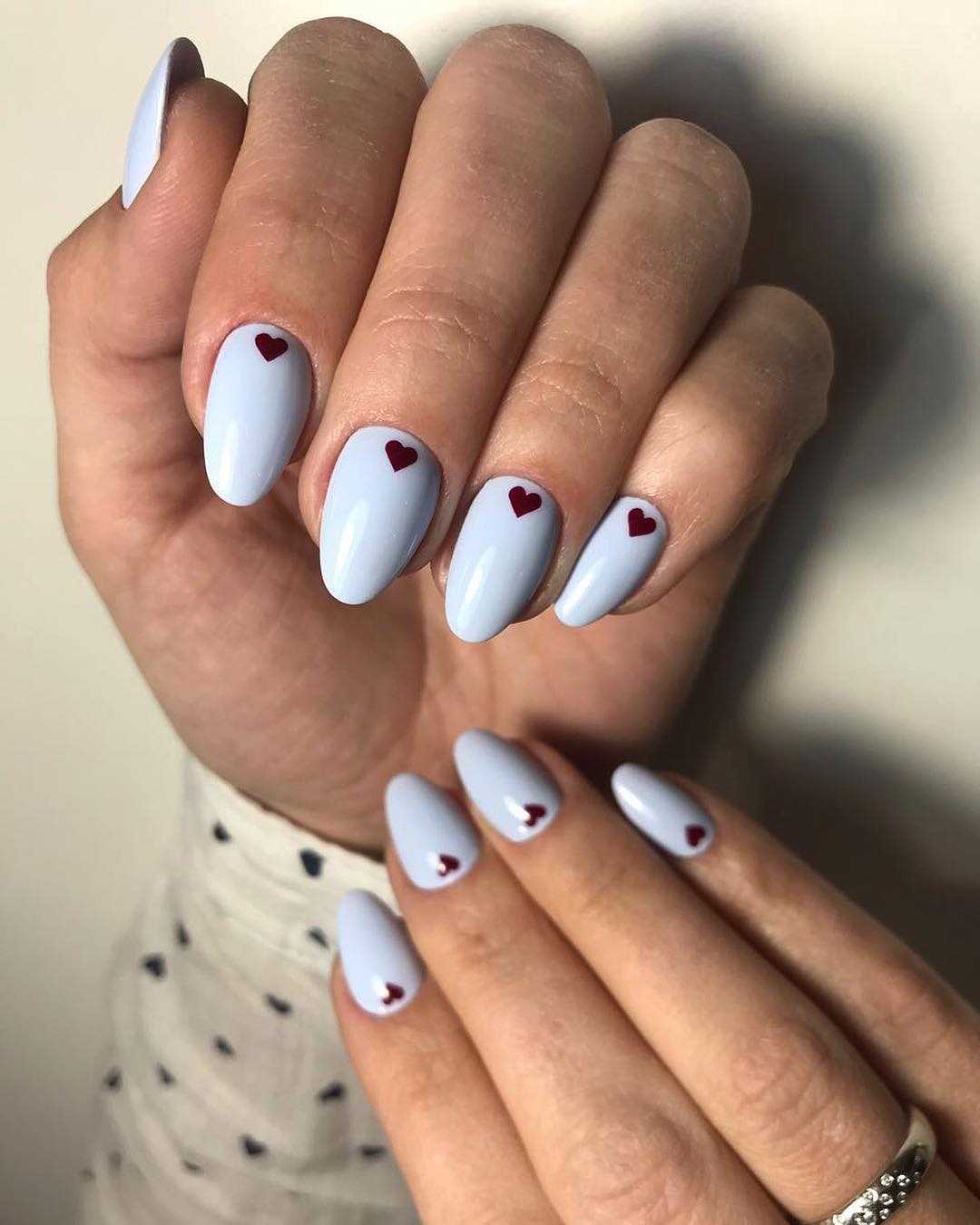 На коротких ноготках лучшей идеей исполнения этого цвета стали небесные оттенки синего, либо его тёмные тона, с более светлой отделкой