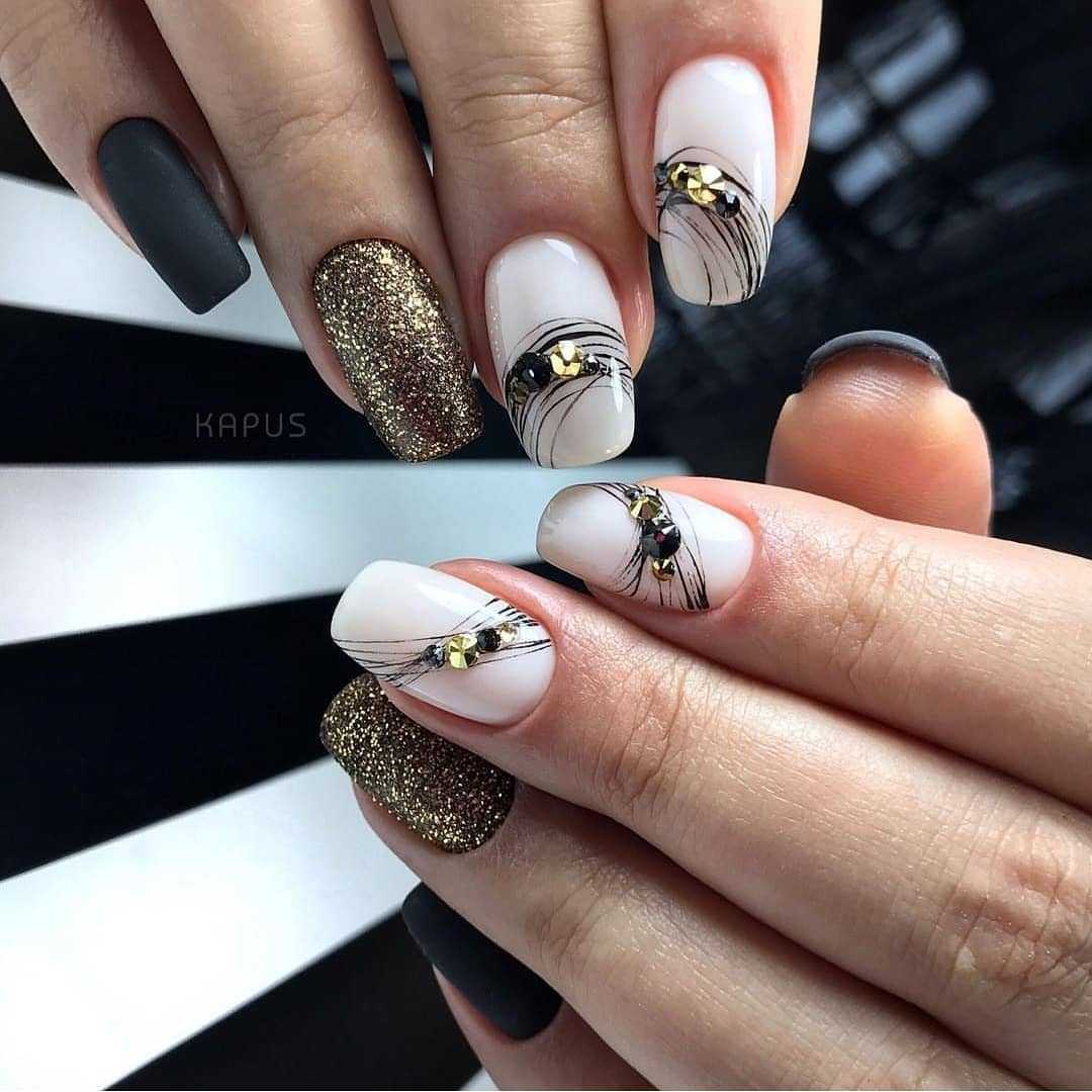 Маникюр в темных тонах прекрасно смотрится с камушками, глиттером, конфетти, фольгой, выложенными в разных вариантах, а также в минималистическом дизайне (линии, фигуры, точки, орнаменты). Создавайте интересный маникюр с помощью смешивания сразу нескольких техник, совершенствуя привычные маникюрные стандарты.