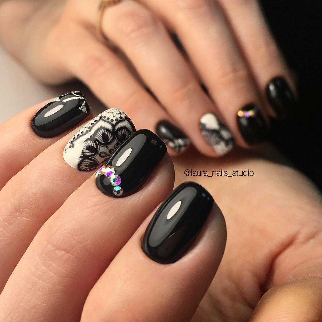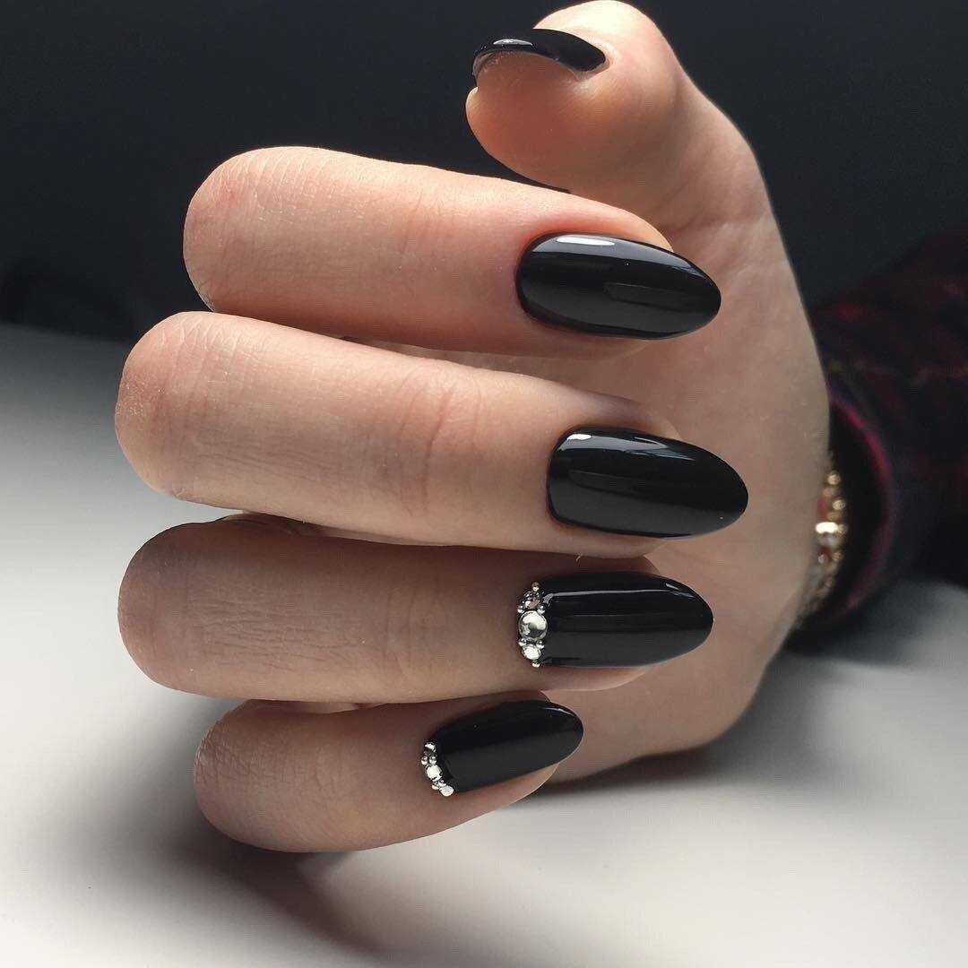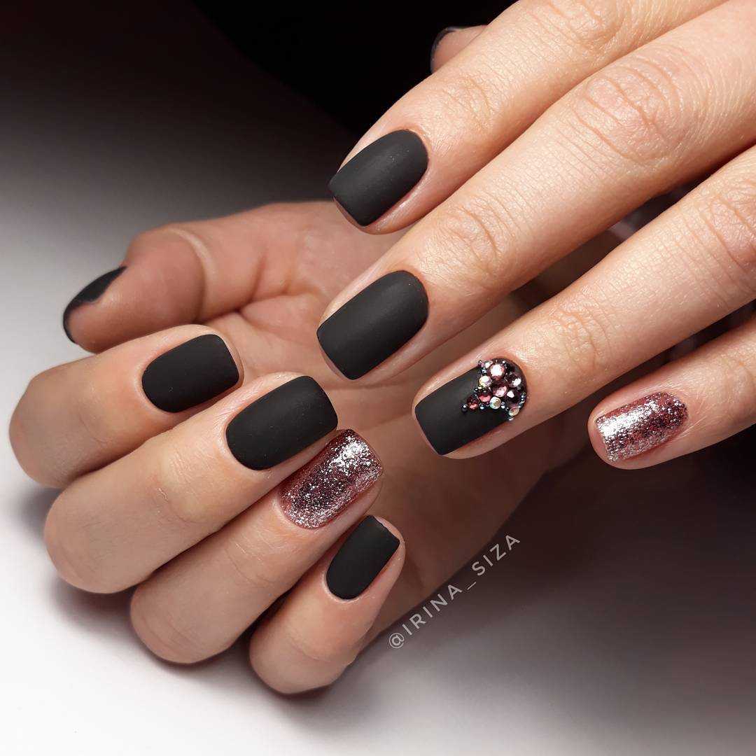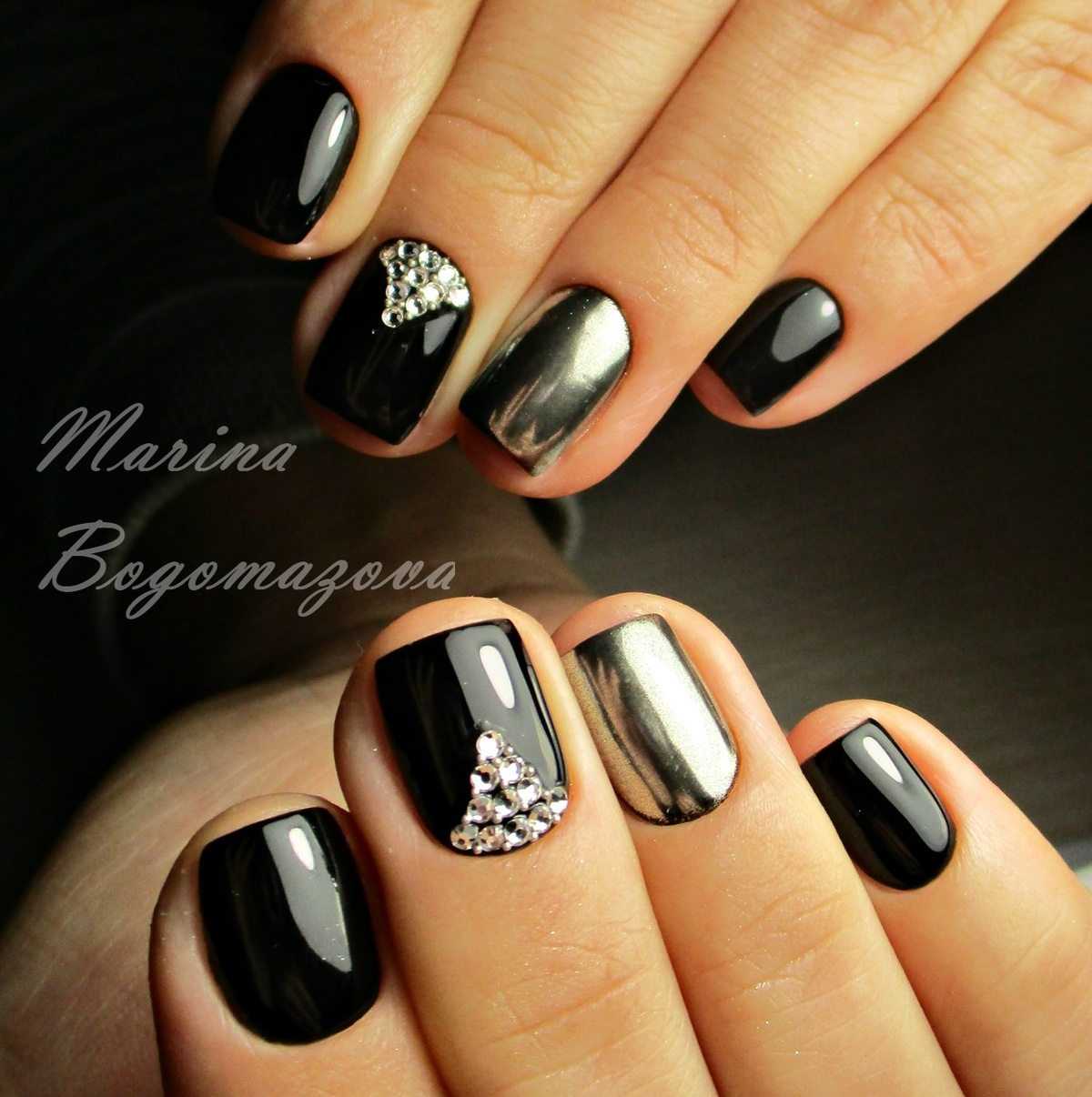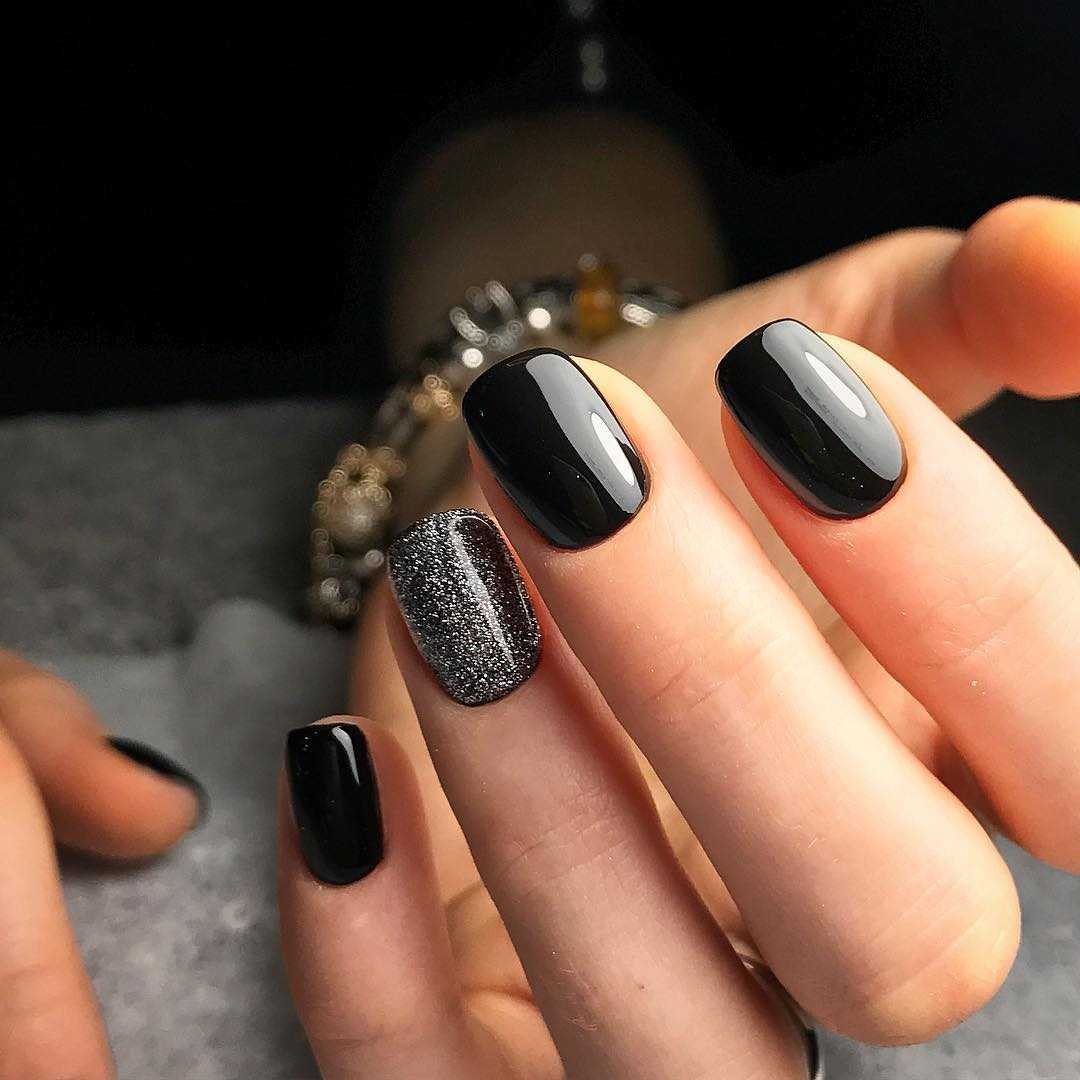 Украшенный золотым или серебряным глиттером, черный маникюр — шикарный вариант вечернего нейл-арта. Смотрится максимально эффектно и дорого.