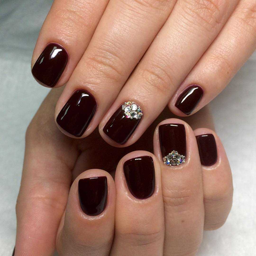 Прекрасный марсаловый маникюр, к которому добавлено несколько камушек на акцентные пальцы.