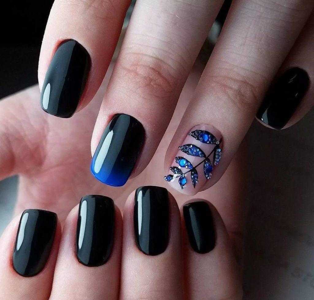 А вот маникюр синего цвета с серебристыми или разноцветными блестками — один из самых популярных вариантов зимнего и новогоднего маникюра. Кстати, ярко-синий маникюр — просто находка для коротких ногтей.