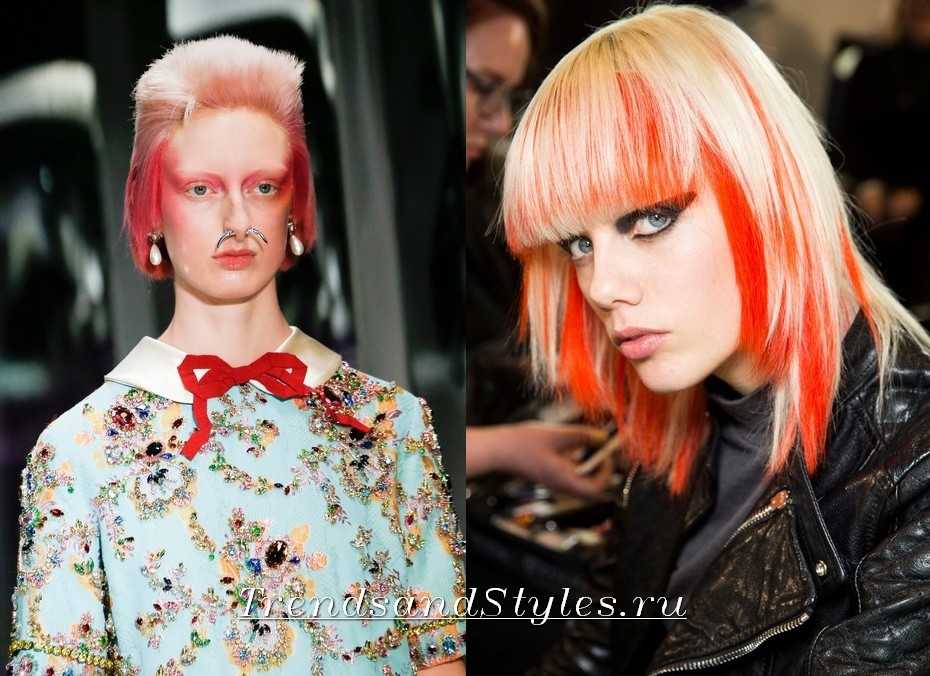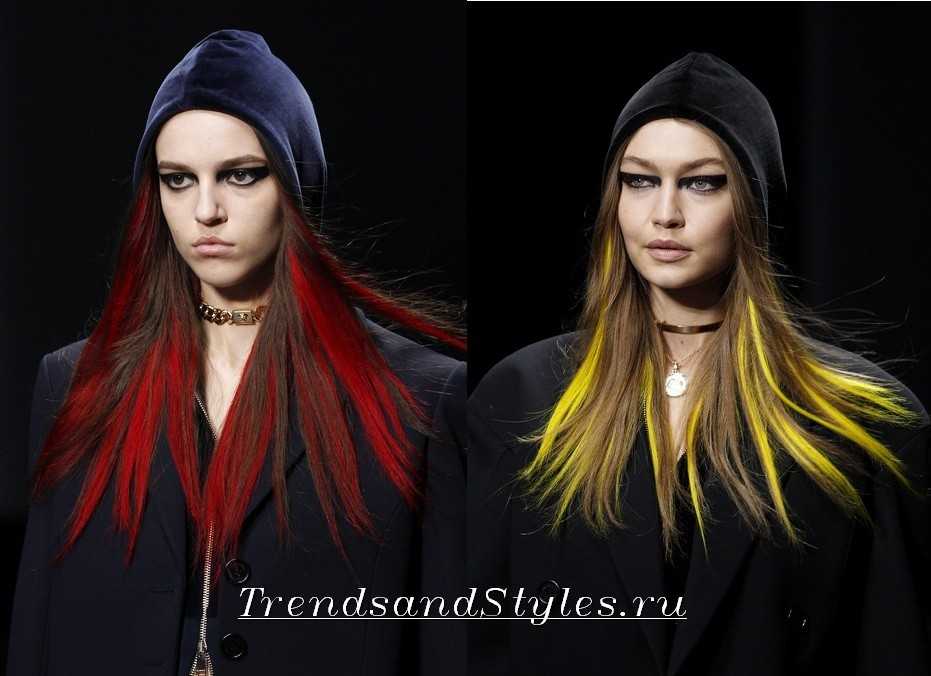 Разные оттенки прядей — еще один тренд сезона. Модные тенденции 2017-2018 (фото ниже) — красить их в яркие оттенки. Подойдет желтый, оранжевый, красный цвет краски, как у Versace и Gucci.