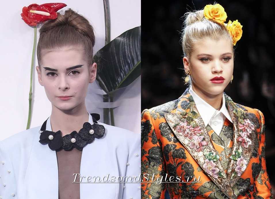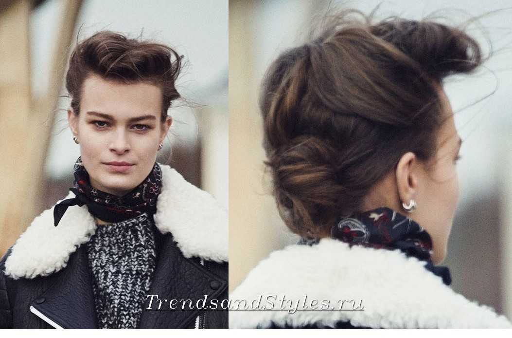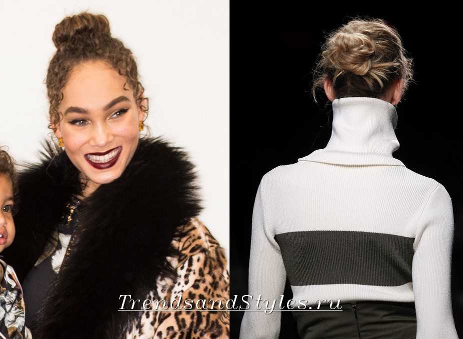 Все также в тренде остается пучок на макушке с распущенными прядями на затылке.
