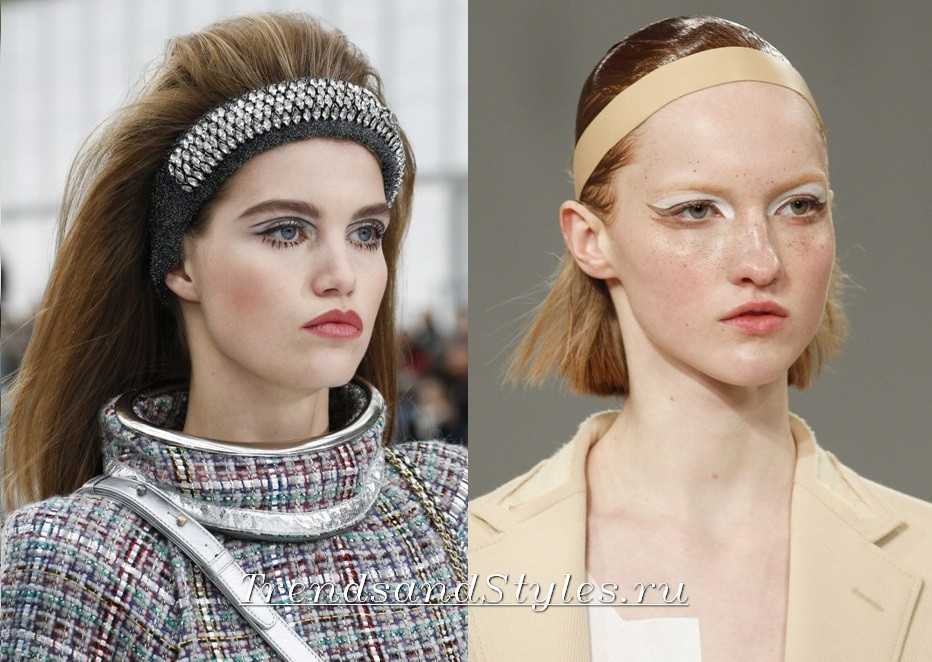Для более непринужденного и повседневного вида подойдут повязки на голову. Например, у Chanel они исполнены из блестящего трикотажа в сером цвете и украшенные бредовыми жемчужинами.