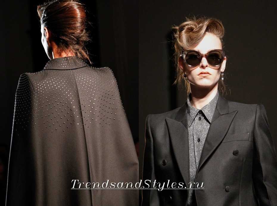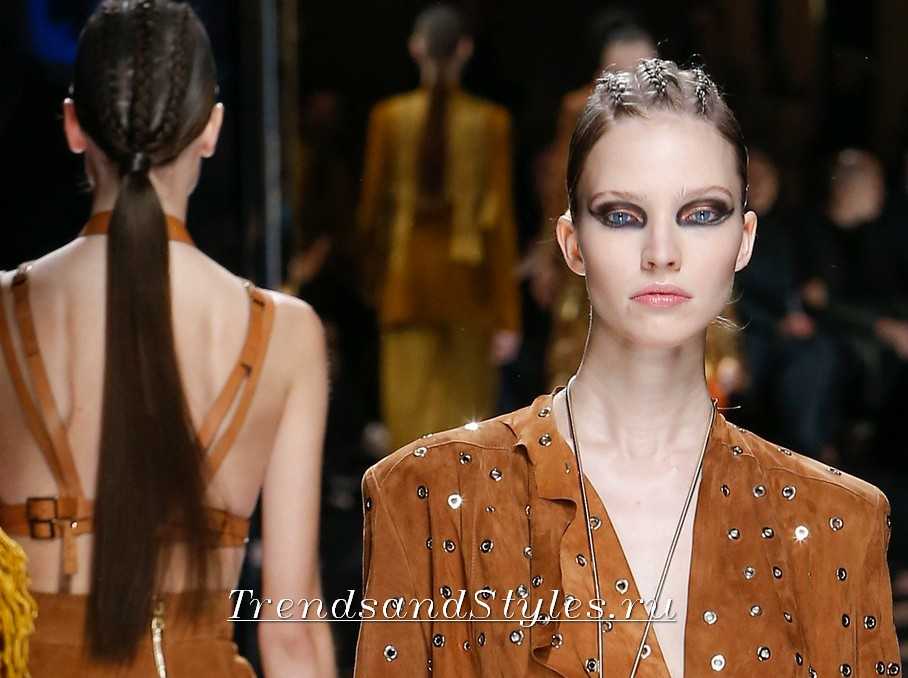 Проборы могут быть как центральными у Roberto Cavalli и Calvin Klein, так и косыми, максимально смещенными к виску у Elie Saab и Burberri. Широкие брови от Sonia Rikiel – необычный акцент для смещенного пробора. Использовать гель, чтобы получить идеально приглаженные пряди, кажущиеся мокрыми, предлагает Praba Gurung.