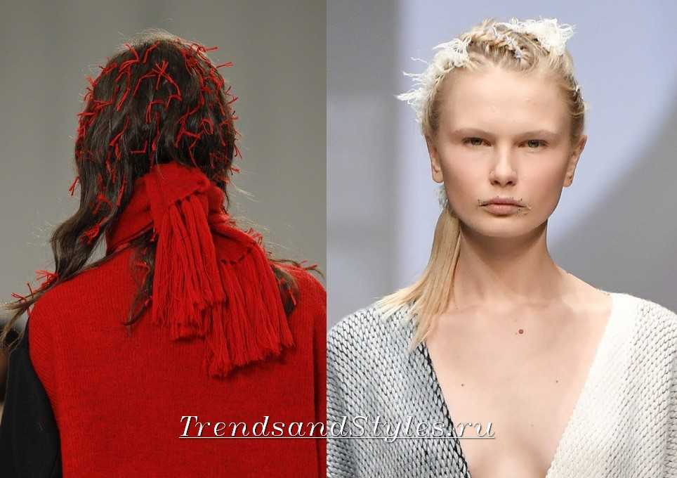 Простые нити для вязания способны преобразить любую модницу. Посмотрите на фото ниже. Модные женские прически с косичками или распущенными волосами смотрятся очень необычно.