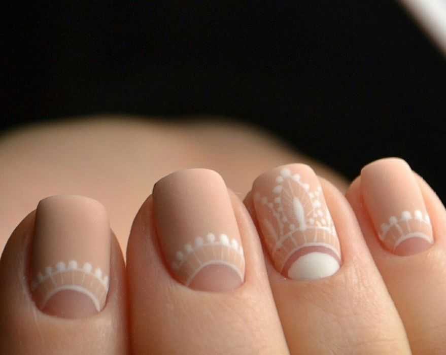 Как и во французском маникюре, в лунном белый полумесяц можно заменить кружевом, которое рисуется кистью, наносится с помощью стемпинг-трафаретов или вообще наклеивается. Главное чтобы у кружева сохранялась дугообразная форма.