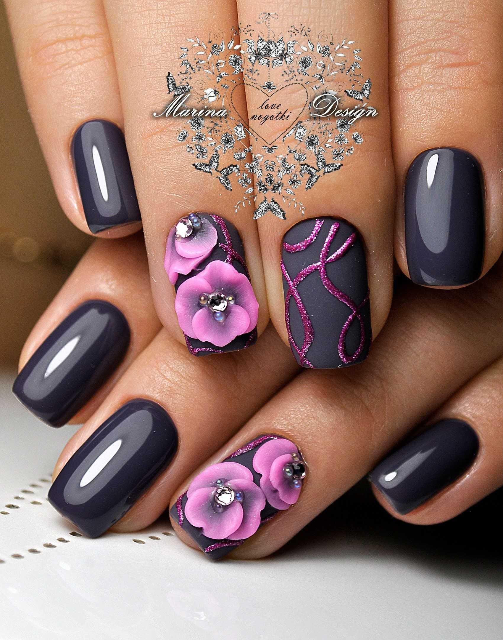 Очень оригинально смотрятся яркие цветочные акценты на глянцевом или матовом черном покрытии в сочетании с насыщенным основным оттенком маникюра.