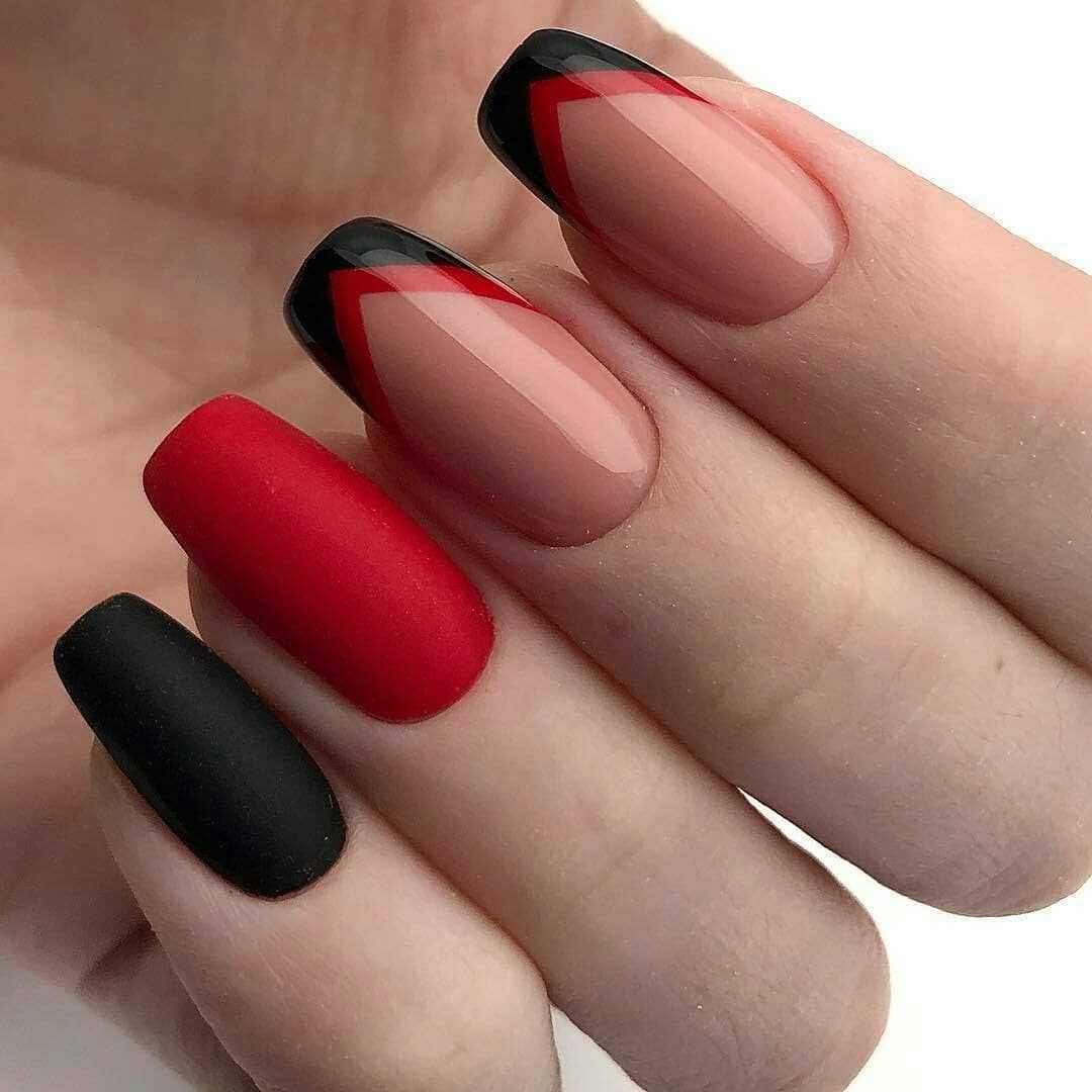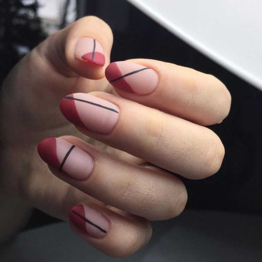 Как уже упоминалось выше, матовая текстура визуально успокаивает даже самые яркие оттенки. Красный – один из тех цветов, который эффектно выглядит на ногтях любой длины. С красным матовым гель-лаком можно поэкспериментировать, что кстати, не рекомендуется делать с черным цветом. Например:
