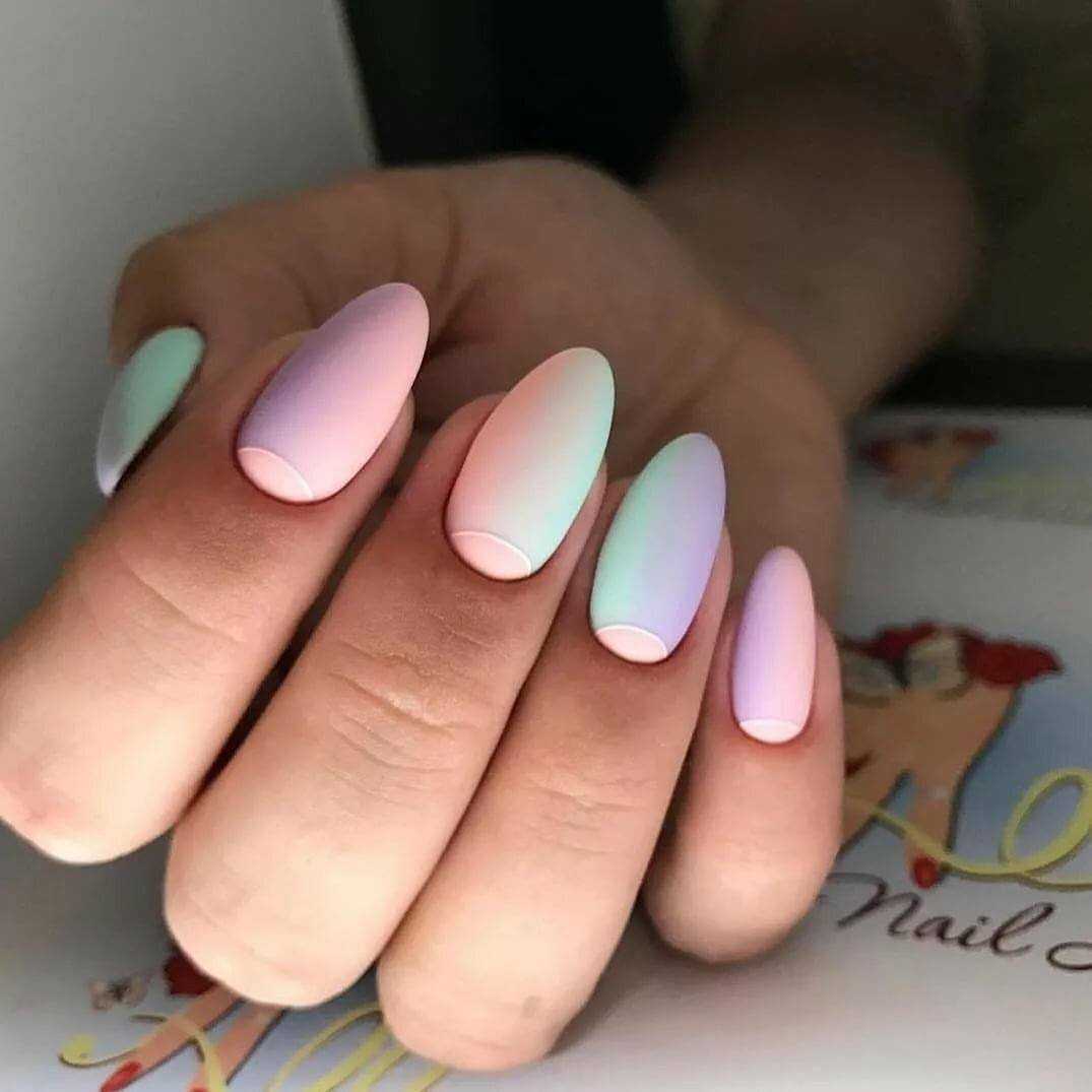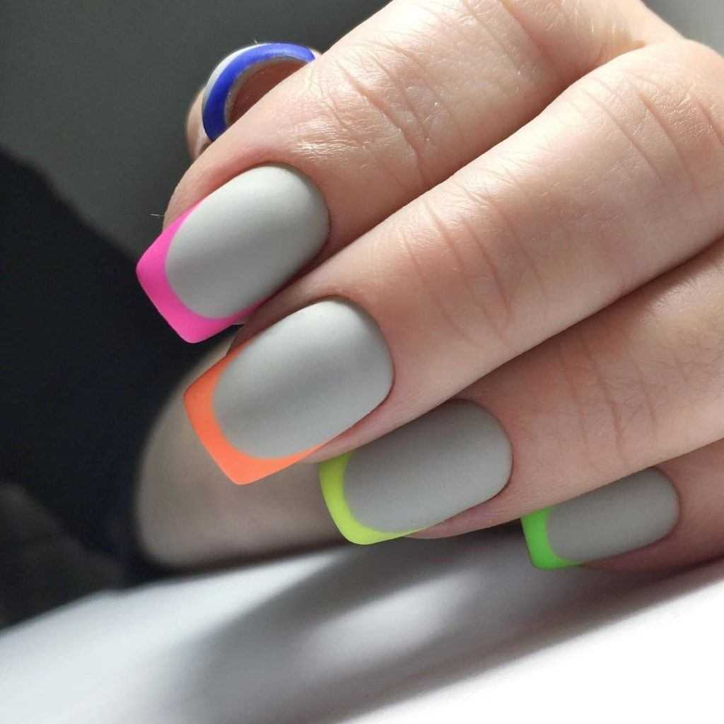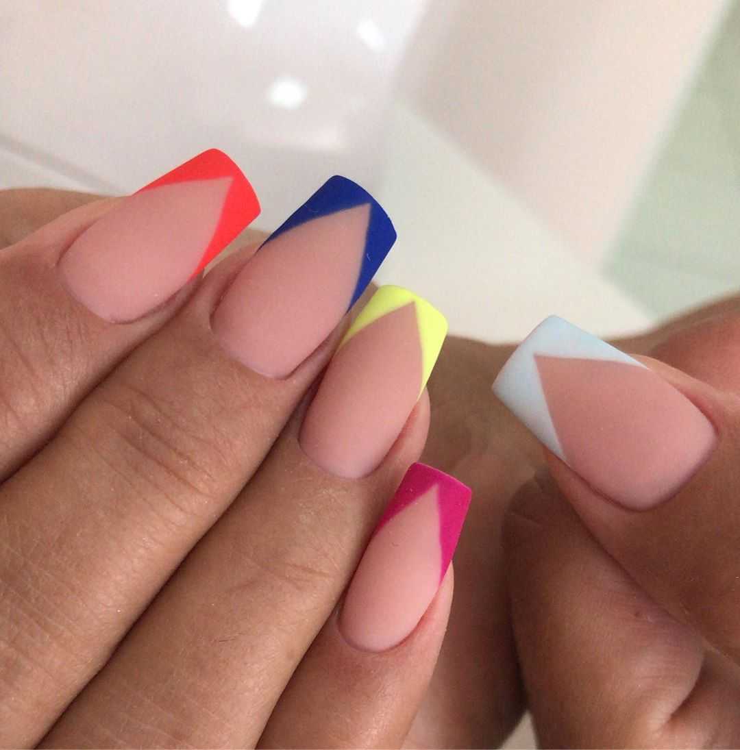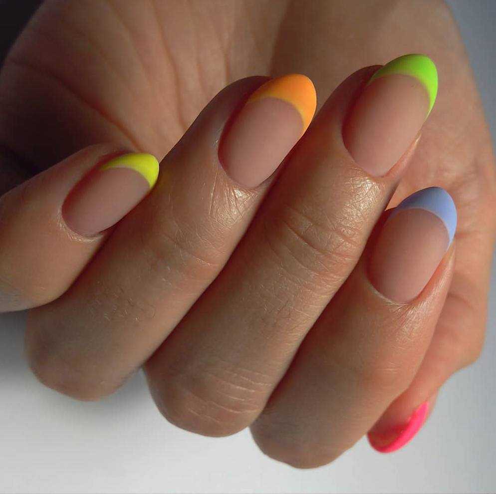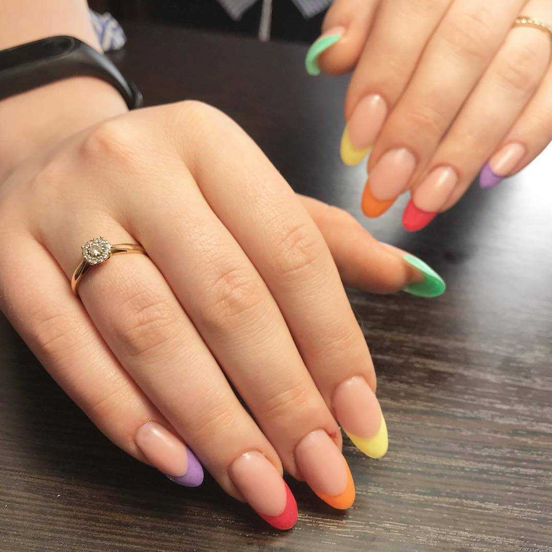 С французским маникюром нередко комбинируют радужный дизайн. Это плавный переход оттенков для которого используются все цвета радуги. В результате получается яркий, свежий маникюр — идеальный вариант на лето.