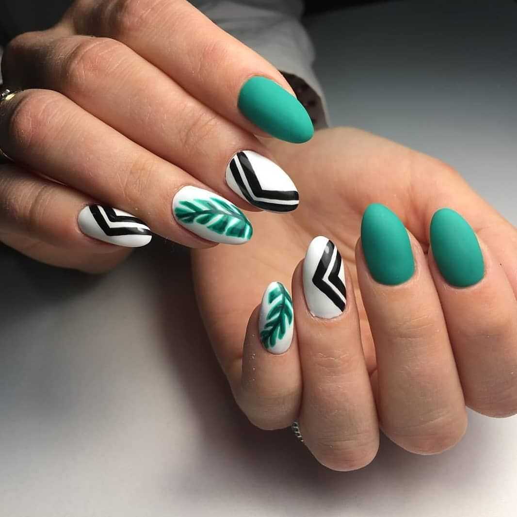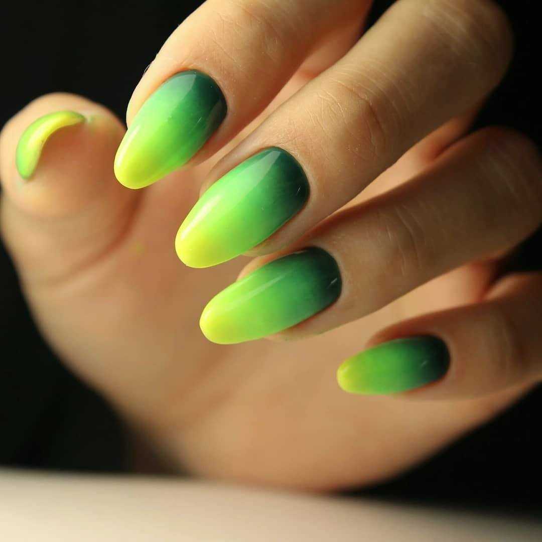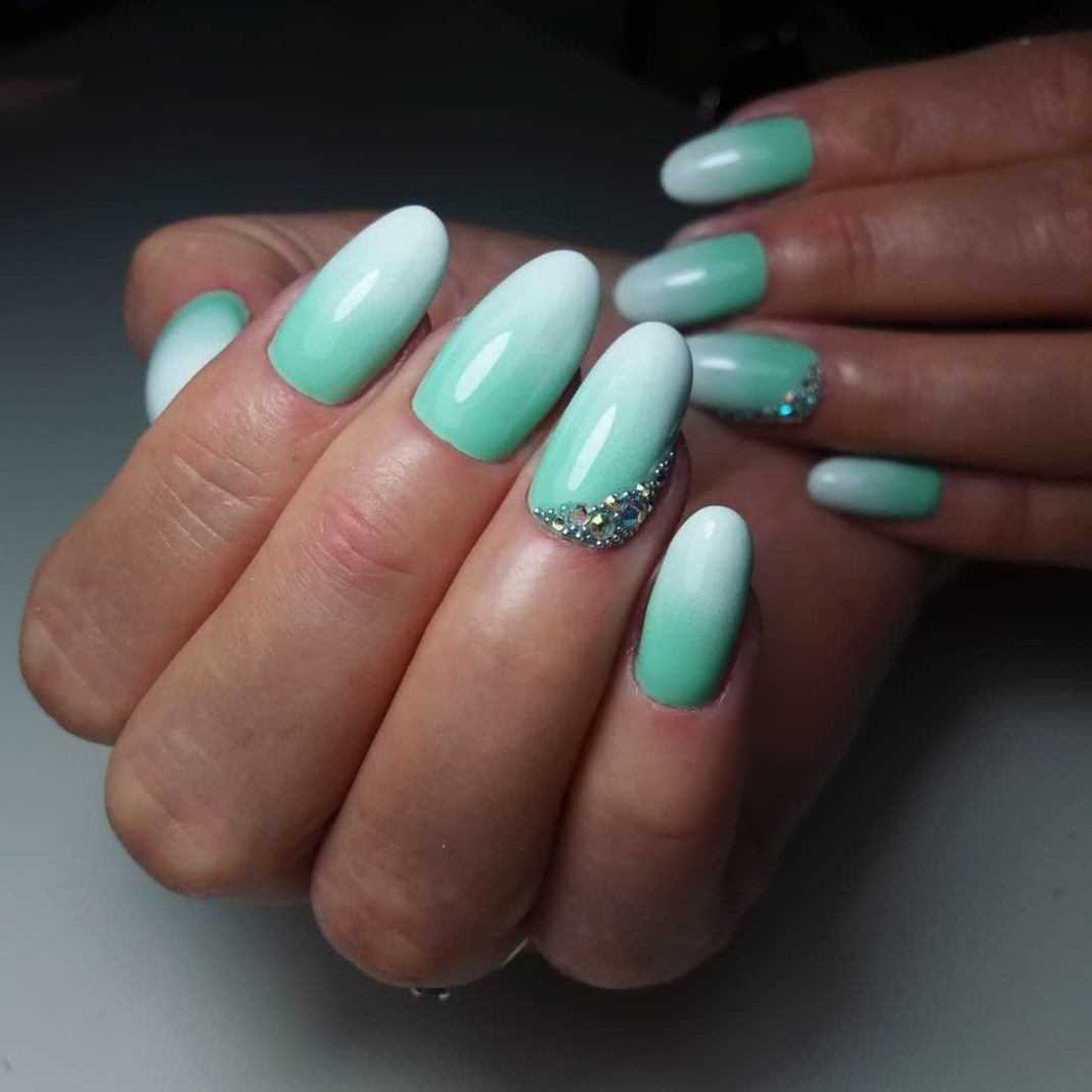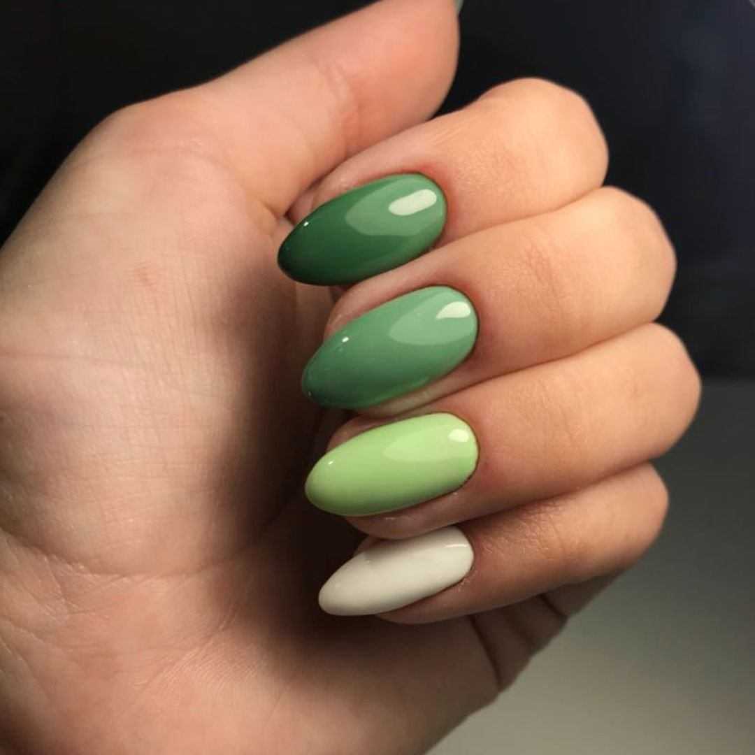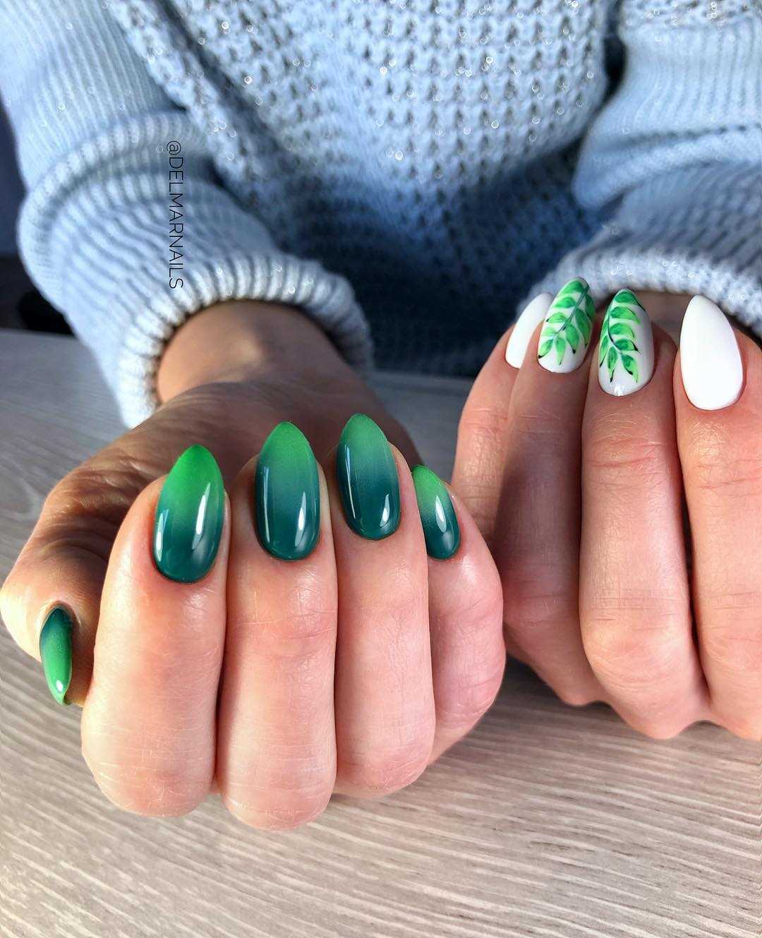 Разнообразие зеленых оттенков позволяет создавать интересные нейл-арты в технике омбре. При этом можно использовать как темные тона, например, сочетать зеленый с черным цветом, так и светлые оттенки. Особенно красиво выглядит сочетание зеленого с бирюзовым, небесно-голубым и другими мягкими тонами.