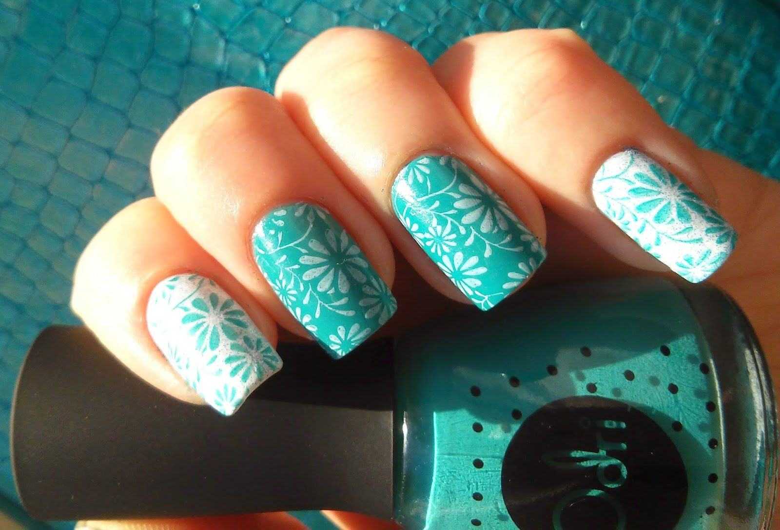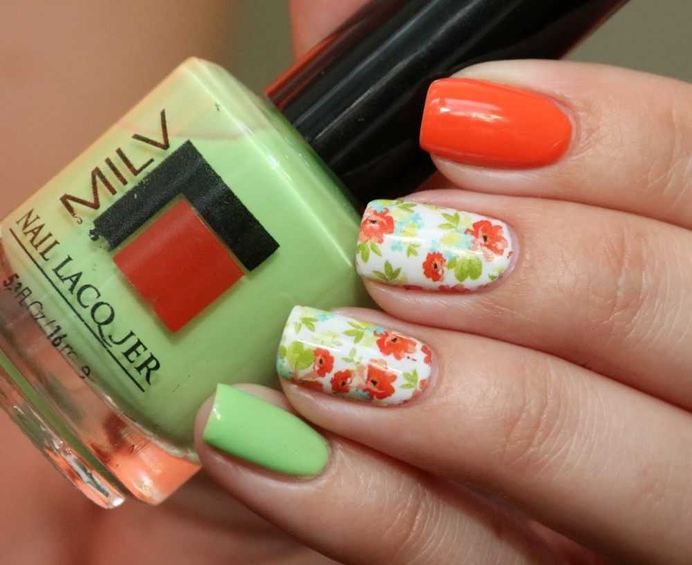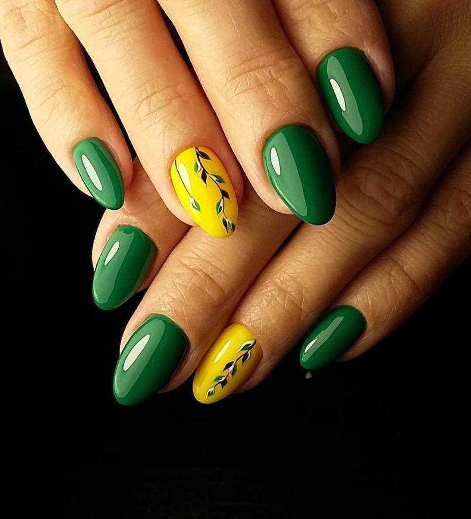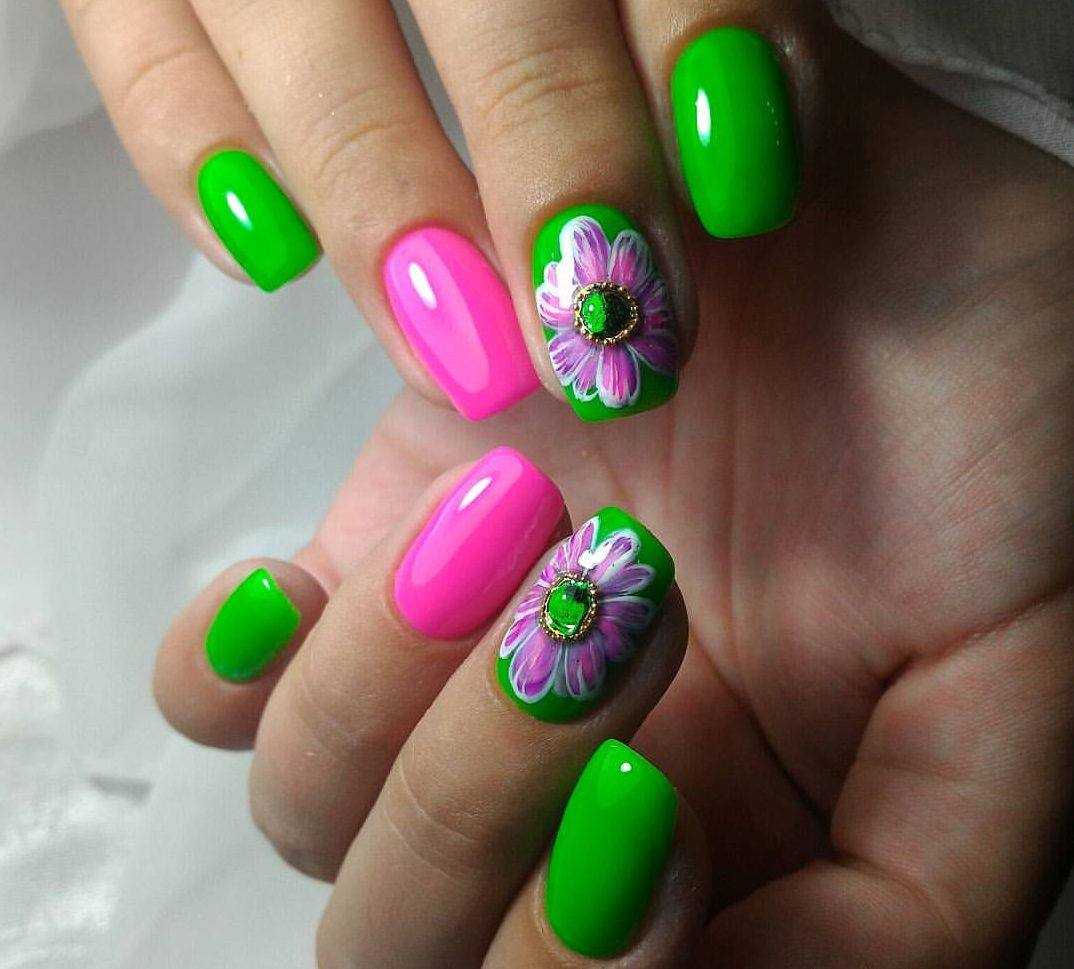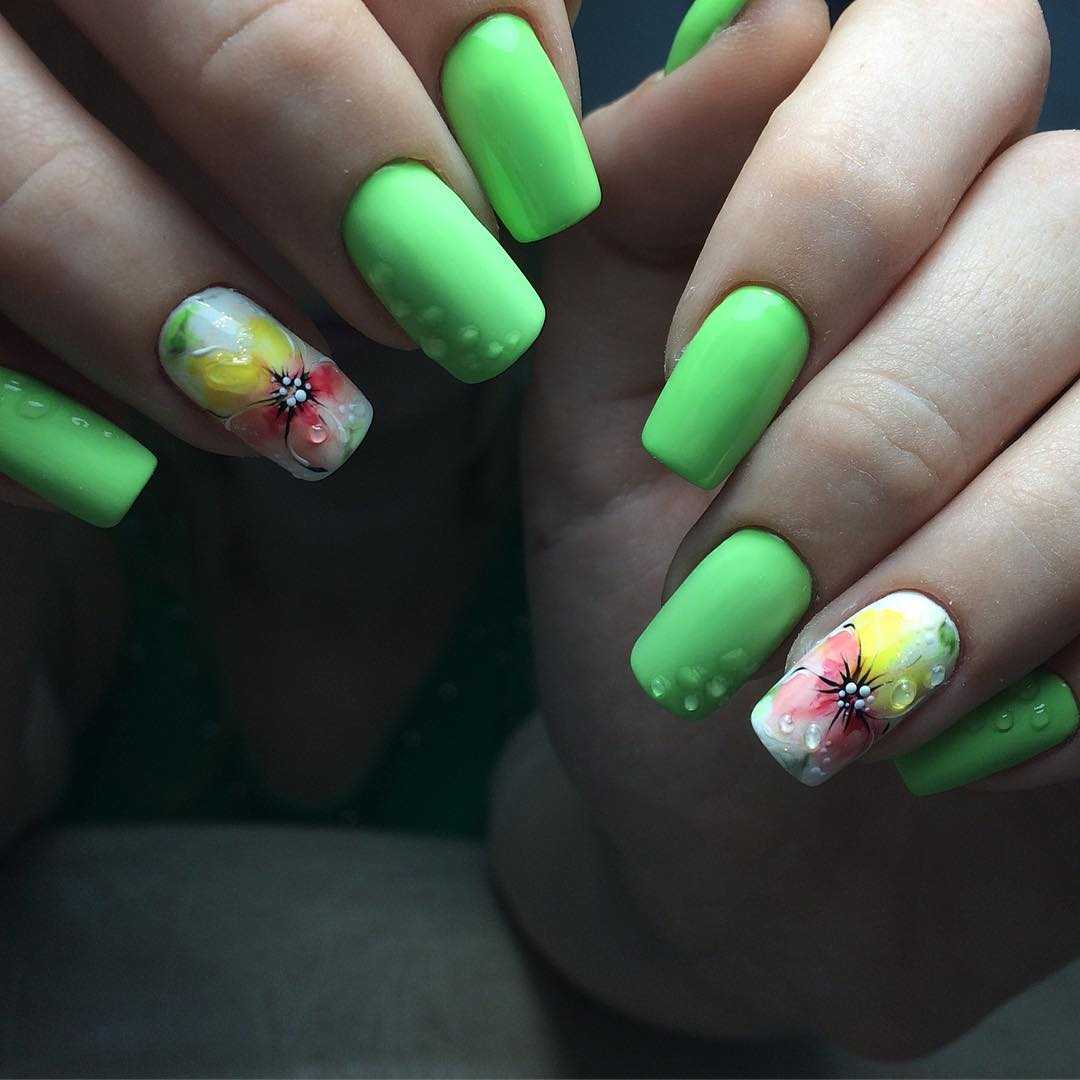 Цветочки, листики и веточки идеально сочетаются с зеленой основой ноготков. Наиболее актуален такой дизайн для летнего и весеннего времени года. Для выполнения флористических рисунков на зеленом фоне можно использовать белый, красный, желтый, розовый или пурпурный цвет. Цветочными рисунками можно украсить всего один или несколько ноготков в виде акцента. В качестве декора для данного дизайна можете смело использовать камни, стразы, втирку или акриловую пудру. Зеленый маникюр с цветами удачно сочетать с другими техниками выполнения нейл-арта, например, французским маникюром, геометрическим дизайном или стемпингом.
