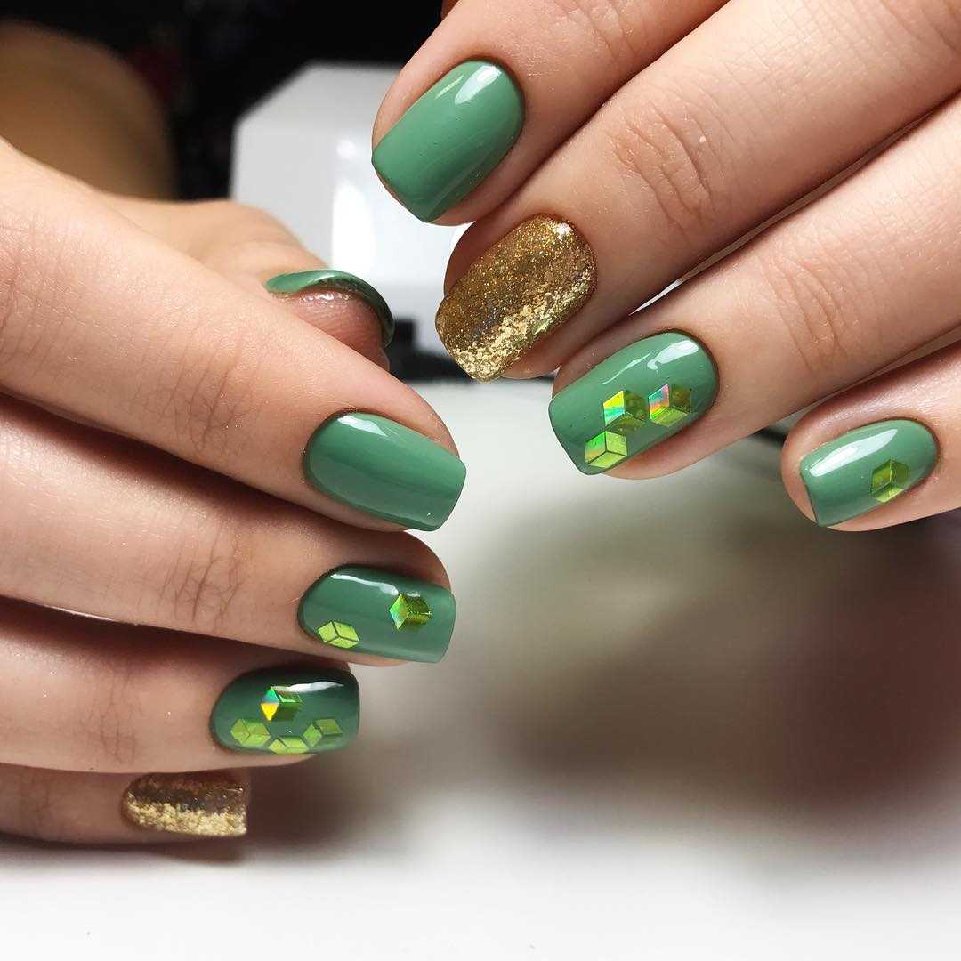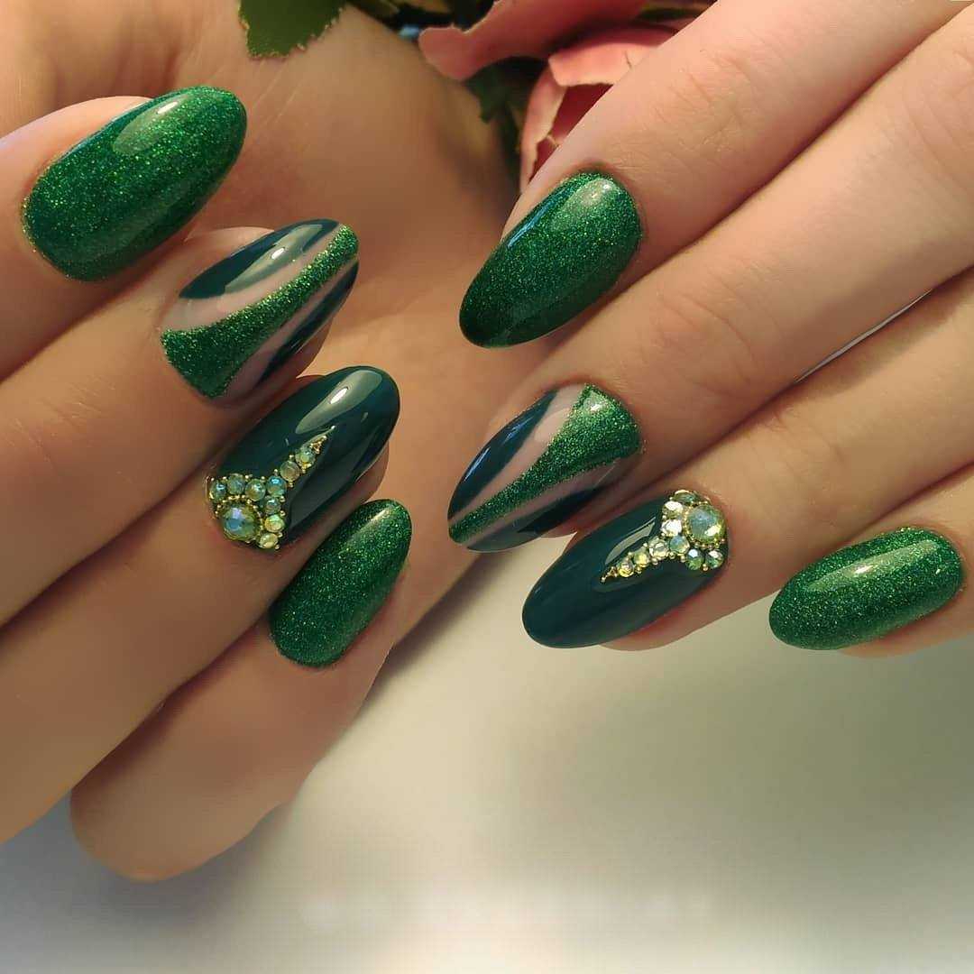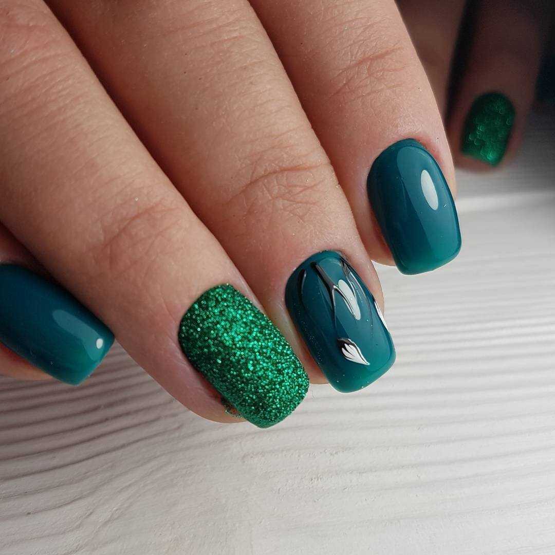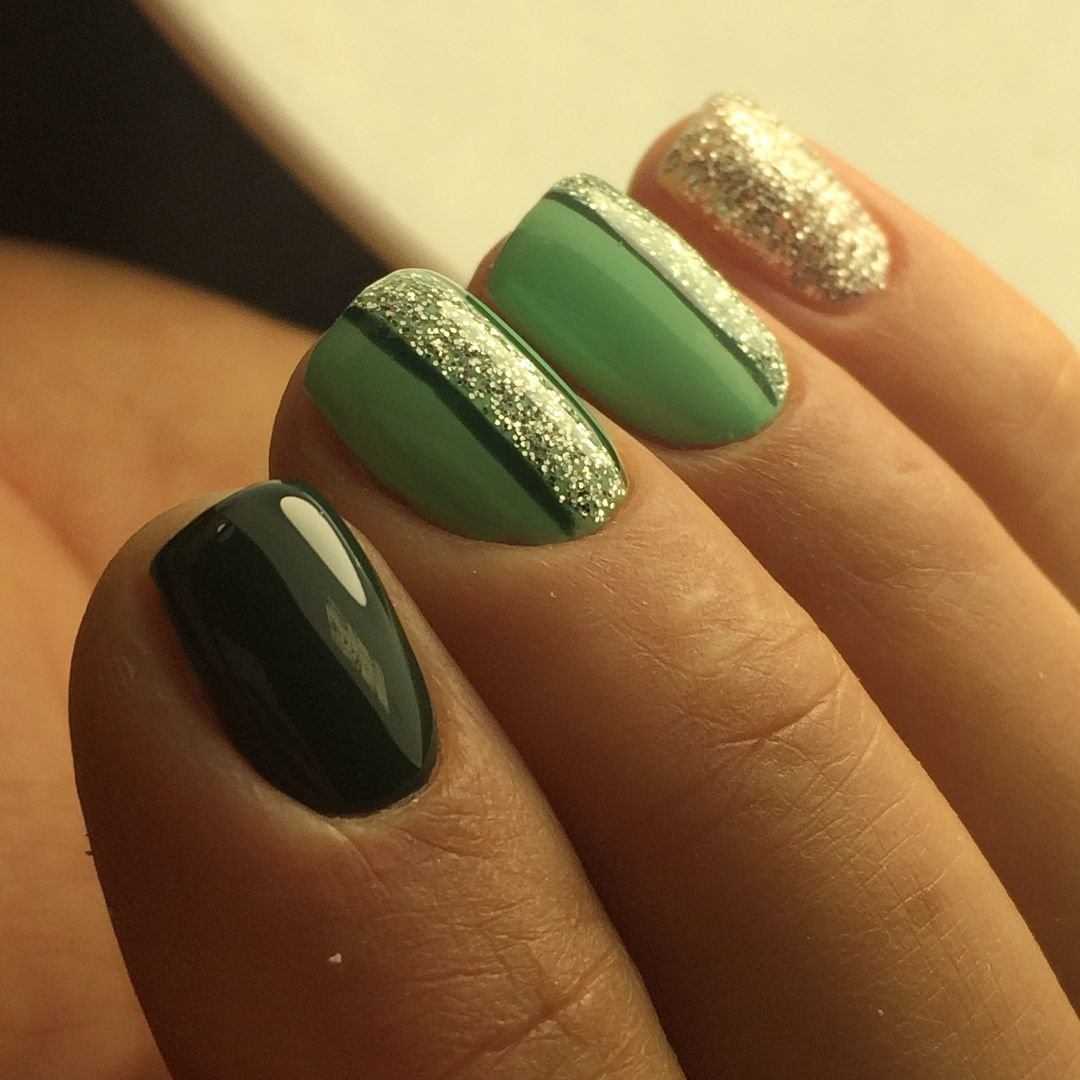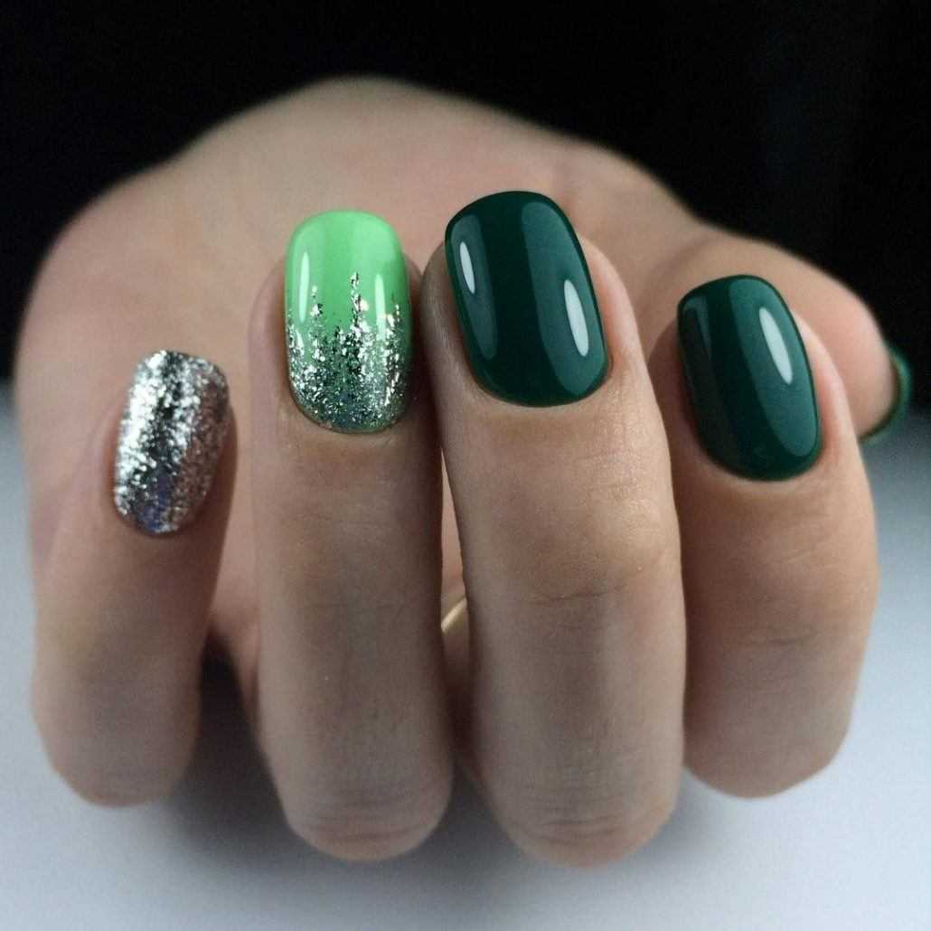 Золото хорошо смотрится на теплых оттенках зеленого, а серебряный глиттер лучше всего сочетается с холодными тонами, такими как изумруд.