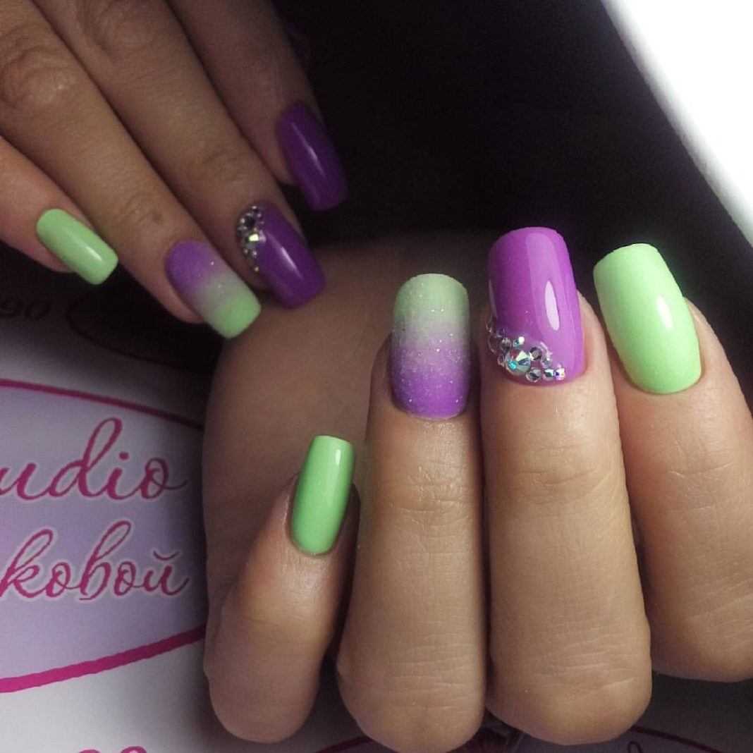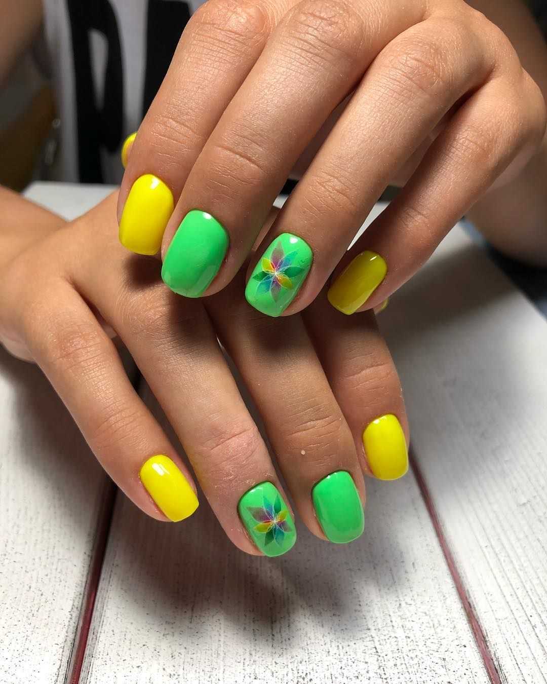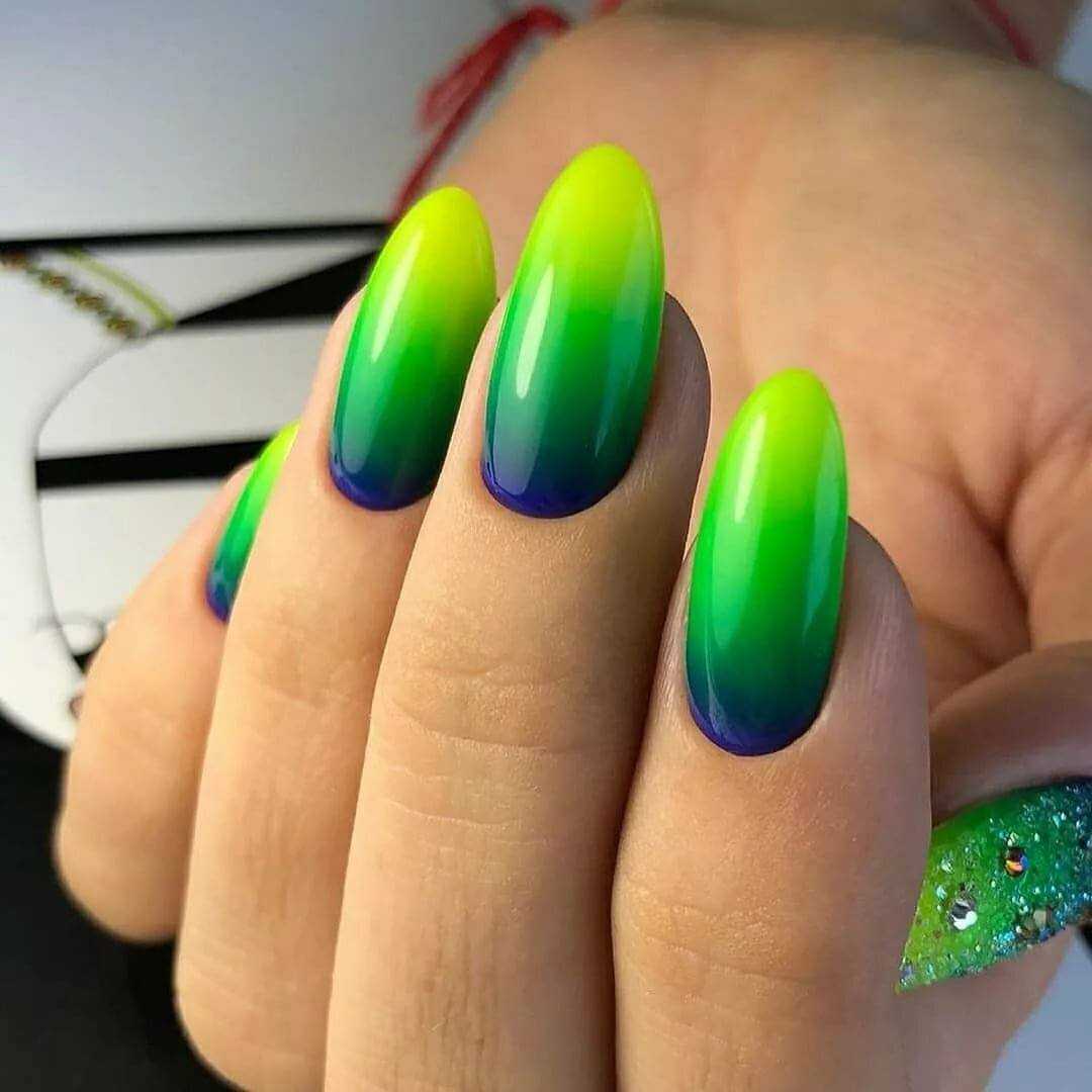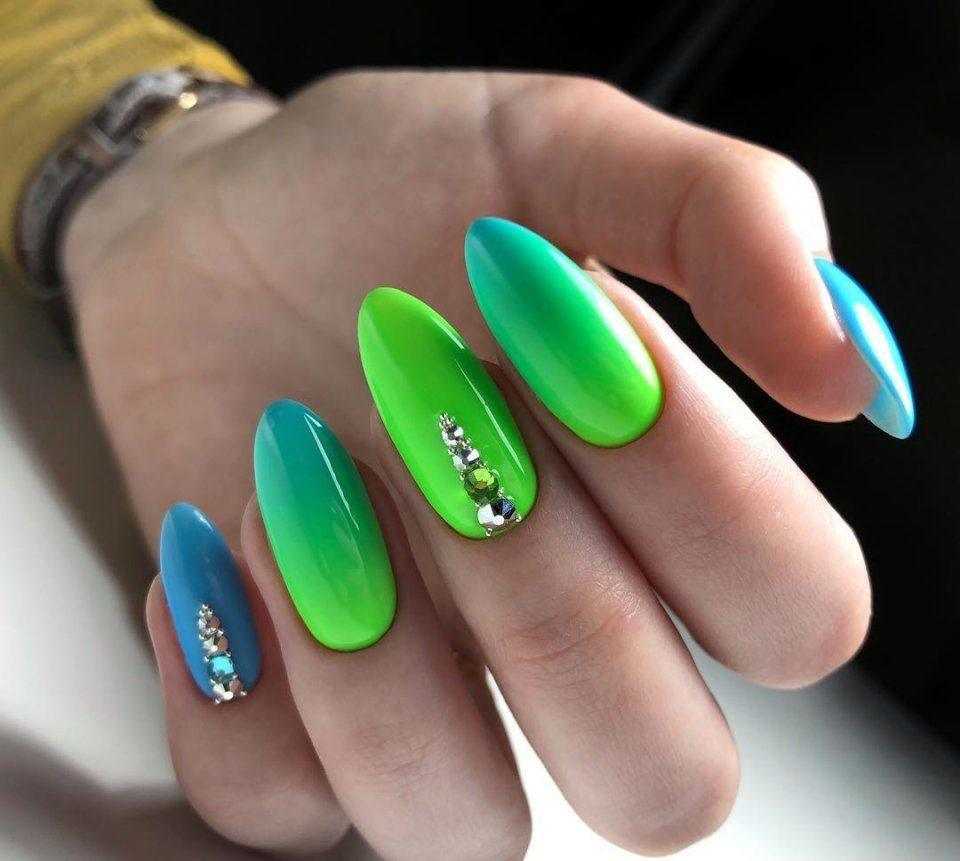 Такое сочетание цветов в маникюре встречается не часто, однако результат подобного дуэта весьма впечатляет. Именно поэтому дизайнеры в этом году советуют модницам, поближе присмотреться к интересным идеям оформления ноготков в такой тональности, ведь тандем синего и зелёного в 2020 году признан «писком» моды. Одним из суперстильных вариантов, который смотрится очень ярко и необычно, считается сочетание тёмного синего покрытия и неоново-зелёных рисунков. Не менее впечатляет градиентный переход зелёного и светло-синего. Если вы предпочитаете более неброский маникюр, отдайте предпочтение пастельным оттенкам.