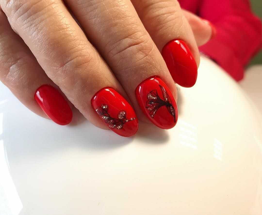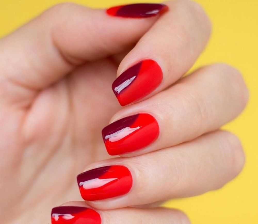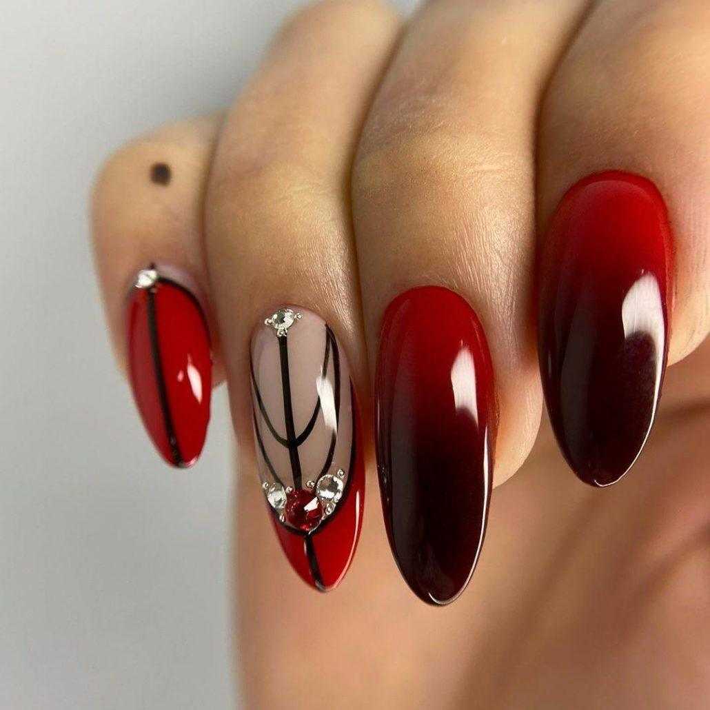 Также красный цвет нередко используют в качестве основы для градиентного дизайна. Плавный переход оттенков от красного к черному тону – стильное решение для самых смелых модниц. Дополнительным украшением такого маникюра часто являются стразы, блестки или небольшое количество пигмента.