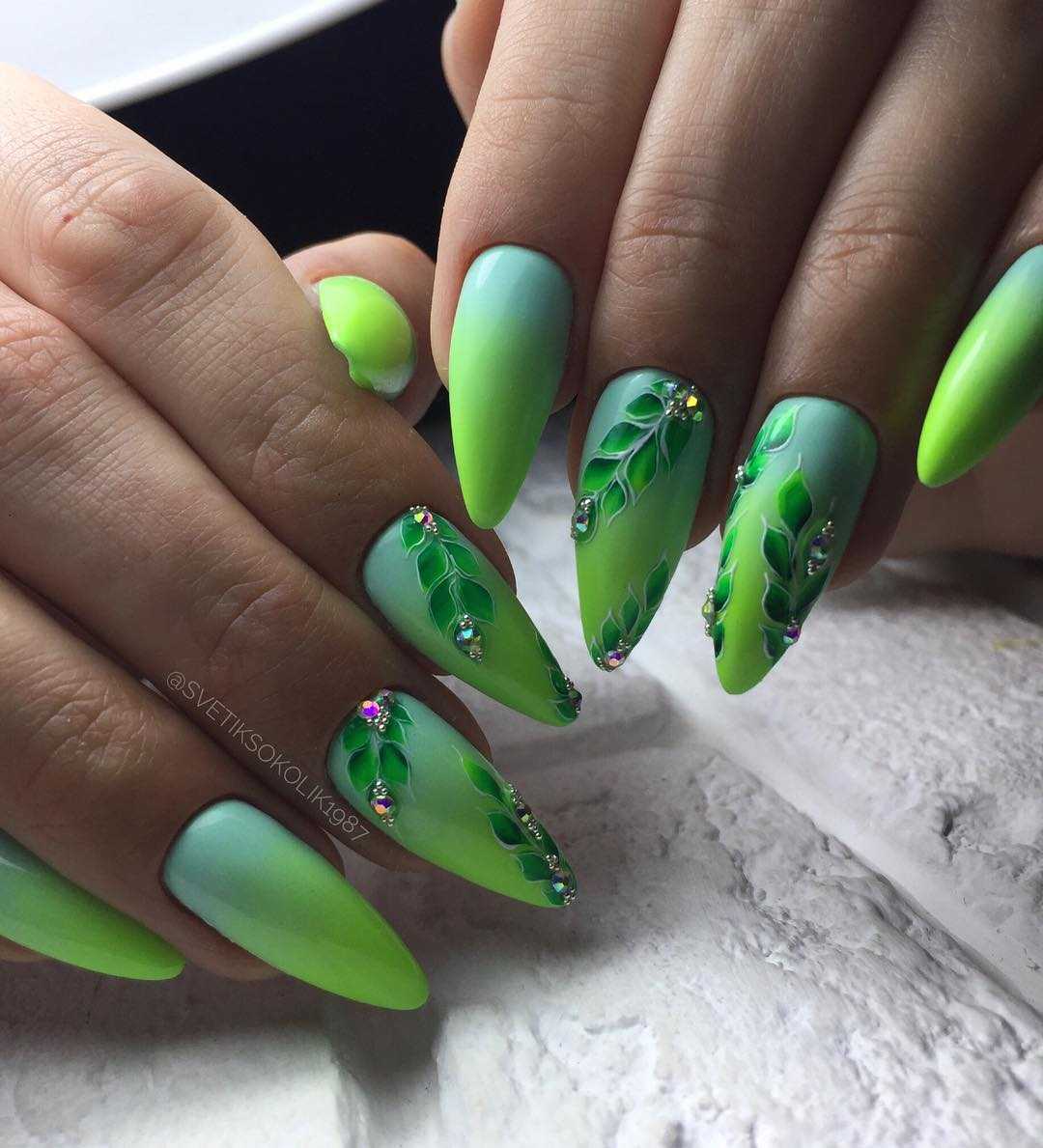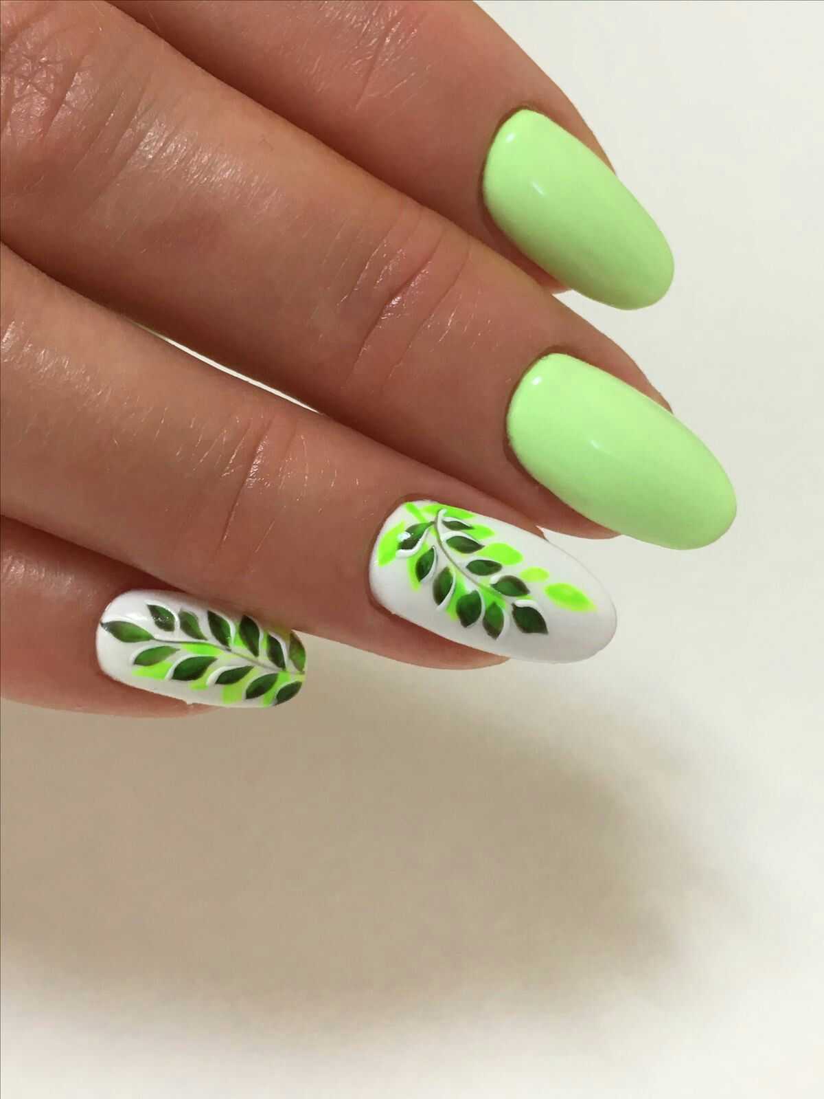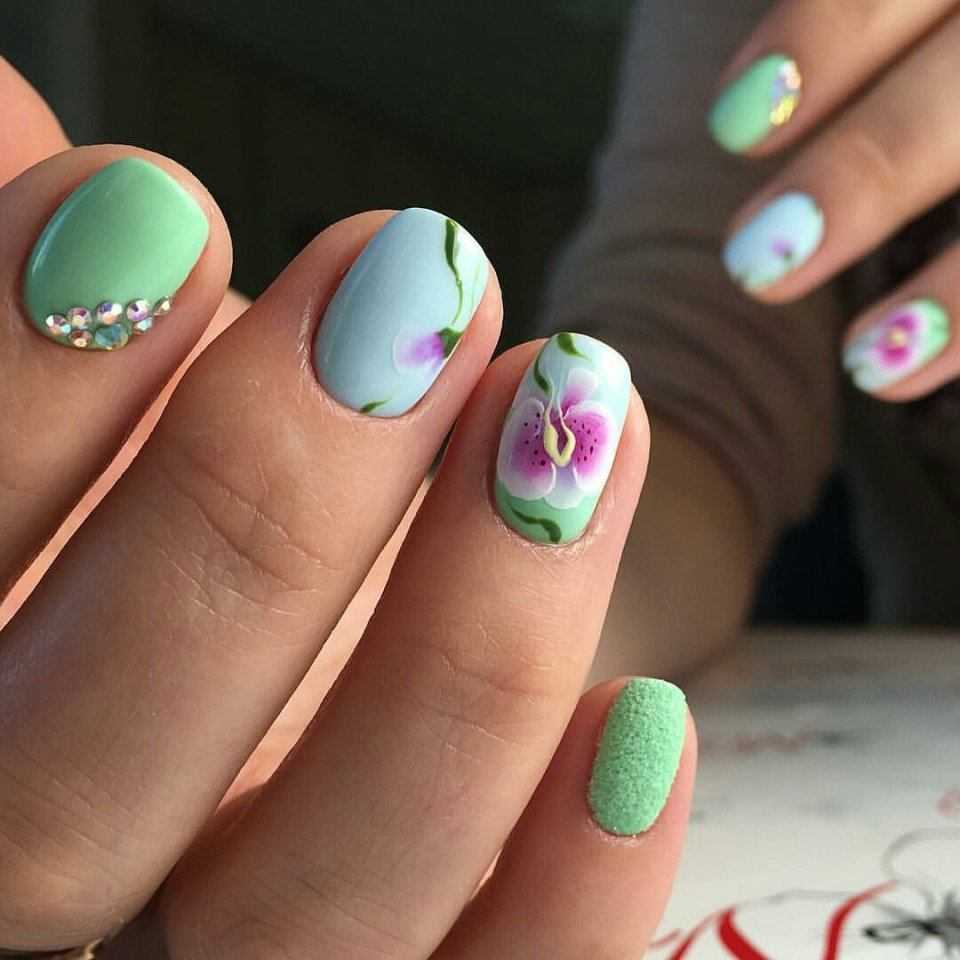 ВЕСЕННИЙ МАНИКЮР В ЗЕЛЕНЫХ ТОНАХ С ЦВЕТАМИ И ВЕТОЧКАМИ