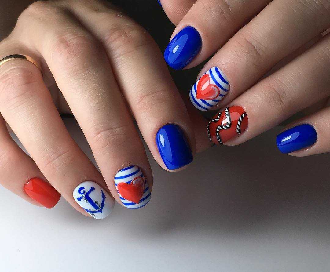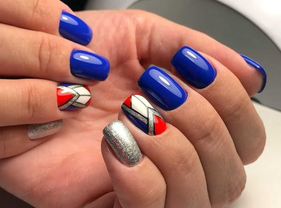 В мире моды синий цвет уже давно считается базовым и прекрасно демонстрирует своё благородство в различных сочетаниях с другими оттенками. Эти качества прекрасно просматриваются в коллекциях одежды модных дизайнеров и конечно маникюре, поэтому нейл-мастера постоянно экспериментируют и создают потрясающие новинки. Варианты сочетания синего во многом зависят от времени года. В осенне-зимний период комбинации синего покрытия с другими оттенками не отличаются особой яркостью и в большинстве примеров это компания с белым лаком, золотом или серебром. Для сочетания синего маникюра в весенне-летний период актуальны розовый, красный, бежевый, жёлтый или оранжевый цвета. Рассыпчатые блёстки, втирка, дизайн с рисунками, геометрические фигуры или элементы «негативного пространства» лишь подчеркнут оригинальность подобных примеров оформления.
