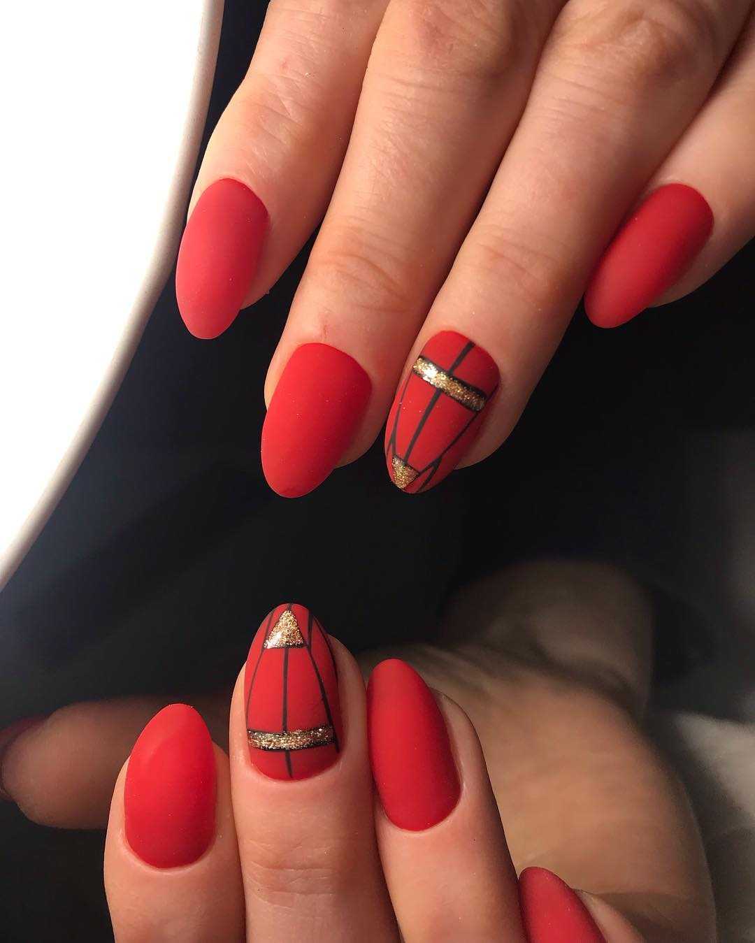 Для вечернего маникюра можно выделить акцентный пальчик яркими переливами, но в дневном варианте тандем смотрится лаконично, если на матовую поверхность лака нанести несколько золотистых прожилок.