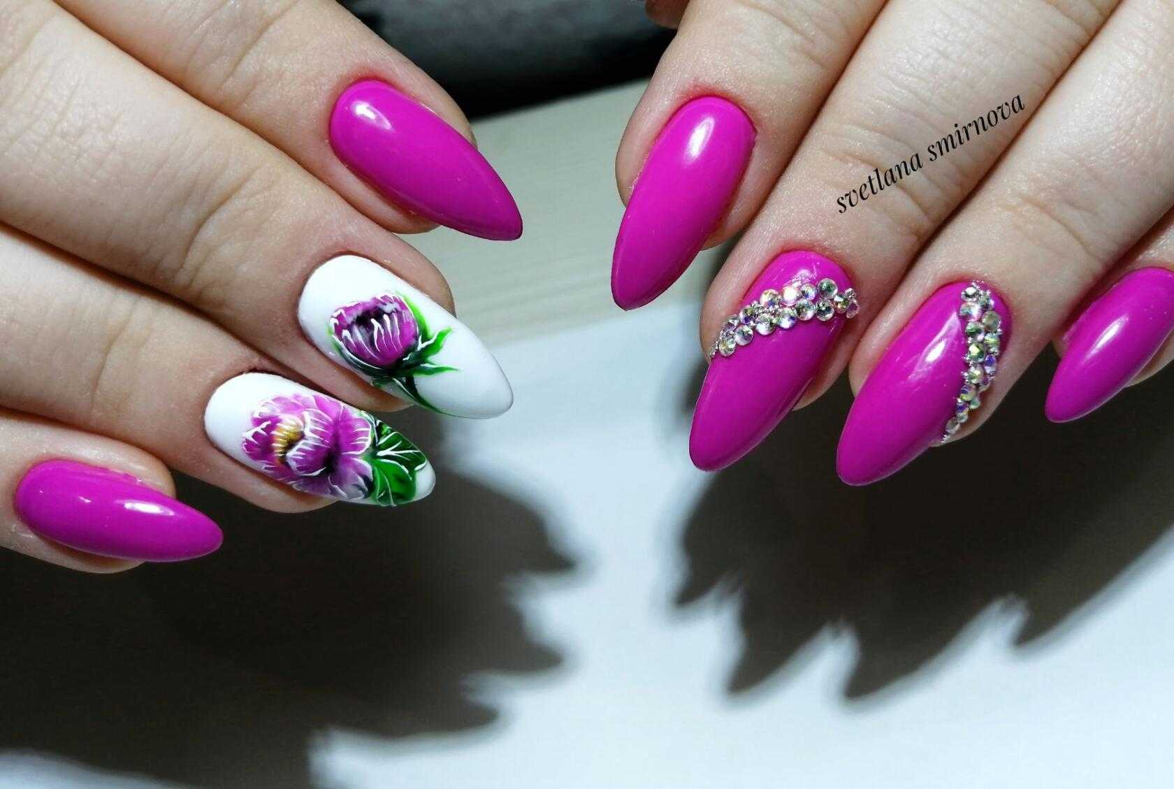 Чтобы рисунки на ногтях смотрелись по-особенному шикарно, попросите мастера изобразить цветы на ногтях в стилистике акварель. Подобный эффект достигается путём использования в процессе нанесения изображений акварельных красок, благодаря которым опытный специалист при помощи тонкой маникюрной кисти создаёт настоящие шедевры. Также для этих целей используется техника рисования «по-мокрому», когда акварельные разводы достигаются путём нанесения узоров на непросохшее покрытие. Цветочные композиции в таком исполнении смотрятся особенно нежно и изысканно. Блёстками можно выделить некоторые детали растительности, а можно полностью покрыть ноготок прозрачным лаком со сверкающими частицами.