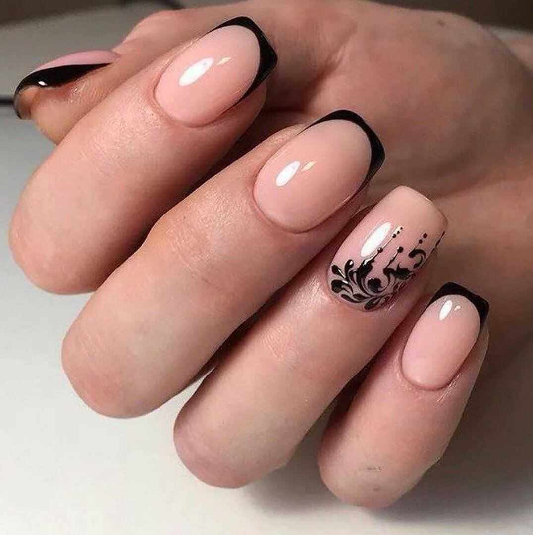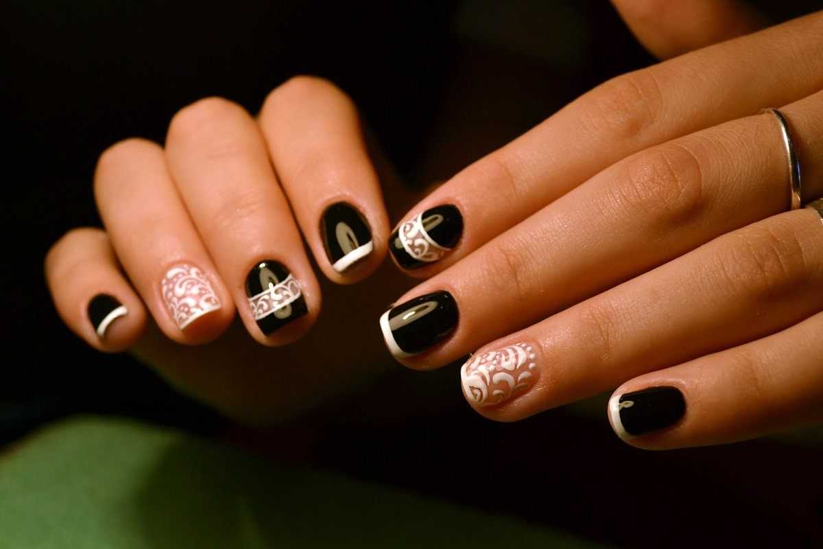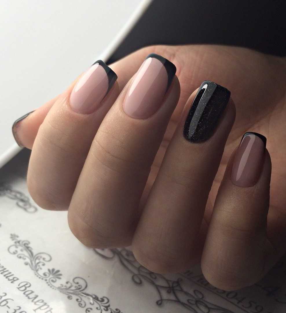 Также черный и золотой цвет можно нанести на линию улыбки. То есть черный цвет выступает в качестве основы. А золотой лак или декор является акцентом во всем дизайне. Такой маникюр подчеркивает изысканность образа, поэтому его делают довольно часто.