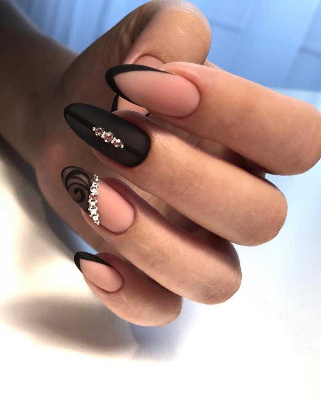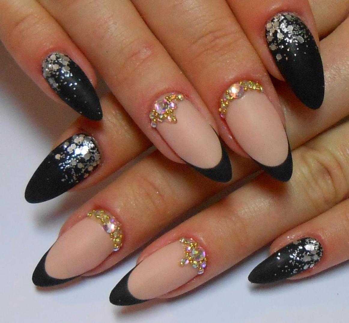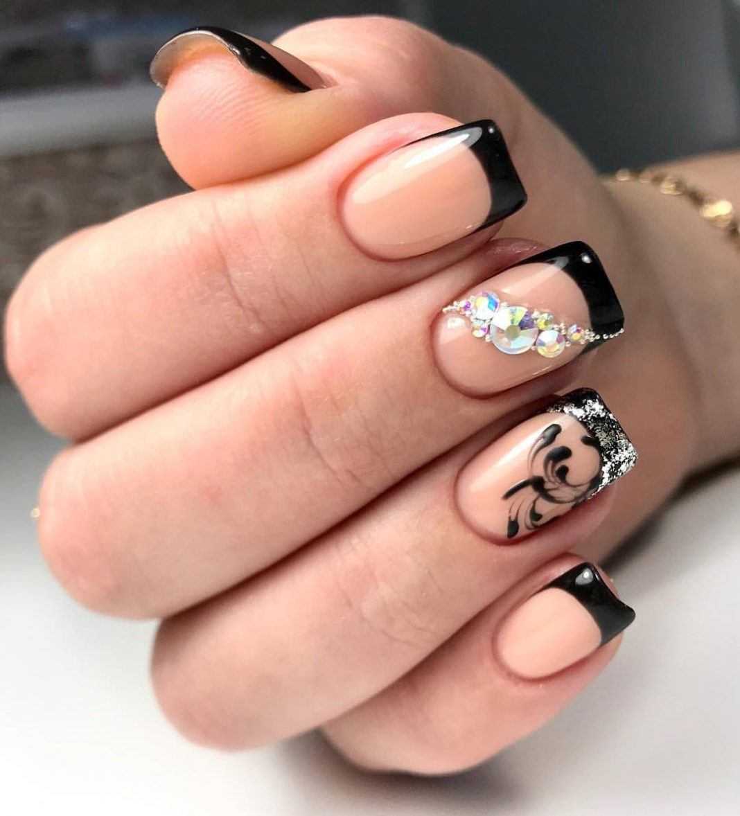Также черный и золотой цвет можно нанести на линию улыбки. То есть черный цвет выступает в качестве основы. А золотой лак или декор является акцентом во всем дизайне. Такой маникюр подчеркивает изысканность образа, поэтому его делают довольно часто.