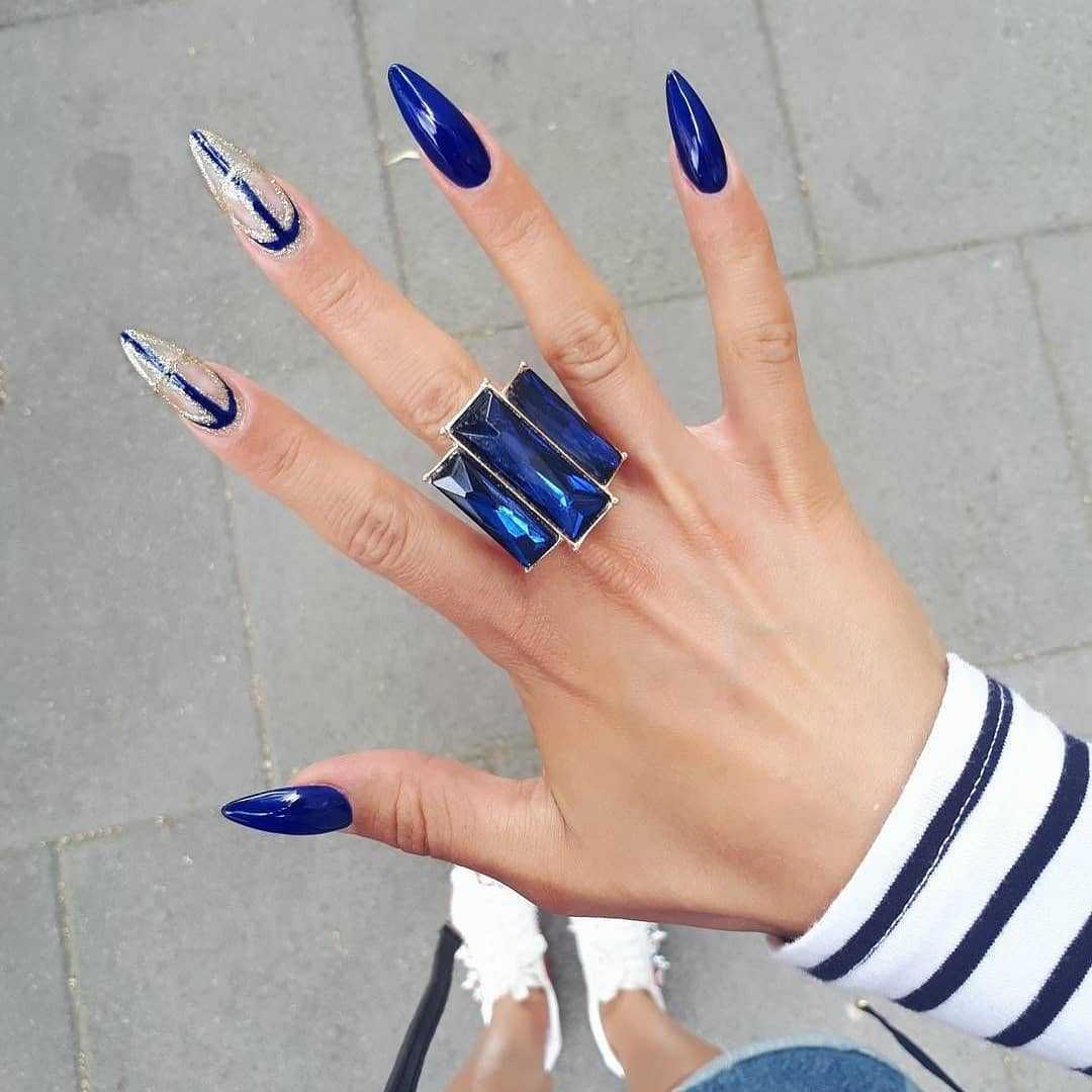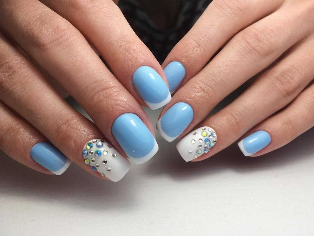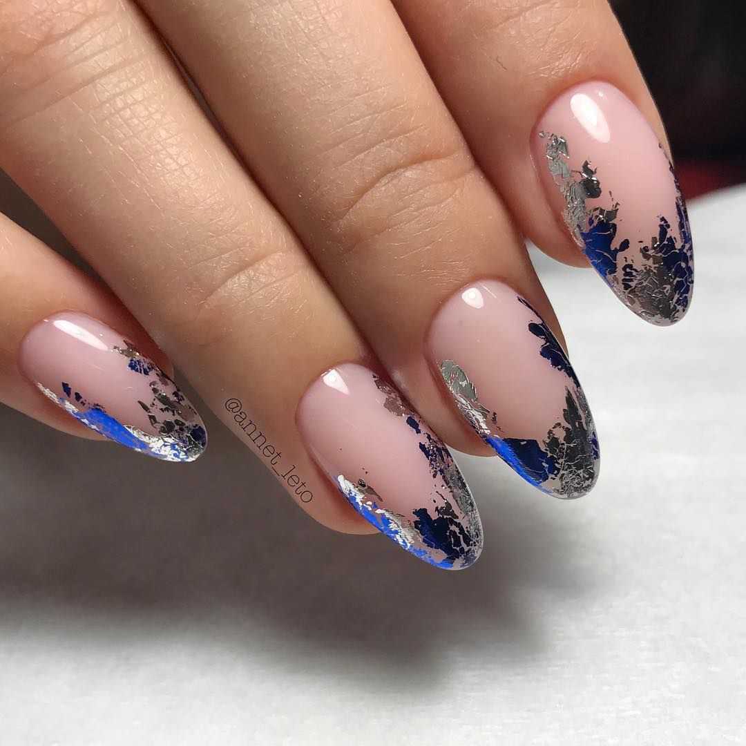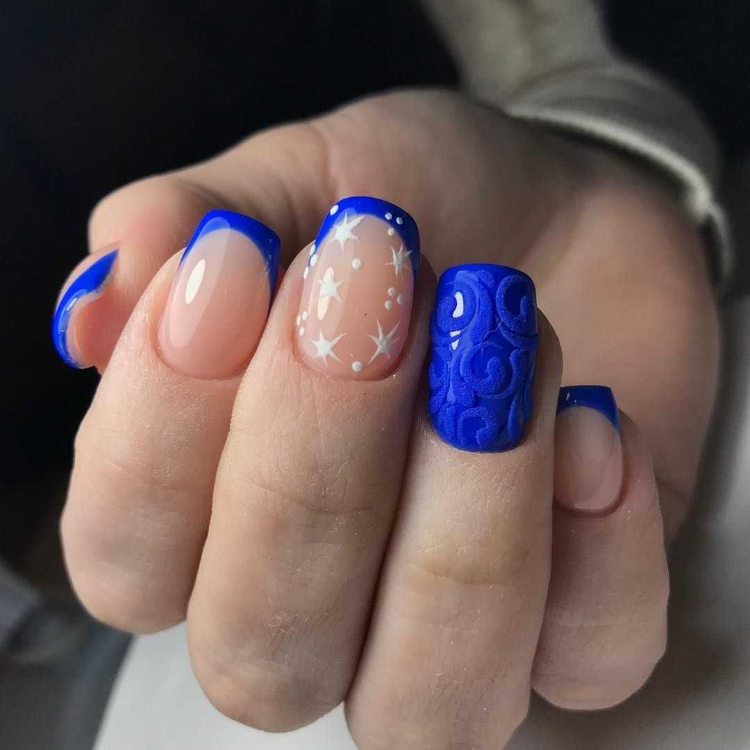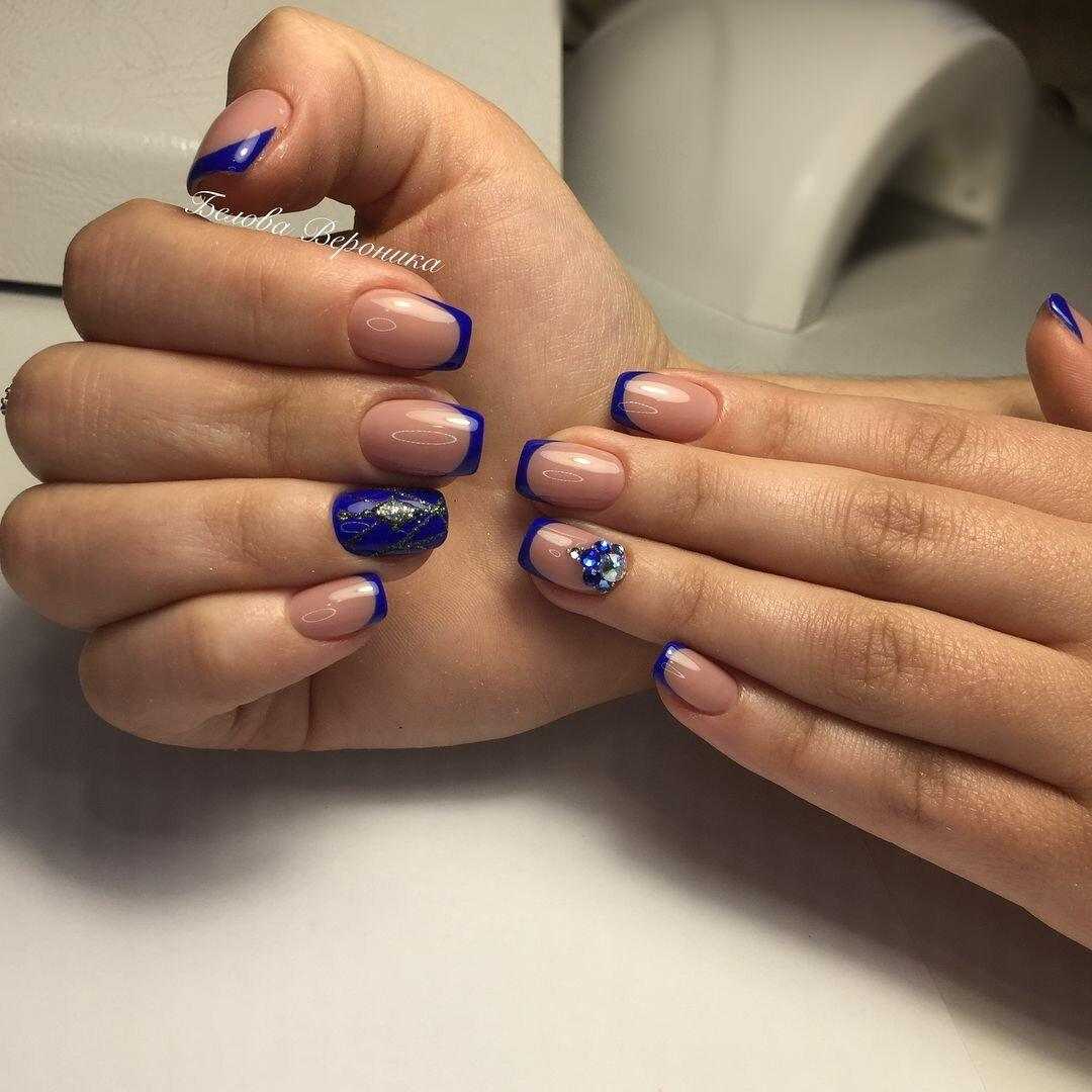 Втирка является одной из интересных техник декорирования ногтей. С использованием втирки маникюр приобретает невероятный лоск и шик. Это сверкающий дизайн, от которого невозможно оторвать взгляд. Сочетание синего цвета и втирки очень гармонично. Синий французский маникюр великолепно смотрится, если его украсить зеркальным порошком. Частички кристаллов наносятся с помощью кисточки и втираются в пластину. Такой декор маникюра подойдет для роскошных и ярких образов. Популярные и модные втирки в синем френче – это голубая и металлическая синяя, жемчужная, радужная и «Единорог». Для новогоднего дизайна идеально подойдет втирка «Космос». Для придания перламутрового эффекта мастера нейл-дизайна выбирают прозрачную втирку. А для праздничного френча идеальными будут втирки «жук» и призма.