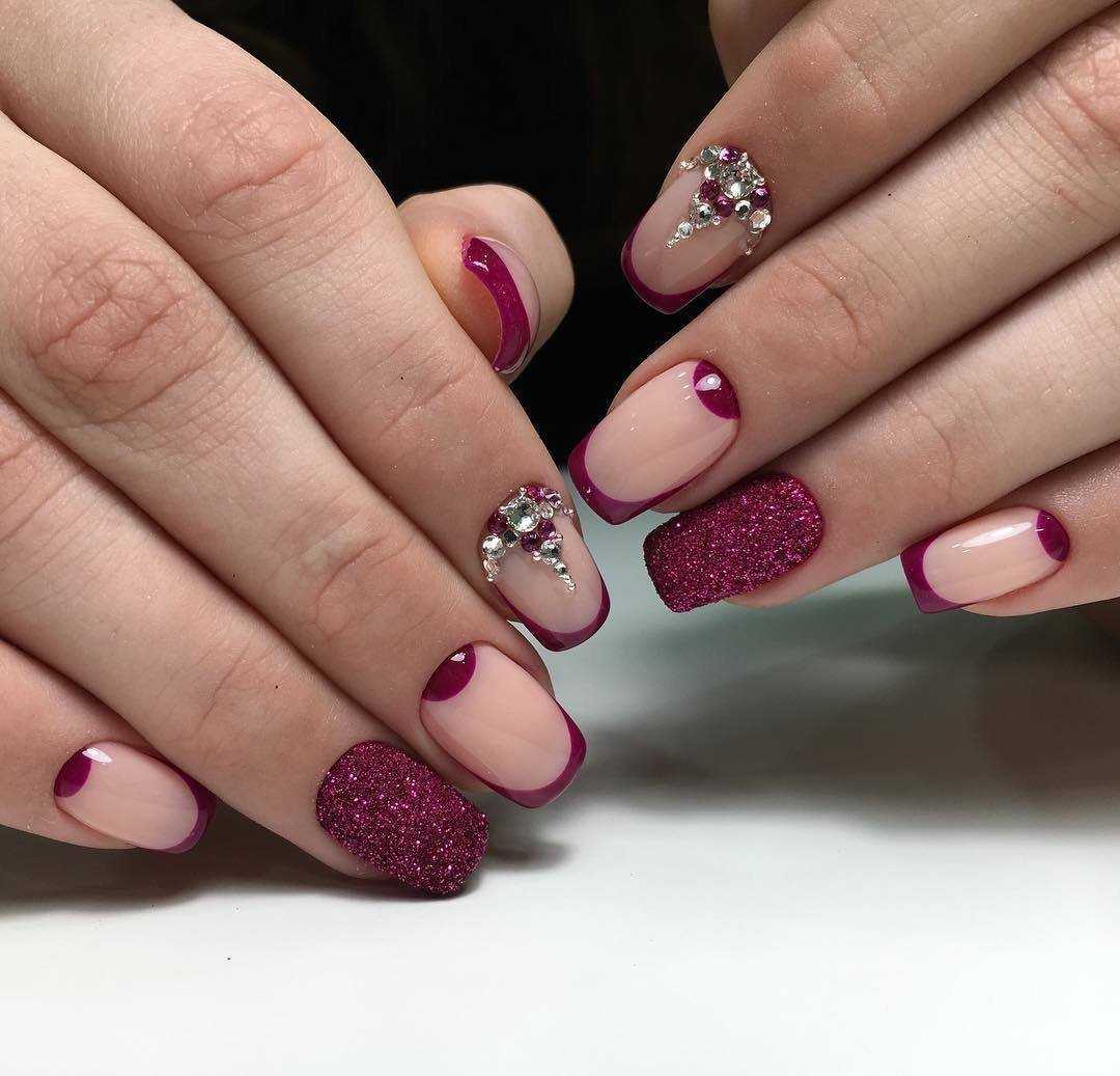 Фиолетовый френч сам по себе очень привлекателен и изящен. Но это не мешает дополнять его при помощи других цветов и оттенков. Самым распространенным и актуальным решением станет комбинирование с классическим черным или белым цветом. Также можно удачно скомбинировать бордовый френч с бежевым, сливочным, молочным тоном. Если хочется более яркого дизайна, выбирайте фуксию, сиреневый, желтый или голубой цвет. Чтоб превратить свой маникюр в нежный дизайн, остановитесь на светло-розовом, мятном или бирюзовом цвете. Можно выбрать любой вариант из предложенных цветов для сочетаний, главное не забывайте, что в качестве основного тона выступает фиолетовый цвет.